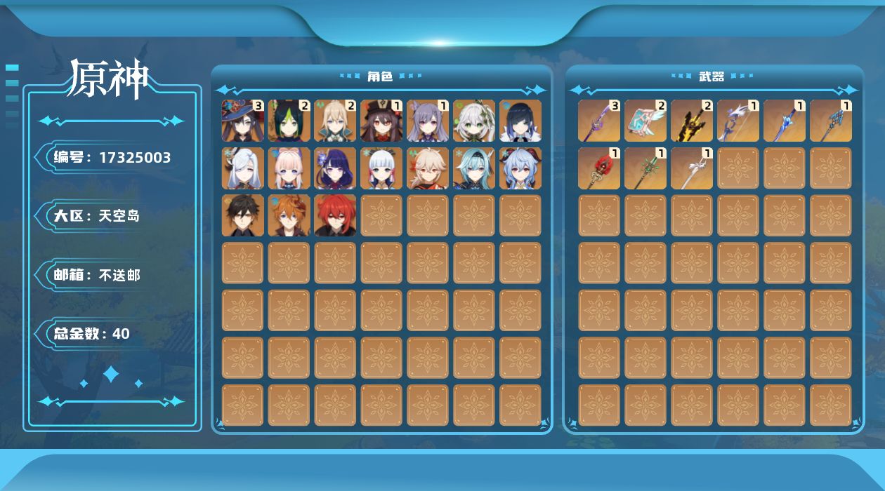 0命纳西妲,2命提纳里,0命夜兰,0命申鹤,0命优菈,0命雷电将军,0命枫原万叶,0命神里绫华,0命钟离,1命胡桃,0命甘雨,0命达达利亚,0命珊瑚宫心海,1命刻晴,2命琴,3命莫娜,0命迪卢克,精1若水,精1波乱月白经津,精1息灾,精3薙草之稻光,精2无工之剑,精1护摩之杖,精1和璞鸢,精2天空之卷,精1风鹰剑