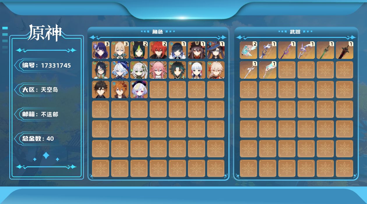 0命闲云,0命芙宁娜,0命纳西妲,2命提纳里,1命夜兰,0命八重神子,3命雷电将军,0命枫原万叶,0命神里绫华,0命钟离,1命胡桃,0命魈,0命达达利亚,0命七七,3命琴,1命莫娜,2命迪卢克,精1若水,精1薙草之稻光,精1磐岩结绿,精1天空之翼,精1阿莫斯之弓,精2天空之卷,精1风鹰剑,精1狼的末路