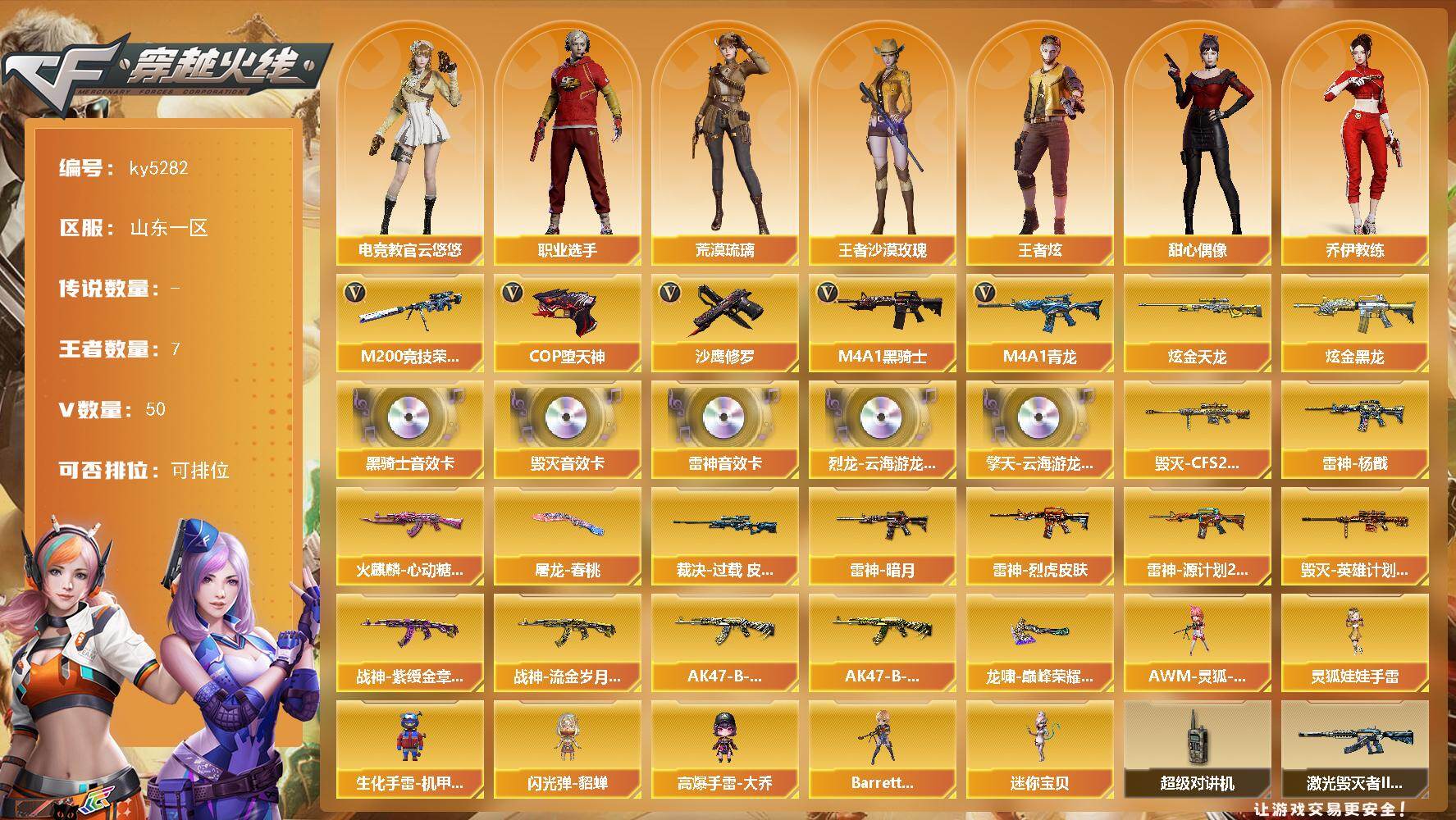 [17336368]山东一区-50V-7王者-2炫金 【热门武器】:M4A1-青龙,M200-竞技荣光,M4A1-黑骑士,COP-堕天神,沙鹰-修罗 【王者炫金武器】:炫金黑龙,炫金天龙 【音效卡】:烈龙-云海游龙音效卡,擎天-云海游龙音效卡,M4A1-雷神音效卡,M4A1-黑骑士音效卡,Barrett-毁灭音效卡 【皮肤】:裁决-过载 皮肤,雷神-暗月,雷神-杨戬,雷神-烈虎皮肤,雷神-源计划2.0专属 皮肤,火麒麟-心动糖果,毁灭-CFS2020,毁灭-英雄计划 皮肤,战神-紫绶金章皮肤,战神-流金岁月皮肤,AK47-B-常胜将军-刘备,AK47-B-常胜将军-孙权*2,屠龙-春桃 皮肤,龙啸-巅峰荣耀 皮肤 【角色】:电竞教官-云悠悠,荒漠琉璃,王者炫,王者沙漠玫瑰,乔伊教练,云海玲珑,暗夜-X,北极狐-X,风暴女,嘉年华灵狐,兰-新年限定,灵狐者-X,麻雀,曼陀罗-X,潘多拉-X,潘多拉-甜心教官,斯沃特-X,甜心偶像,雪莉杨,职业选手 【人偶武器】:迷你宝贝,Barrett-云海玲珑,AWM-灵狐-15周年嘉年华,生化手雷-机甲核心,闪光弹-貂蝉,高爆手雷-大乔,灵狐娃娃手雷 【暴走生化】:超级对讲机 【挑战大师】:激光毁灭者III-白马银枪 【英雄级武器】:AK47-火麒麟*2,M4A1-黑龙,M4A1-雷神,M4A1-黑骑士,M4A1-青龙,无影-神兵利器,黑武士-锦绣游龙,烈火-动感闪耀,王者之势-觉醒版,黑骑士-海王,AK47-B-常胜将军,M4A1-雷霆王者-觉醒版,Barrett-毁灭,M200-竞技荣光,烈龙-云海游龙,沙鹰-修罗,COP-堕天神,柯尔特-竞技荣光*2,天神-动感闪耀,屠龙,擎天-竞技荣光*2,屠龙-动感闪耀,擎天-云海游龙,王者之啸-觉醒版,王者之击-觉醒版*3,高爆手雷-竞技荣光*3,手雷-动感闪耀,手雷-云海游龙,闪光弹-幻灵,闪光弹-竞技荣光*3,闪光弹-神工天巧,烟雾弹-竞技荣光*3,烟雾弹-神工天巧,烟雾弹-雷霆王者-觉醒版,M4A1-赤狱骑士 【道具】:CFS限定背包,云山科技背包,云海游龙炫彩背包,全能枪王背包,炫彩背包,虎牙炫彩背包,超级背包,女皇终结者-魔龙之吻,救世主-黑桃战神,绿色巨人,灵魂忍者,迷雾幽灵,夺命之镰,防化服*3,金色流光-枪王排位*2,星辰流光-枪王排位,枪王排位28赛季金色流光,枪王排位29赛季金色流光