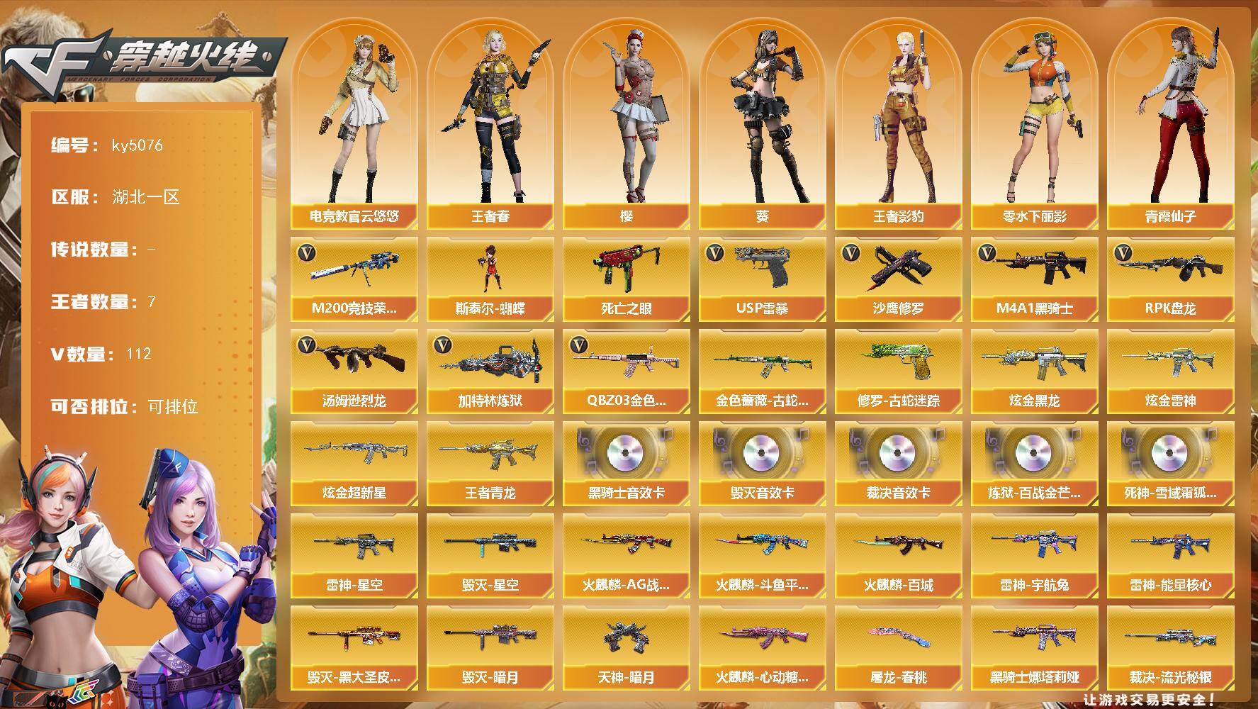 [17340443]湖北一区-112V-7王者-3炫金 【传说角色】:传说星骇 【热门武器】:QBZ03-金色蔷薇,金色蔷薇-古蛇迷踪,修罗-古蛇迷踪,M200-竞技荣光,死亡之眼,M4A1-黑骑士*2,汤姆逊-烈龙*5,RPK-盘龙*3,加特林-炼狱,斯泰尔-蝴蝶,USP-雷暴*2,沙鹰-修罗*5 【王者炫金武器】:王者青龙,炫金黑龙,炫金雷神,炫金超新星 【音效卡】:M4A1-黑骑士音效卡,Barrett-毁灭音效卡,AWM-裁决音效卡,炼狱-百战金芒-庆典舞曲音效卡,死神-雪域霜狐-怀旧音效卡 【皮肤】:幻神-电竞之星 皮肤,金色蔷薇-电竞之星 皮肤,裁决-流光秘银,AWM-裁决-凤灵皮肤,裁决-羽掣 皮肤,雷神-暗月,雷神-能量核心*2,雷神-星空,雷神-宇航兔皮肤,雷神-维纳斯皮肤,雷神-源计划2.0专属 皮肤,雷神-诺拉 皮肤,M4A1-再燃火线,雷神-神秘按键 皮肤,火麒麟-AG战队皮肤,火麒麟-斗鱼平台皮肤,火麒麟-百城*2,火麒麟-心动糖果,毁灭-暗月,毁灭-星空,毁灭-黑大圣皮肤,毁灭-虹光风暴 皮肤,毁灭-英雄计划 皮肤,M4A1-千变-孔明皮肤*2,黑龙-能量核心,黑龙-暗月,M4A1-黑骑士-娜塔莉娅 皮肤,无影-能量核心,死神-秘银*2,战神-粉色甜心皮肤,战神-紫绶金章皮肤*4,战神-流金岁月皮肤*3,炼狱-玩具枪皮肤,炼狱-月 皮肤,修罗-能量核心,天神-暗月*3,天神-宇航兔皮肤,屠龙-春桃 皮肤*2,屠龙-惊鸿 皮肤,轻型军用手斧-再燃火线,龙啸-青青莓果 皮肤,麒麟刺-萌杀皮肤,麒麟刺-月皮肤 【角色】:葵,樱,电竞教官-云悠悠,战地猎狐,王者春,王者影豹,雪域霜狐,蛇隐宗,奇洋探员,乔伊教练,修道士,云海玲珑,空,北极狐-X,初恋灵狐,芳心审判者,飞虎队-X,风暴女,虎妞,嘉年华灵狐,兰-海滩派对,兰-新年限定,猎狐者-追月,零-水下丽影,灵狐-花神,灵狐者-黄金海岸,灵狐者-七夕宝贝,龙儿,龙儿-小淘气,麻雀,曼陀罗-礼服,玫瑰花神,萌儿,娜塔莉娅,潘多拉-X,潘多拉-甜心教官,潜龙队-X,青霞仙子,赛斯-X,蛇姬,斯沃特-X,铁骑荣耀,兔囡囡,维纳斯,新娜塔莎,樱-战斗天使,影武者-X,游珑儿,智影 【人偶武器】:斯泰尔-蝴蝶,AWM-灵狐-15周年嘉年华*2,COP-旗袍,迷你深渊冰龙,迷你牛魔王,迷你波特博士,夺魂,迷你牛牛,迷你生化手