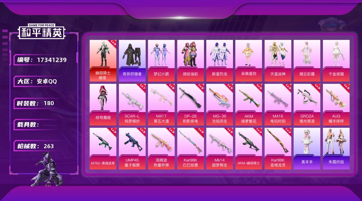 [17341239]安卓 手Q-1神装-8粉装-16特效枪-0载具-6粉色飞行器-91864热力值-15王牌印记-180套装-263枪皮 【红色神装等级】:幽焰骑士-维塔(四级) 【红色角色神装】:幽焰骑士-维塔 【热门品类】:粉装-梦幻火箭,粉装-缤纷油彩,套装-浪漫天命,套装-奇异狩猎者,套装-龟仙人,套装-暗影哥特,角色-Mark.06,角色-六号稻草人,熔岩游骑兵连帽夹克 【粉色套装】:粉装-梦幻火箭,粉装-缤纷油彩,粉装-新星烈龙,角色-呆萌星弥,粉装-天星战神,角色-烟云彩露,角色-千金淑猫,角色-绯穹魔姬 【粉色枪皮等级】:AKM-绿萝繁花(五级),AKM-幽焰骑士(三级),SCAR-L-纯梦嫁纱(七级),M416-电玩时刻(五级),GROZA-镜光银凌(五级),AUG-暖羊咩咩(五级),M762-青锋波束(五级),UMP45-量子极限(五级),汤姆逊-热量炸弹(五级),Kar98K-巳巳如意(五级),Kar98K-圣域龙灵(三级),Mk14-甜梦熊击(五级),Mk14-福马献瑞(三级),M417-第五大道(六级),DP-28-豹影疾电(五级),MG-36-沧焰双生(五级) 【粉色载具】:僚机-圣域龙宝 【粉色枪皮】:AKM-绿萝繁花,AKM-幽焰骑士,SCAR-L-纯梦嫁纱,M416-电玩时刻,GROZA-镜光银凌,AUG-暖羊咩咩,M762-青锋波束,UMP45-量子极限,汤姆逊-热量炸弹,Kar98K-巳巳如意,Kar98K-圣域龙灵,Mk14-甜梦熊击,Mk14-福马献瑞,M417-第五大道,DP-28-豹影疾电,MG-36-沧焰双生 【粉色飞行器】:炫彩糖果飞行器,BEARBRICK飞行器,幽焰列车飞行器,圣域金龙飞行器,雀灵庇佑飞行器 【粉色降落伞】:梦幻火箭降落伞,暗夜鎏金降落伞,第五大道降落伞,炫光之旅降落伞,龙行天下降落伞,圣堂之誓降落伞,精灵梦叶罗丽降落伞,创世·救赎降落伞,未来领航者降落伞,幽焰骑士降落伞,千金淑猫降落伞,晶梦幻蝶降落伞,圣域龙灵降落伞,幻彩电音降落伞,荧海星豚降落伞,魔童闹海 哪吒降落伞,异瞳寒姬降落伞,极意拳锋降落伞,炫彩糖果降落伞 【稀有套装】:套装-龟仙人,套装-巳巳如意,套装-雪国风尚,套装-炫彩糖果,套装-雏菊兔兔,套装-萝兰蝴蝶,套装-小熊娃娃,套装-糖糖葫芦,套装-青团波波,套装-棉花软糖,角色-都市丽猫,角色-摩登