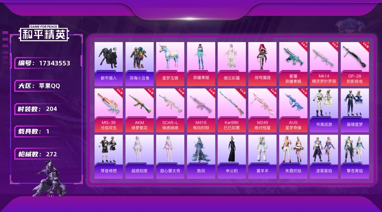 [17343553]苹果 手Q-3粉装-13特效枪-1载具-3粉色飞行器-82504热力值-19王牌印记-204套装-272枪皮