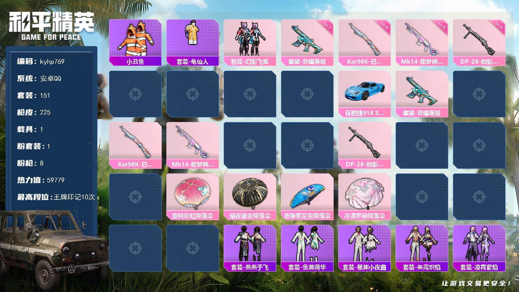 [17343599]安卓 手Q-1粉装-8特效枪-1载具-1粉色飞行器-59779热力值-10王牌印记-151套装-225枪皮
