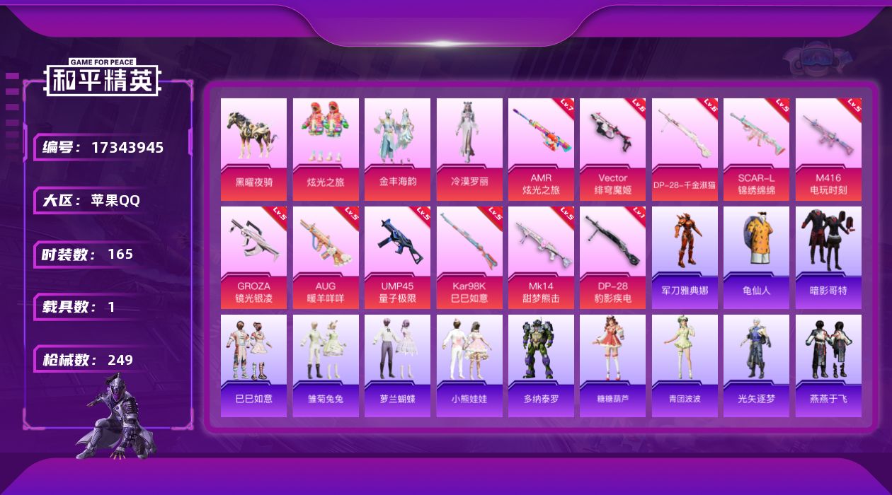 [17343945]苹果 手Q-3粉装-11特效枪-1载具-3粉色飞行器-71212热力值-18王牌印记-165套装-249枪皮