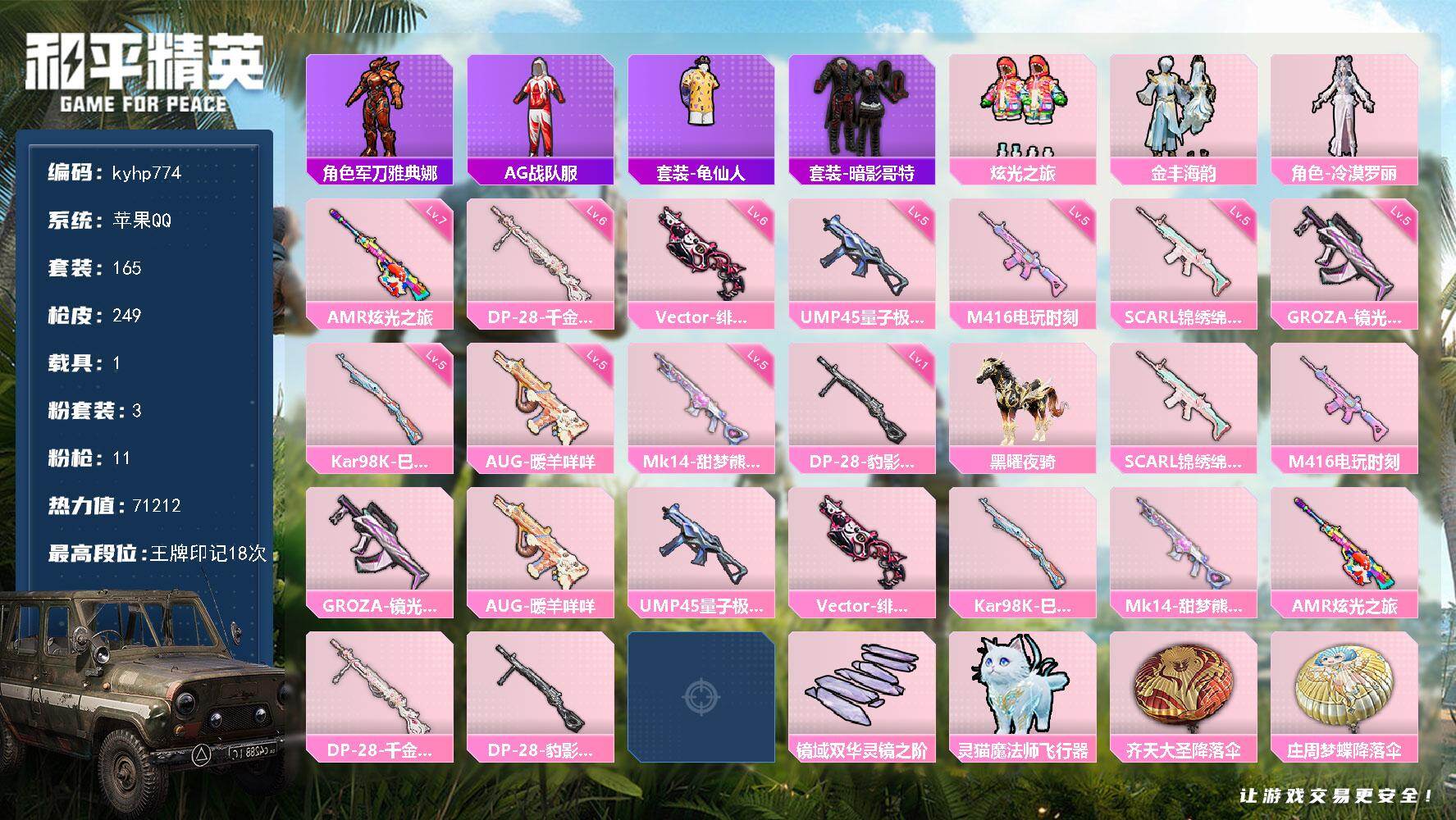 [17343945]苹果 手Q-3粉装-11特效枪-1载具-3粉色飞行器-71212热力值-18王牌印记-165套装-249枪皮 【热门品类】:角色-军刀雅典娜,套装-AG战队服,套装-龟仙人,套装-暗影哥特 【粉色套装】:粉装-炫光之旅,粉装-金丰海韵,角色-冷漠罗丽 【粉色枪皮等级】:SCAR-L-锦绣绵绵(五级),M416-电玩时刻(五级),GROZA-镜光银凌(五级),AUG-暖羊咩咩(五级),UMP45-量子极限(五级),Vector-绯穹魔姬(六级),Kar98K-巳巳如意(五级),Mk14-甜梦熊击(五级),AMR-炫光之旅(七级),DP-28-千金淑猫(六级),DP-28-豹影疾电(一级) 【粉色载具】:黑曜夜骑 【粉色枪皮】:SCAR-L-锦绣绵绵,M416-电玩时刻,GROZA-镜光银凌,AUG-暖羊咩咩,UMP45-量子极限,Vector-绯穹魔姬,Kar98K-巳巳如意,Mk14-甜梦熊击,AMR-炫光之旅,DP-28-千金淑猫,DP-28-豹影疾电 【粉色飞行器】:祥瑞起舞飞行器,镜域双华-灵镜之阶,灵猫魔法师飞行器 【粉色降落伞】:齐天大圣降落伞,庄周梦蝶降落伞,星夜魔法师降落伞,闪光银龙降落伞,环太平洋降落伞,海螺星光降落伞,炫光之旅降落伞,莲影清波降落伞,江南烟雨降落伞,雪月幻音降落伞,幻彩电音降落伞,灵猫魔法师降落伞 【稀有套装】:套装-龟仙人,套装-巳巳如意,套装-雏菊兔兔,套装-萝兰蝴蝶,套装-小熊娃娃,角色-多纳泰罗,套装-糖糖葫芦,套装-青团波波,角色-光矢逐梦,套装-燕燕于飞,套装-鱼渊荷华,套装-风舞幻音,套装-粉恋花,套装-紫幽梦,套装-蓝冰羽,套装-云朵鹅,套装-雪绒豹 【稀有枪皮】:AKM-墨染幽兰,AKM-夜灯,AKM-环太平洋,AKM-破晓战魂,AKM-萌趣颜团子,AKM-虎虎生威,AKM-霓虹街区,AKM-龙的传人,AKM-灵猫魔法师,AKM-棋盘冕主,M16A4-幻世战舞者,M16A4-红色方程式,M16A4-蓝色火焰,SCAR-L-炫彩节奏,SCAR-L-玉兔迎春,SCAR-L-碧影闪光,SCAR-L-红色方程式,SCAR-L-黄金龙骨,M416-夜灯,M416-暗夜行者,M416-糯团青竹,M416-红色方程式,M416-绯红前夜,M416-蓝色火焰,GROZA-彩虹符号,GROZA-懵萌河马,GROZA-田园牧歌,AU