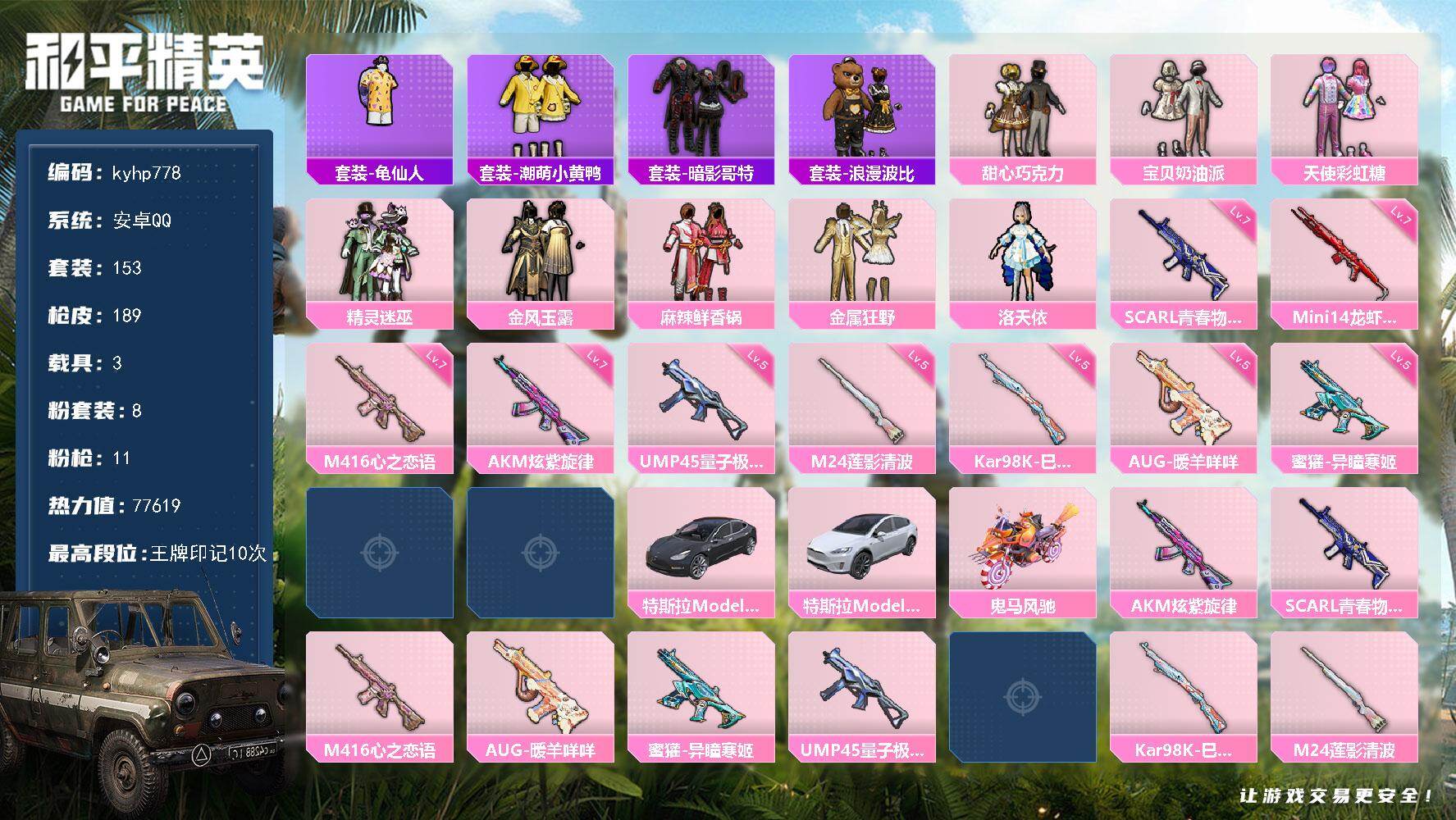 [17344166]安卓 手Q-8粉装-11特效枪-3载具-4粉色飞行器-77619热力值-10王牌印记-153套装-189枪皮 【热门品类】:套装-龟仙人,套装-潮萌小黄鸭,套装-暗影哥特,套装-浪漫波比 【粉色套装】:粉装-甜心巧克力,粉装-宝贝奶油派,粉装-天使彩虹糖,粉装-精灵迷巫,粉装-金风玉露,粉装-麻辣鲜香锅,粉装-金属狂野,角色-洛天依 【粉色枪皮等级】:AKM-炫紫旋律(七级),SCAR-L-青春物语(七级),M416-心之恋语(七级),AUG-暖羊咩咩(五级),蜜獾-异瞳寒姬(五级),UMP45-量子极限(五级),AKS-74U-森灵之息(五级),Kar98K-巳巳如意(五级),M24-莲影清波(五级),Mini14-龙虾霸霸(七级),Mk14-福马献瑞(五级) 【粉色载具】:特斯拉Model 3(冷光银),特斯拉Model X(珍珠白),鬼马风驰 【粉色枪皮】:AKM-炫紫旋律,SCAR-L-青春物语,M416-心之恋语,AUG-暖羊咩咩,蜜獾-异瞳寒姬,UMP45-量子极限,AKS-74U-森灵之息,Kar98K-巳巳如意,M24-莲影清波,Mini14-龙虾霸霸,Mk14-福马献瑞 【粉色飞行器】:深海曼妙飞行器,精灵迷巫飞行器,炫紫旋律飞行器,心之恋语飞行翼 【粉色降落伞】:深海曼妙降落伞,甜心宝贝降落伞,精灵迷巫降落伞,华贵君王降落伞,星之信仰降落伞,金风玉露降落伞,龙虾霸霸降落伞,炫紫旋律降落伞,神秘黑猫降落伞,甜蜜誓约降落伞,花间之火降落伞,潮汐统领降落伞,莲影清波降落伞,异瞳寒姬降落伞,炫彩糖果降落伞 【稀有套装】:套装-龟仙人,套装-巳巳如意,套装-雪国风尚,角色-月烬之祷 【稀有枪皮】:AKM-四圣焕新,AKM-缤纷海域,AKM-霓虹街区,AKM-龙的传人,M16A4-九霄,M16A4-莲影清波,M16A4-魔法学院,M16A4-龙虾霸霸,SCAR-L-炫彩节奏,SCAR-L-红色方程式,SCAR-L-金风玉露,SCAR-L-龙宫之主,M416-仓鼠灰灰,M416-潮汐统领,M416-神秘黑猫,M416-魔法学院,GROZA-黑色刀锋,AUG-魔法学院,QBZ-九霄,QBZ-原初圣火,QBZ-洛神天依,QBZ-神秘黑猫,QBZ-诡娃娃,M762-拳皇97,M762-深海曼妙,M762-潮萌小黄鸭,M762-牛气冲天,M762-瑞龙福将,M762