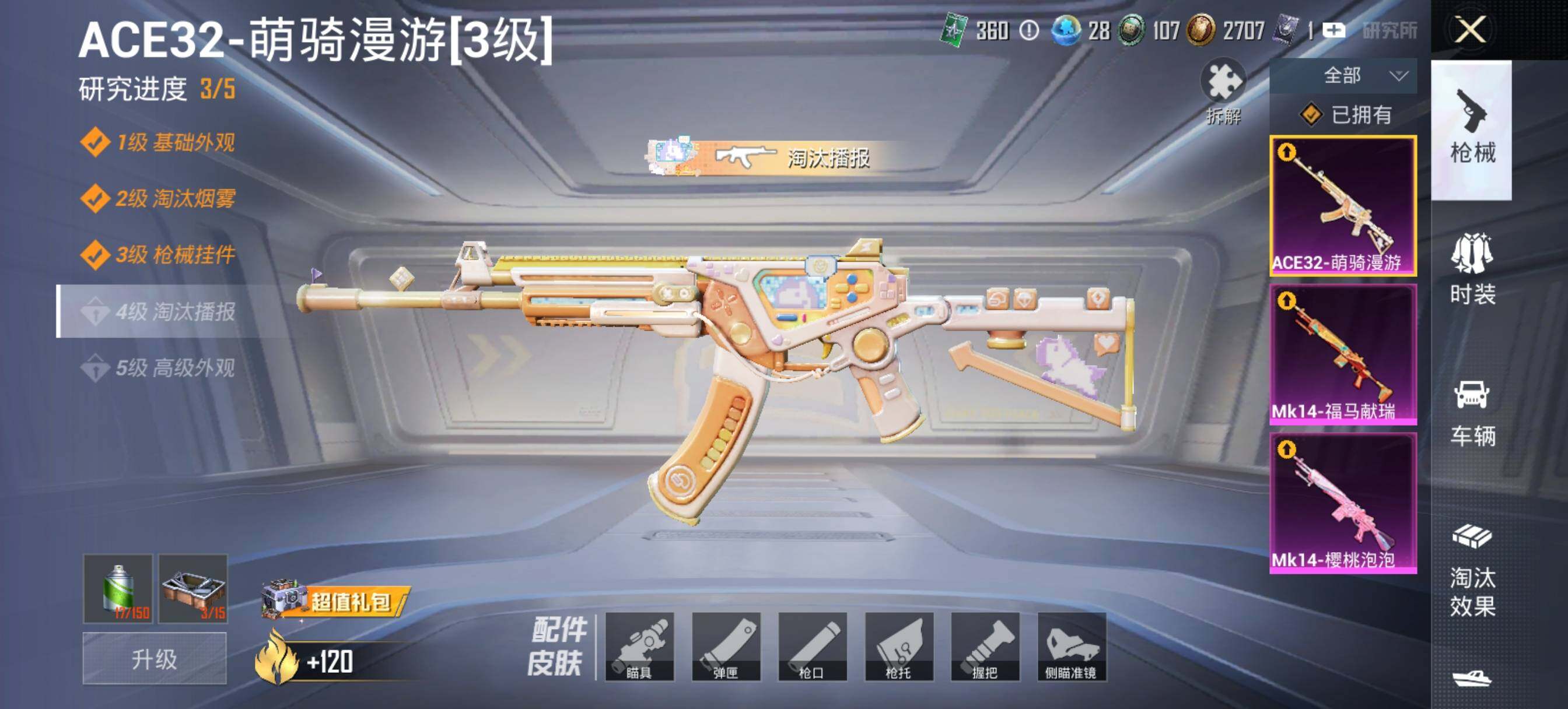 【粉色枪皮等级】:ACE32-萌骑漫游(三级),Mk14-樱桃泡泡(五级),Mk14-福马献瑞(五级)