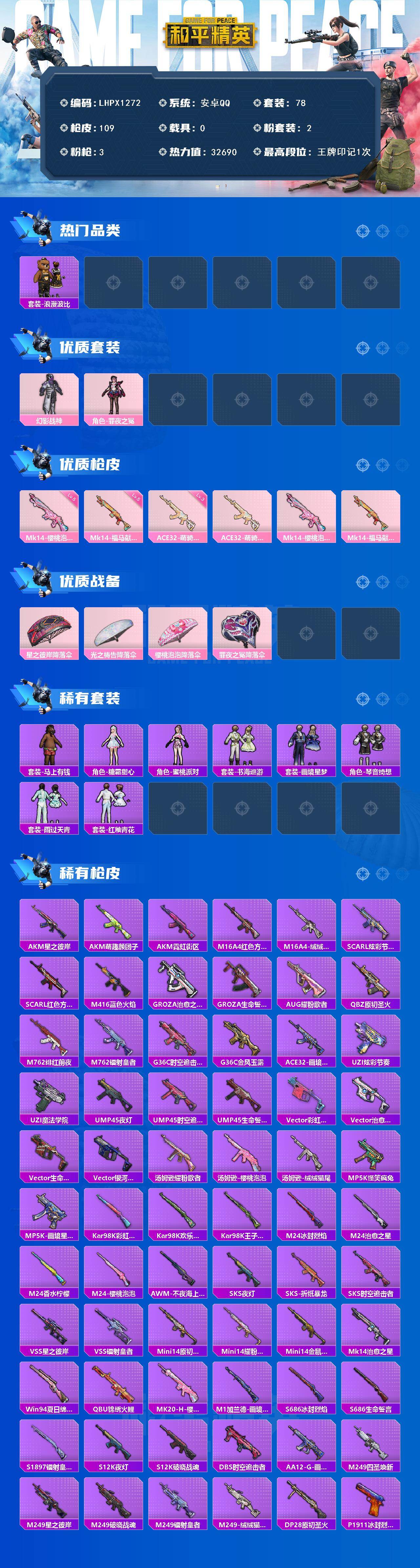 [17345220]可二次【特价出售/店主推荐】安卓 手Q-2粉装-3特效枪-0载具-0粉色飞行器-32690热力值-1王牌印记-78套装-109枪皮 【热门品类】:套装-浪漫波比 【粉色套装】:粉装-幻影战神,角色-罪夜之冕 【粉色枪皮等级】:ACE32-萌骑漫游(三级),Mk14-樱桃泡泡(五级),Mk14-福马献瑞(五级) 【粉色枪皮】:ACE32-萌骑漫游,Mk14-樱桃泡泡,Mk14-福马献瑞 【粉色降落伞】:星之彼岸降落伞,光之祷告降落伞,樱桃泡泡降落伞,罪夜之冕降落伞 【稀有套装】:套装-马上有钱,角色-糖霜甜心,角色-蜜桃派对,套装-书海巡游,套装-画境星梦,套装-琴音绮想,套装-雨过天青,套装-红釉青花 【稀有枪皮】:AKM-星之彼岸,AKM-萌趣颜团子,AKM-霓虹街区,M16A4-红色方程式,M16A4-绒绒猫尾,SCAR-L-炫彩节奏,SCAR-L-红色方程式,M416-蓝色火焰,GROZA-治愈之星,GROZA-生命誓言,AUG-耀粉歌者,QBZ-原初圣火,M762-绯红前夜,M762-镭射皇者,G36C-时空追击者,G36C-金风玉露,ACE32-画境星梦,UZI-炫彩节奏,UZI-魔法学院,UMP45-夜灯,UMP45-时空追击者,UMP45-生命誓言,Vector-彩虹符号,Vector-治愈之星,Vector-生命誓言,Vector-银河战甲,汤姆逊-耀粉歌者,汤姆逊-绒绒猫尾,汤姆逊-樱桃泡泡,MP5K-怪笑疯兔,MP5K-画境星梦,Kar98K-彩虹符号,Kar98K-欢乐麻酱,Kar98K-王子的夏天,M24-治愈之星,M24-香水柠檬,M24-冰封烈焰,M24-樱桃泡泡,AWM-不夜海上花,SKS-夜灯,SKS-折纸暴龙,SKS-时空追击者,VSS-星之彼岸,VSS-镭射皇者,Mini14-原初圣火,Mini14-耀粉歌者,Mini14-金鼠迎春,Mk14-治愈之星,Win94-夏日绵绵冰,QBU-锦绣火鲤,MK20-H-樱桃泡泡,M1加兰德-画境星梦,S686-冰封烈焰,S686-生命誓言,S1897-镭射皇者,S12K-破晓战魂,S12K-夜灯,DBS-时空追击者,AA12-G-画境星梦,M249-四圣焕新,M249-星之彼岸,M249-破晓战魂,M249-镭射皇者,M249-绒绒猫尾,DP-28-原初圣火,P1911-冰封烈焰,P18C