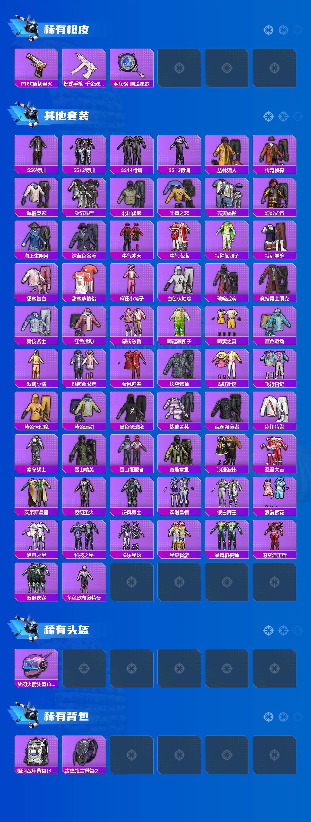 【稀有枪皮】:AKM-星之彼岸,AKM-萌趣颜团子,AKM-霓虹街区,M16A4-红色方程式,M16A4-绒绒猫尾,SCAR-L-炫彩节奏,SCAR-L-红色方程式,M416-蓝色火焰,GROZA-治愈之星,GROZA-生命誓言,AUG-耀粉歌者,QBZ-原初圣火,M762-绯红前夜,M762-镭射皇者,G36C-时空追击者,G36C-金风玉露,ACE32-画境星梦,UZI-炫彩节奏,UZI-魔法学院,UMP45-夜灯,UMP45-时空追击者,UMP45-生命誓言,Vector-彩虹符号,Vector-治愈之星,Vector-生命誓言,Vector-银河战甲,汤姆逊-耀粉歌者,汤姆逊-绒绒猫尾,汤姆逊-樱桃泡泡,MP5K-怪笑疯兔,MP5K-画境星梦,Kar98K-彩虹符号,Kar98K-欢乐麻酱,Kar98K-王子的夏天,M24-治愈之星,M24-香水柠檬,M24-冰封烈焰,M24-樱桃泡泡,AWM-不夜海上花,SKS-夜灯,SKS-折纸暴龙,SKS-时空追击者,VSS-星之彼岸,VSS-镭射皇者,Mini14-原初圣火,Mini14-耀粉歌者,Mini14-金鼠迎春,Mk14-治愈之星,Win94-夏日绵绵冰,QBU-锦绣火鲤,MK20-H-樱桃泡泡,M1加兰德-画境星梦,S686-冰封烈焰,S686-生命誓言,S1897-镭射皇者,S12K-破晓战魂,S12K-夜灯,DBS-时空追击者,AA12-G-画境星梦,M249-四圣焕新,M249-星之彼岸,M249-破晓战魂,M249-镭射皇者,M249-绒绒猫尾,DP-28-原初圣火,P1911-冰封烈焰,P18C