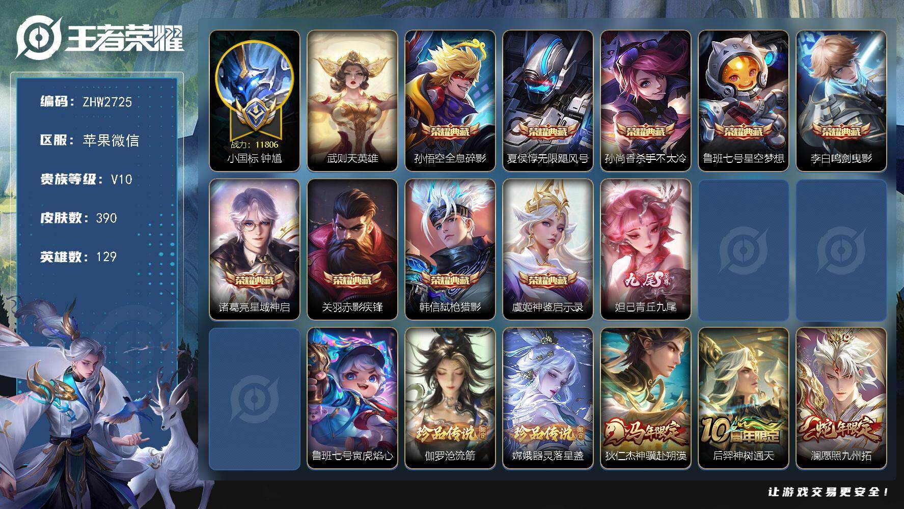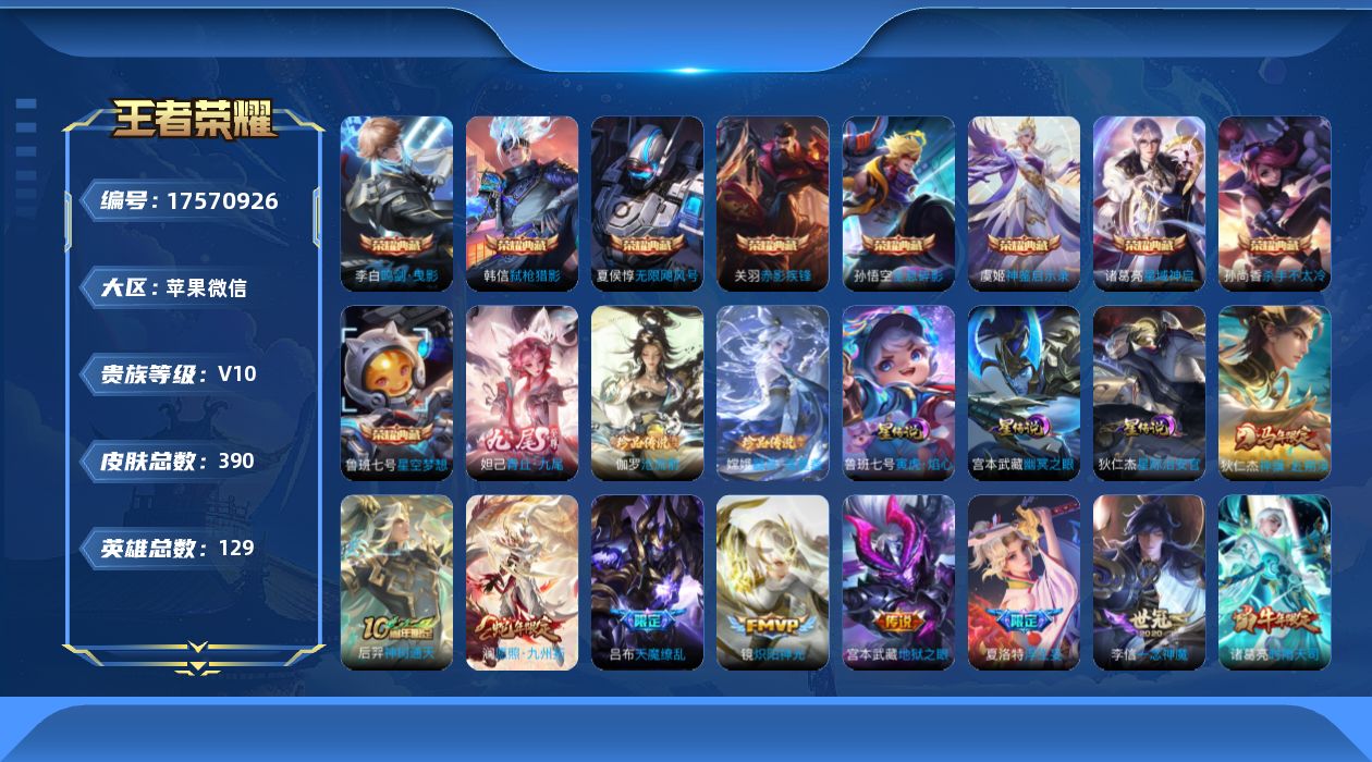 [17570926]苹果WX-V10-最强王者段位-129英雄-390皮肤-9典藏皮肤-1典藏英雄-1无双-2珍品传说-33传说-112史诗