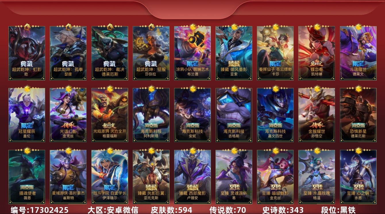 [17302425]实名: 可修改 段位: 黑铁 皮肤数: 594 典藏皮: 超武乾坤:孤拳,超武乾坤:虹影,超武乾坤:裁决,超武乾坤:征服 神话皮: 海克斯牛头,海克斯皇子,恐惧新星诺手,蝶恋春女警,海克斯炸弹人,光谱幻影金克丝,冠星耀辰盖伦,战斗学院EZ白金学长,至臻喵喵魅影金克丝,摄魂使者薇恩,斗魂耀世德莱文,海克斯安妮,星域游侠卡牌圣时豪杰,至臻灵魂莲华剑圣,至臻水晶格温,至臻心之钢永恩,春晖仙子苍云缥缈卡莎,火焰澎湃火力全开,臻藏光影巨翼,金猴耀世,臻藏西部魔影卢锡安,臻藏御风墨影 亚索,涂鸦小队斑斓艺术布兰德 限定皮肤: 金猴耀世,水晶玫瑰拉克丝,水晶玫瑰伊泽瑞尔,水晶玫瑰阿卡丽,涂鸦小队莎弥拉,耀星女神拉克丝 传说皮: 暗星尊,地狱之门卫士,福牛守护者女枪,灌篮高手,光明哨兵薇恩,黑夜使者亚索,K/DA ALLOUT萨勒芬妮,黎明使者锐雯,炼狱魔犬,律政大亨,女主播风女,欧米伽小队 幽灵特工,日蚀骑士蕾欧娜,水晶玫瑰阿卡丽,神龙尊者 驭风啸龙,神拳盲僧,神王盖伦,神王诺手,水晶玫瑰拉克丝,天煞劫,西部魔影卢锡安,西部天使寒冰,西部天使赛娜,星域游侠卡牌,星之守护者金克丝,星之守护者阿狸,星之守护者 辉,星之守护者 落,星之守护者 熠,星之守护者 陨,驯龙炮手,源计划:净化,源计划:联合,月蚀骑士蕾欧娜,战斗学院ez,灵魂莲华锤石,涂鸦小队莎弥拉,剪胜裁春格温,黎明使者永恩,源计划:林,源计划:泯灭,暗星女王拉克丝,耀星女神拉克丝,最终BOSS维迦,光明哨兵格雷福斯,跳跳倩影女枪,太空律动机器人,斗魂无双亚索,未来战士女警,霸天零式塞恩,星域武神贾克斯,星之守护者卡莎,灵魂莲华阿狸,灵魂莲华腕豪,心之钢凯隐,水晶玫瑰萨勒芬妮,魔女伊芙琳,源计划:毁灭,春晖神女莫甘娜,光影巨翼亚托克斯,光电璀璨泽丽,西部魔影大小姐蕾欧娜,黎明使者德莱文,战斗学院女警,斗魂觉醒 莎弥拉,淳和墨意 嘉文四世,御风墨影 亚索,花车开起来咯 墨菲特,水晶玫瑰 卡莎 亮点: 有二次!历史国服第2绝世艾希!历史国服第9蔚!历史国服第10泰坦!11.5w收藏!594皮肤4典藏24神话70传说343史诗!白龙黑龙回城!满海克斯!玄金队旗!满涂鸦小队!满水晶玫瑰!黑龙回城!套装收集:涂鸦小队兰亭墨韵 西部魔影 心心相印 龙腾华彩 春晖众神 超武乾坤 水晶玫瑰喜宴 庆典 源计划 海克斯 斗魂无双 秩序与混沌 战斗学院白金启程 黑雾侵袭 玉兔呈祥 ,超武乾坤:虹影 劫,超武乾坤:孤拳 瑟提,超武乾坤:裁决 德莱厄斯,超武乾坤:征服 莎弥拉,至臻 灵魂莲华 易,满弓镇魂 箭无虚发 韦鲁斯,涂鸦小队 斑斓艺术 布兰德,臻藏 御风墨影 亚索,臻藏 西部魔影 卢锡安,火焰澎湃 火力全开 格雷福斯,臻藏 光影巨翼 亚托克斯,春晖仙子 苍云缥缈 卡莎,至臻 心之钢 永恩,至臻 水晶玫瑰 格温,星域游侠 圣时豪杰 崔斯特,恐惧新星 德莱厄斯,海克斯科技 安妮,冠星耀辰 盖伦,斗魂耀世 德莱文,至臻 喵喵魅影 金克丝,摄魂使者 薇恩,战斗学院 白金学长 伊泽瑞尔,海克斯科技 吉格斯,光谱幻影 金克丝,海克斯科技 嘉文四世,蝶恋春 凯特琳,金猴耀世 孙悟空,海克斯科技 阿利斯塔,水晶玫瑰 卡莎,黎明使者 德莱文,魔女 伊芙琳,花车开起来咯! 墨菲特,斗魂觉醒 莎弥拉,战斗学院 凯特琳,御风墨影 亚索,淳和墨意 嘉文四世,西部魔影 大小姐 蕾欧娜,耀星女神 拉克丝,光影巨翼 亚托克斯,光电璀璨 泽丽,光明哨兵 格雷福斯,春晖神女 莫甘娜,源计划:毁灭 派克,星之守护者 熠 洛,水晶玫瑰 萨勒芬妮,心之钢 凯隐,灵