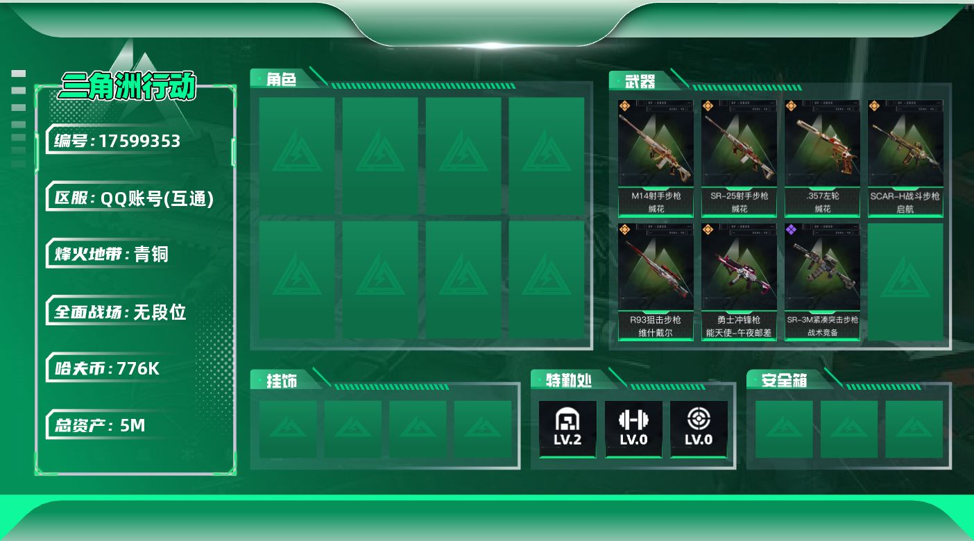 [17599353]实名: 可修改 烽火地带段位: 青铜 全面战场段位: 无段位 总资产: 5000000 哈夫币: 776000 传说武器皮肤: 勇士冲锋枪-能天使-午夜邮差,R93狙击步枪-维什戴尔,SCAR-H战斗步枪-启航,.357左轮-缄花,SR-25射手步枪-缄花,M14射手步枪-缄花 史诗武器皮肤: SR-3M紧凑突击步枪-战术竞备 载具皮肤: 轮式突击炮-荣耀 亮点: 5m总资产-776k哈伏币-8烽火等级-青铜-2战场等级-无军衔【近战皮肤】:近战-黑鹰【传说外观】:SCAR-H战斗步枪-启航,勇士冲锋枪-能天使-午夜邮差,M14射手步枪-缄花,SR-25射手步枪-缄花,R93狙击步枪-维什戴尔,.357左轮-缄花【史诗外观】:SR-3M紧凑突击步枪-战术竞备【稀有外观】:K437突击步枪-生存指令,MK47突击步枪-精英联盟【载具外观】:轮式突击炮-荣耀【挂饰】:挂饰-维什戴尔,挂饰-启程,挂饰-缄花