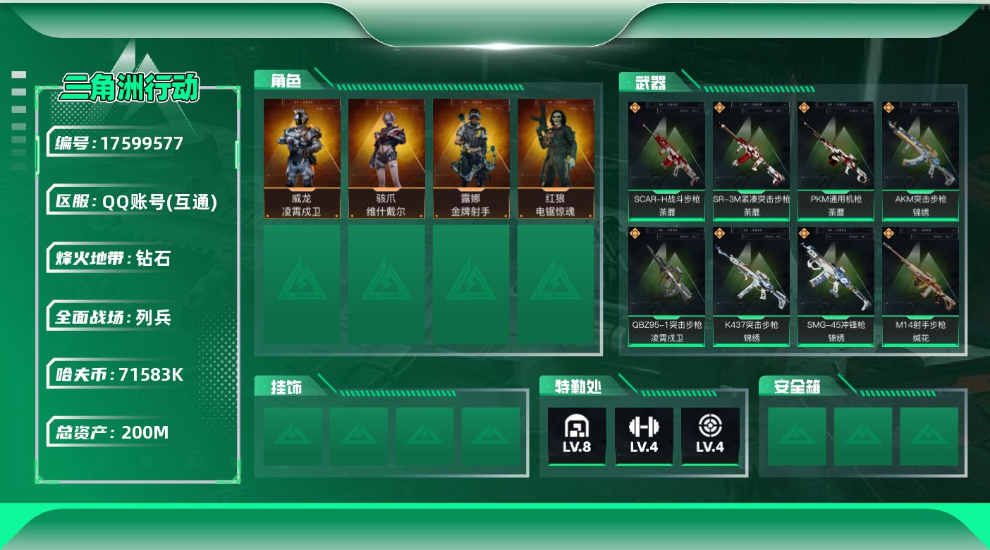 [17599577]实名: 可修改 烽火地带段位: 钻石 全面战场段位: 列兵 总资产: 200000000 哈夫币: 71583000 干员外观: 骇爪-维什戴尔,红狼-电锯惊魂,露娜-金牌射手(S7),威龙-凌霄戍卫 传说武器皮肤: R93狙击步枪-维什戴尔,SCAR-H战斗步枪-启航,KC17突击步枪-电锯惊魂,SG552突击步枪-运动员,QBZ95-1突击步枪-凌霄戍卫,SCAR-H战斗步枪-荼蘼,PKM通用机枪-荼蘼,SR-3M紧凑突击步枪-荼蘼,.357左轮-缄花,SR-25射手步枪-缄花,M14射手步枪-缄花,SMG-45冲锋枪-锦绣,K437突击步枪-锦绣,AKM突击步枪-锦绣 史诗武器皮肤: 沙漠之鹰-曙光,AUG突击步枪-蝮蛇,勇士冲锋枪-深海恐惧,M250通用机枪-囚徒,SV-98狙击步枪-囚徒,腾龙突击步枪-猎鳄行动,Vector冲锋枪-猎鳄行动,MP5冲锋枪-战术竞备,G3战斗步枪-流沙送葬,AWM狙击步枪-流沙送葬,AS Val突击步枪-百步穿杨,M700狙击步枪-百步穿杨,Vector冲锋枪-百步穿杨,M7战斗步枪-百步穿杨,M700狙击步枪-哈夫克警备,SG552突击步枪-哈夫克警备,MP5冲锋枪-竞技风,M14射手步枪-工业狂潮,MP7冲锋枪-六套之力 载具皮肤: 轮式突击炮-荣耀 亮点: 200m总资产-71583k哈伏币-60烽火等级-钻石-13战场等级-列兵【干员外观】:骇爪-维什戴尔,威龙-凌霄戍卫,红狼-电锯惊魂,露娜-金牌射手【近战皮肤】:近战-黑鹰【传说外观】:AKM突击步枪-锦绣,QBZ95-1突击步枪-凌霄戍卫,SG552突击步枪-运动员,SCAR-H战斗步枪-启航,SCAR-H战斗步枪-荼蘼,K437突击步枪-锦绣,KC17突击步枪-电锯惊魂,SMG-45冲锋枪-锦绣,SR-3M紧凑突击步枪-荼蘼,PKM通用机枪-荼蘼,M14射手步枪-缄花,SR-25射手步枪-缄花,R93狙击步枪-维什戴尔,.357左轮-缄花【史诗外观】:AUG突击步枪-蝮蛇,M7战斗步枪-百步穿杨,SG552突击步枪-哈夫克警备,G3战斗步枪-流沙送葬,AS Val突击步枪-百步穿杨,腾龙突击步枪-猎鳄行动,MP5冲锋枪-战术竞备,MP5冲锋枪-竞技风,Vector冲锋枪-猎鳄行动,Vector冲锋枪-百步穿杨,勇士冲锋枪-深海恐惧,MP7冲锋枪-六套之力,M250通用机枪-囚徒,QJB201轻机枪-炽焰,M14射手步枪-工业狂潮,SV-98狙击步枪-囚徒,M700狙击步枪-百步穿杨,M700狙击步枪-哈夫克警备,AWM狙击步枪-流沙送葬,沙漠之鹰-曙光【稀有外观】:PSG-1射手步枪-极地勘察队,M4A1突击步枪-繁盛,AKM突击步枪-肃杀,QBZ95-1突击步枪-公平竞技,ASh-12战斗步枪-繁盛,K416突击步枪-一帆风顺,M7战斗步枪-捣蛋鬼,SG552突击步枪-2026,SG552突击步枪-贴花艺术, AK-12突击步枪-马年新春,G3战斗步枪-主宰,腾龙突击步枪-冰天雪地,MK47突击步枪-冰河潜伏者,MP5冲锋枪-弄臣,MP5冲锋枪-哈夫克卫队,P90冲锋枪-黄昏,Vector冲锋枪-先锋,UZI冲锋枪-亚特兰蒂斯,野牛冲锋枪-冰河潜伏者,SMG-45冲锋枪-行动开启,SMG-45冲锋枪-幻影结构,勇士冲锋枪-主宰,勇士冲锋枪-冰天雪地,QCQ171冲锋枪-银鹭,M249轻机枪-冰天雪地,QJB201轻机枪-哈夫克卫队,Mini-14射手步枪-荣耀列队,SKS射手步枪-弄臣,PSG-1射手步枪-主宰,SV-98狙击步枪-星链科