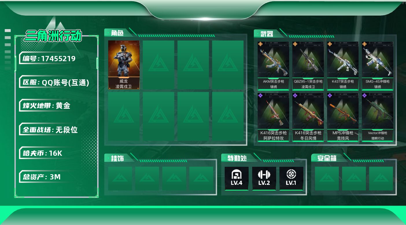 [17455219]实名: 不可修改 烽火地带段位: 黄金 全面战场段位: 无段位 总资产: 3000000 哈夫币: 16000 干员外观: 威龙-凌霄戍卫 传说武器皮肤: QBZ95-1突击步枪-凌霄戍卫,SMG-45冲锋枪-锦绣,K437突击步枪-锦绣,AKM突击步枪-锦绣 史诗武器皮肤: M700狙击步枪-竞技风,SVD狙击步枪-阿萨拉工艺,Vector冲锋枪-猎鳄行动,MP5冲锋枪-竞技风,K416突击步枪-冬日风情,K416突击步枪-阿萨拉特攻 亮点: 【特价出售/店主推荐】3m总资产-16k哈伏币-39烽火等级-黄金-1战场等级-无军衔【干员外观】:威龙-凌霄戍卫【近战皮肤】:近战-黑鹰【传说外观】:AKM突击步枪-锦绣,QBZ95-1突击步枪-凌霄戍卫,K437突击步枪-锦绣,SMG-45冲锋枪-锦绣【史诗外观】:K416突击步枪-冬日风情,K416突击步枪-阿萨拉特攻,MP5冲锋枪-竞技风,Vector冲锋枪-猎鳄行动,SVD狙击步枪-阿萨拉工艺,M700狙击步枪-竞技风【稀有外观】:AKS-74U突击步枪-休闲时光,AKM突击步枪-肃杀,SG552突击步枪-2026,K437突击步枪-生存指令,MK47突击步枪-精英联盟,UZI冲锋枪-亚特兰蒂斯,SMG-45冲锋枪-行动开启,M1014霰弹枪-幻影结构,QJB201轻机枪-哈夫克卫队,SR-25射手步枪-开拓,SV-98狙击步枪-星链科技,SV-98狙击步枪-哈夫克航天,SV-98狙击步枪-精英联盟,QSZ92G-一帆风顺【普通外观】:M4A1突击步枪-高雅黑,QBZ95-1突击步枪-高雅黑,QBZ95-1突击步枪-海浪,QBZ95-1突击步枪-海色,QBZ95-1突击步枪-2026,腾龙突击步枪-三角洲力量,K416突击步枪-几何迷彩,K416突击步枪-高雅黑,M16A4突击步枪-高雅黑,AUG突击步枪-浅蓝涂装,M7战斗步枪-红色涂装,M7战斗步枪-黑巧甜心,SG552突击步枪-海浪,SG552突击步枪-狂欢,SCAR-H战斗步枪-数码迷彩,G3战斗步枪-高雅黑,CAR-15突击步枪-狂欢,P90冲锋枪-黑巧甜心,Vector冲锋枪-几何迷彩,UZI冲锋枪-海色,UZI冲锋枪-狂欢,野牛冲锋枪-高雅黑,勇士冲锋枪-磐石,M1014霰弹枪-高雅黑,PKM通用机枪-变色龙,M249轻机枪-黄蜂,QJB201轻机枪-典雅,SR-25射手步枪-黄蜂,SR-25射手步枪-黑巧甜心,沙漠之鹰-海浪,沙漠之鹰-高雅黑,G17-2026【挂饰】:挂饰-窃风密探,挂饰-凌霄戍卫,挂饰-暗行哨兵,挂饰-聚宝盆,挂饰-锦绣,挂饰-起舞的女郎,挂饰-紧急撤离*8,挂饰-麻将*2