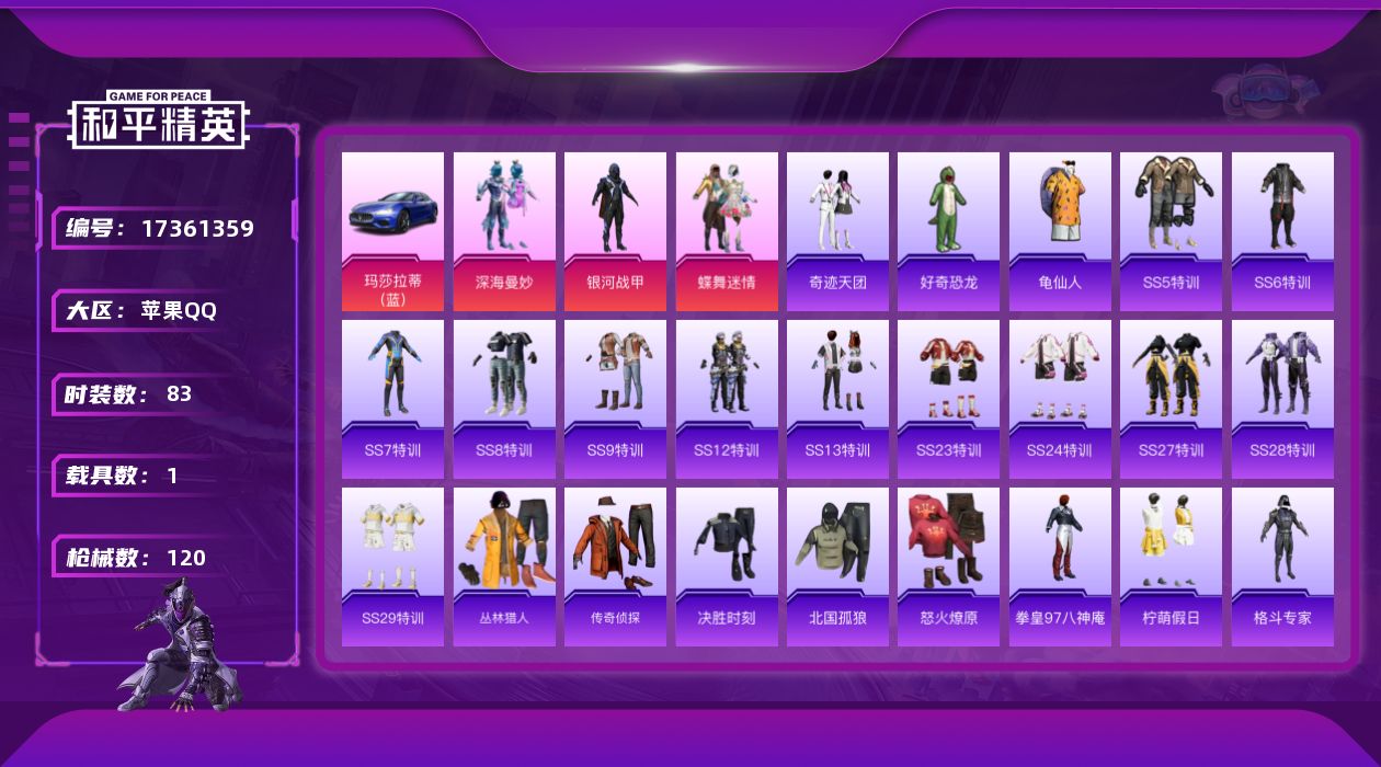 [17361359]实名: 不可修改 时装数: 83 载具数: 1 枪械数: 120 战备数: 59 热门装扮: 蝶舞迷情,深海曼妙,银河战甲,好奇恐龙,奇迹天团 载具: 玛莎拉蒂Ghibli(蓝) 亮点: 【特价出售/店主推荐】苹果 手Q-3粉装-6特效枪-1载具-1粉色飞行器-34786热力值-2王牌印记-83套装-120枪皮【热门品类】:套装-龟仙人【粉色套装】:粉装-深海曼妙,粉装-银河战甲,粉装-蝶舞迷情【粉色枪皮等级】:ACE32-萌骑漫游(四级),UMP45-萌骑冒险(一级),AKS-74U-森灵之息(三级),Mk14-福马献瑞(五级),AA12-G-萌骑幻想(一级),PKM-萌骑夺宝(一级)【粉色载具】:玛莎拉蒂Ghibli(蓝)【粉色枪皮】:ACE32-萌骑漫游,UMP45-萌骑冒险,AKS-74U-森灵之息,Mk14-福马献瑞,AA12-G-萌骑幻想,PKM-萌骑夺宝【粉色飞行器】:春暖花开飞行器【粉色降落伞】:深海曼妙降落伞,银河战甲降落伞,至尊龙雀降落伞,春暖花开降落伞,天启纪元降落伞,霁蓝缠春降落伞,辉云木星降落伞【稀有套装】:套装-龟仙人,套装-雪国风尚,套装-马上来财,套装-雨过天青,套装-红釉青花,角色-霜纹水星【稀有枪皮】:AKM-夜灯,AKM-春暖花开,AKM-破晓战魂,AKM-霓虹街区,M16A4-幻世战舞者,M16A4-红色方程式,M16A4-蓝色火焰,SCAR-L-红色方程式,SCAR-L-银河战甲,M416-夜灯,M416-红色方程式,M416-蓝色火焰,M416-魔法学院,GROZA-春暖花开,GROZA-银河战甲,GROZA-黑色刀锋,AUG-凝视深渊,AUG-天降萌叽,AUG-拳皇97,AUG-甜蜜菠萝,AUG-耀粉歌者,QBZ-神秘黑猫,QBZ-银河战甲,M762-天降萌叽,M762-拳皇97,M762-牛气冲天,G36C-雪国精灵,蜜獾-天降萌叽,UZI-炫彩节奏,UZI-红色方程式,UZI-金风玉露,UMP45-春暖花开,UMP45-荒野猎神,UMP45-蓝色火焰,Vector-彩虹符号,Vector-银河战甲,Vector-黑色刀锋,汤姆逊-勇闯险境,汤姆逊-耀粉歌者,Kar98K-勇闯险境,Kar98K-红色方程式,M24-炫彩节奏,M24-冰封烈焰,SKS-勇闯险境,SKS-夜灯,VSS-华贵君王,VSS-荒野猎神,VSS-黑色刀锋,Mini14-春暖花开,Mini14-耀粉歌者,Mini14-银河战甲,S686-冰封烈焰,S686-生命誓言,S686-红色方程式,S1897-勇闯险境,S