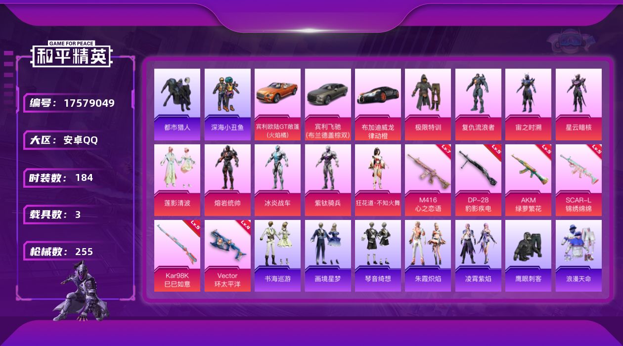 [17579049]实名: 不可修改 时装数: 184 载具数: 3 枪械数: 255 战备数: 180 热门装扮: 极限特训,深海小丑鱼,鹰眼刺客,都市猎人,复仇流浪者,宙之时溯,星云暗核,莲影清波,紫钛骑兵,冰炎战车,熔岩统帅,狂花道·不知火舞 载具: 宾利飞驰(布罗德盖棕双色),宾利欧陆GT敞篷(火焰橘),布加迪威龙(律动橙) 稀有枪皮: M416心之恋语,Vector环太平洋,AKM绿萝繁花,SCAR-L-锦绣绵绵,Kar98K-巳巳如意,DP-28-豹影疾电 亮点: 【店主推荐捡漏号!可直接换绑】安卓 手Q-9粉装-8特效枪-3载具-3粉色飞行器-76431热力值-15王牌印记-184套装-255枪皮【热门品类】:套装-浪漫天命,套装-都市猎人,套装-深海小丑鱼,角色-军刀雅典娜,套装-龟仙人,套装-暗影哥特【粉色套装】:粉装-极限特训,角色-复仇流浪者,角色-宙之时溯,角色-星云暗核,粉装-莲影清波,角色-熔岩统帅,角色-冰炎战车,角色-紫钛骑兵,角色-狂花道·不知火舞【粉色枪皮等级】:AKM-绿萝繁花(五级),SCAR-L-锦绣绵绵(五级),M416-心之恋语(七级),ACE32-萌骑漫游(一级),Vector-环太平洋(四级),Kar98K-巳巳如意(五级),Mk14-福马献瑞(五级),DP-28-豹影疾电(五级)【粉色载具】:宾利欧陆GT敞篷(火焰橘),宾利飞驰(布罗德盖棕双色),布加迪威龙(律动橙)【粉色枪皮】:AKM-绿萝繁花,SCAR-L-锦绣绵绵,M416-心之恋语,ACE32-萌骑漫游,Vector-环太平洋,Kar98K-巳巳如意,Mk14-福马献瑞,DP-28-豹影疾电【粉色飞行器】:炫彩糖果飞行器,梦幻火箭飞行器,繁龙极客飞行器