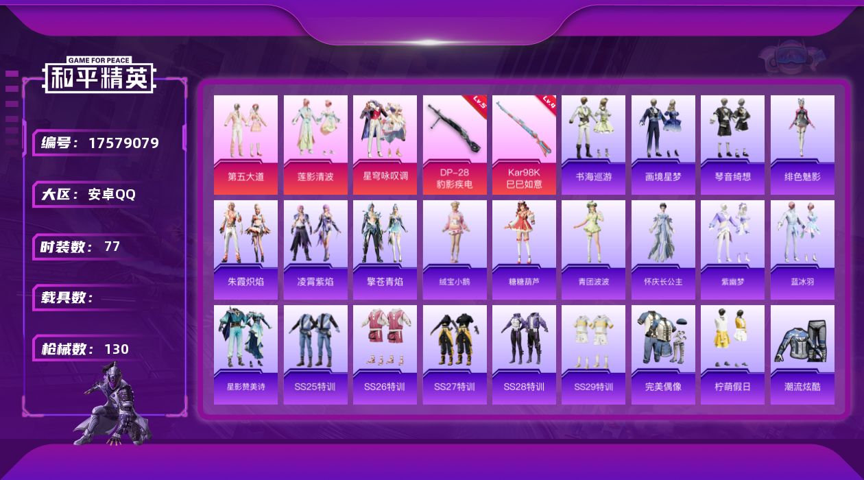 - [17433266]安卓 手Q-6粉装-7特效枪-0载具-2粉色飞行器-44491热力值-2王牌印记-99套装-163枪皮 【热门品类】:套装-龟仙人 【粉色套装】:粉装-星之彼岸,粉装-傲傲奶龙,角色-圣堂之誓,角色-千金淑猫,粉装-星穹咏叹调,角色-虹云熊熊 【粉色枪皮等级】:AUG-星之彼岸(七级),UMP45-萌骑冒险(四级),Kar98K-巳巳如意(五级),Mk14-福马献瑞(五级),M249-绝对恒星(一级),DP-28-千金淑猫(七级),DP-28-豹影疾电(五级) 【粉色枪皮】:AUG-星之彼岸,UMP45-萌骑冒险,Kar98K-巳巳如意,Mk14-福马献瑞,M249-绝对恒星,DP-28-千金淑猫,DP-28-豹影疾电 【粉色飞行器】:炫彩糖果飞行器,星之彼岸飞行器 【粉色降落伞】:绝对恒星降落伞,星之彼岸降落伞,闲梦青缨降落伞,圣堂之誓降落伞,千金淑猫降落伞,智耀战神降落伞,星穹咏叹调降落伞,幻彩电音降落伞,绯穹魔姬降落伞,炫彩糖果降落伞,霁蓝缠春降落伞,罪夜之冕降落伞 【稀有套装】:套装-龟仙人,套装-巳巳如意,角色-超感刻度,角色-甜心蒙太奇,套装-雪国风尚,套装-炫彩糖果,套装-马上有钱,角色-摩登魅猫,套装-紫幽梦,套装-蓝冰羽,角色-瑰梦爱神,套装-星影赞美诗,套装-星渊小夜曲,套装-霓虹热舞,套装-云朵鹅,套装-雪绒豹,角色-时希公主,角色-馥郁金蕊,角色-孙斩天 【稀有枪皮】:AUG-冰晶雪宝,AKM-星之彼岸,AKM-江南烟雨,AKM-破晓战魂,AKM-龙的传人,M16A4-红色方程式,SCAR-L-炫彩节奏,SCAR-L-红色方程式,M416-糯团青竹,M416-红色方程式,M416-蓝色火焰,AUG-耀粉歌者,AUG-绝对恒星,M762-天降萌叽,M762-彩虹符号,M762-萌物绒绒,M762-云朵鹅,AC-VAL-快闪甜心,AC-VAL-闲梦青缨,蜜獾-天降萌叽,UZI-啾咪啾咪,UZI-天降萌叽,UZI-红色方程式,UMP45-生命誓言,UMP45-绒宝小鹅,Vector-焰鹰斗篷,Vector-音爆索尼克,汤姆逊-炫彩节奏,汤姆逊-耀粉歌者,P90-快闪甜心,P90-巳巳如意,Kar98K-彩虹符号,Kar98K-星穹咏叹调,M24-幻彩电音,M24-樱桃泡泡,AWM-焰鹰斗篷,AWM-圣堂之誓,VSS-星之彼岸,Win94-星兔领航
