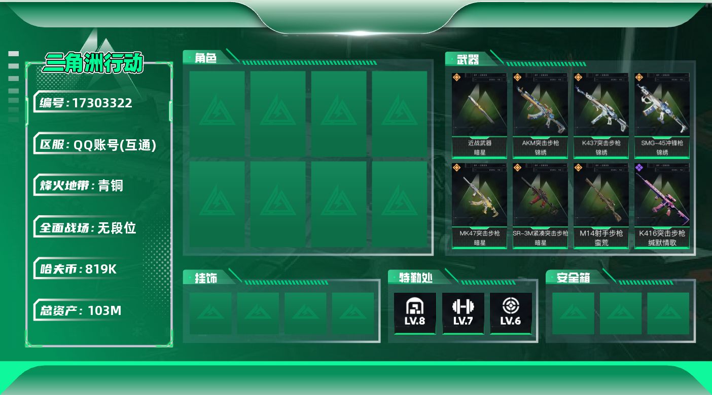 [17303322]总资产103M/哈夫币81万/传说近战数1/传说枪皮数6/战场等级1/行动等级58/安全箱等时效性道具以游戏内数据为准,详情请看图/近战-暗星/近战-黑鹰/AKM突击步枪-锦绣/K437突击步枪-锦绣/MK47突击步枪-暗星/SMG-45冲锋枪-锦绣/SR-3M紧凑突击步枪-暗星/M14射手步枪-蛮荒/K416突击步枪-缄默情歌/AUG突击步枪-蝮蛇/MP7冲锋枪-六套之力/S12K霰弹枪-曙光/PKM通用机枪-阿萨拉特攻/M249轻机枪-丛林谍踪/VSS射手步枪-丛林谍踪/SV-98狙击步枪-囚徒/K416突击步枪-一帆风顺/SG552突击步枪-马年新春/SCAR-H战斗步枪-荣耀列队/CAR-15突击步枪-来财/Vector冲锋枪-先锋/SMG-45冲锋枪-行动开启/SR-3M紧凑突击步枪-马年新春/M249轻机枪-冰天雪地/Mini-14射手步枪-荣耀列队/G18-星链科技/G18-哈夫克航天/M4A1突击步枪-高雅黑/QBZ95-1突击步枪-海浪/K416突击步枪-几何迷彩/K416突击步枪-重击/SG552突击步枪-海浪/SCAR-H战斗步枪-数码迷彩/PTR-32突击步枪-典雅/MP5冲锋枪-黄蜂/MP5冲锋枪-典雅/Vector冲锋枪-几何迷彩/UZI冲锋枪-海色/野牛冲锋枪-高雅黑/QJB201轻机枪-典雅/SVD狙击步枪-重击/SR-25射手步枪-黄蜂/SV-98狙击步枪-典雅/沙漠之鹰-高雅黑/沙漠之鹰-重击/93R-典雅/M1A4坦克-流星/突击车-流星/突击直升机-流星/F45A战斗机-流星/挂饰-暗星/暗行哨兵/挂饰-福禄/挂饰-聚宝盆/挂饰-卡皮巴拉/挂饰-锦绣/挂饰-北非蛋/挂饰-紧急撤离/挂饰-麻将