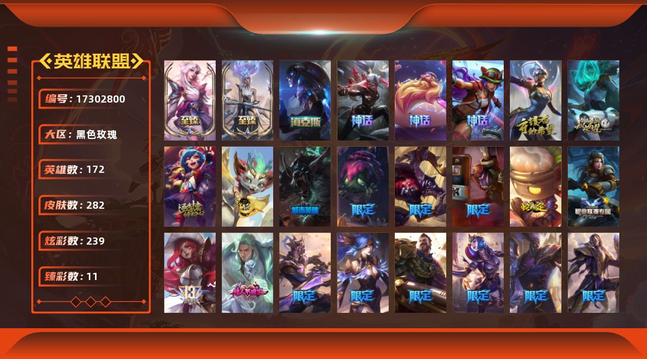 [17302800]172英雄/282皮肤/12神话/40限定/11臻彩/239炫彩/25传说/56史诗/未定级/10周年 安妮/源代码 乐芙兰/十五周年纪念 希维尔/黎明使者 卡尔玛/殿堂传奇 薇恩/超级音乐粉丝 古拉加斯/至臻 海珀利安小队 迦娜/至臻 暗裔英雄 嘉文四世/至臻 灵魂莲华 拉克丝/至臻永恒星灵佐伊/至臻 T1 塞拉斯/海克斯 玛尔扎哈/无畏骑士 瑟庄妮 赤子初心/冠军典狱长 锤石 凯旋圣装/神龙尊者 圣龙李青 龙腾云起/泳池派对 辛德拉 荔枝枝连击/霸天巨兽·雪崩 墨菲特/源计划: 火 菲奥娜 惩戒/星之吞噬者 莫甘娜 热情之末/幻灵战斗兔 锐雯 梦幻强袭/春晖神女 艾希 玉露金风/天龙之子 斯莫德/点心宝贝 阿木木/水晶玫瑰 斯维因/“主人不要我了” 阿木木/圣诞玩偶 波比/圣诞驯鹿 克格莫/魄罗骑士 瑟庄妮/冰雪节 马尔扎哈/北极星守护者 卢锡安/钢铁军团 拉克丝/S1FNC 迦娜/S2 暗杀星 蒙多/S3 SKT T1 婕拉/S4 SSW 图奇/S4 SSW 雷恩加尔/S8 IG 乐芙兰/S12 DRX 艾希/S12 DRX 凯特琳/女帝 厄运小姐/暗裔英雄 盖伦/胜利枪神 格雷福斯/胜利女神 奥莉安娜/胜利之剑 亚托克斯/胜利枪神 卢锡安/胜利机器人 布里茨/胜利女神 瑟庄妮/胜利凤凰 艾尼维亚/胜利之王 泰达米尔/胜利巨口 克格莫/胜利女神 娑娜/胜利剑圣 易/泳池派对 雷克顿/泳池派对 蕾欧娜/泳池派对 塔里克/泳池派对 塔莉垭/暗影 沃里克/都铎王朝 图奇/防暴士兵 辛吉德/海之歌 永恩/惊悚派对 阿木木/地狱之门卫士 加里奥/战地机甲 厄加特/战场女武神 凯尔/霸天零式 赛恩/欧米伽小队 幽灵特工/合金巨兽 努努和威朗普/幻灵战斗队长 厄运小姐/鬼魂新娘 莫甘娜/魔女 伊芙琳/女警狙击 凯特琳/上古战魂 魔腾/神龙尊者 圣龙李青/源计划:净化 薇恩/青花瓷 伊泽瑞尔/源计划:超体 莫德凯撒/腥红之月 鬼武姬 阿卡丽/星之守护者 阿卡丽/钢铁军团 盖伦/星之守护者 拉克丝/偶像歌手 阿狸/宇航员 诺提勒斯/霸天异形 卡兹克/灌篮高手 德莱厄斯/暗星尊 烬/源计划:毁灭 派克/安伯斯与提妮/特战先锋 赵信/女船长 厄运小姐/紫晶射手 艾希/百夫长 贾克斯/黑色荆棘 莫甘娜/卡尔萨斯·祸害之光/贵族血统 萨科/武动巅峰 萨科/特种部队 普朗克/北领前线
