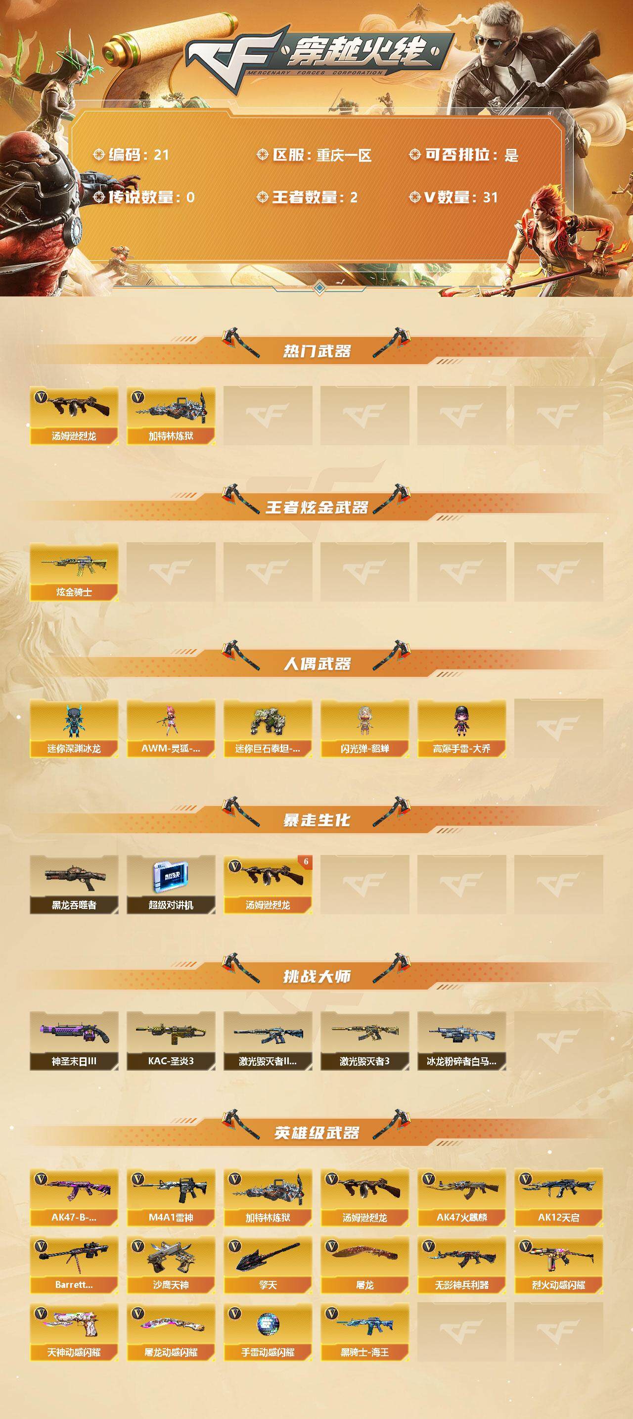 [12484612]【21】30V/100级/元帅/2王者/1炫金/1英雄/汤姆逊-烈龙/加特林-炼狱/炫金黑骑士/AWM-灵狐-15周年嘉年华/迷你深渊冰龙/迷你巨石泰坦-魔花研究所/闪光弹-貂蝉/高爆手雷-大乔/黑龙吞噬者/超级对讲机/6烈龙/神圣爆裂者-末日/KAC-圣炎切割者/激光毁灭者/激光毁灭者III-白马银枪/冰龙粉碎者-白马银枪/烈火-动感闪耀/天神-动感闪耀/屠龙-动感闪耀/手雷-动感闪耀/无影-神兵利器/M4A1-雷神/AK47-火麒麟/AK12-天启/Barrett-毁灭/黑骑士-海王/AK47-B-常胜将军/沙鹰-天神/擎天/屠龙