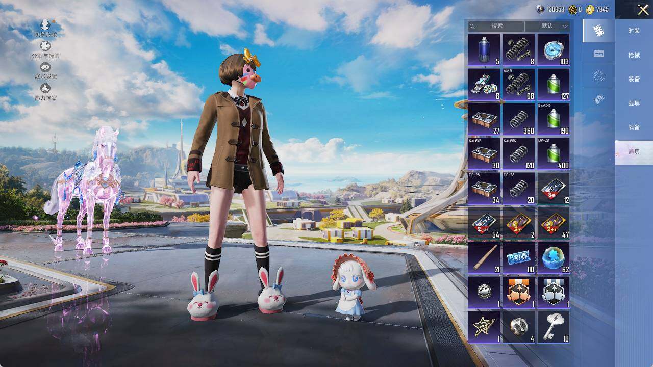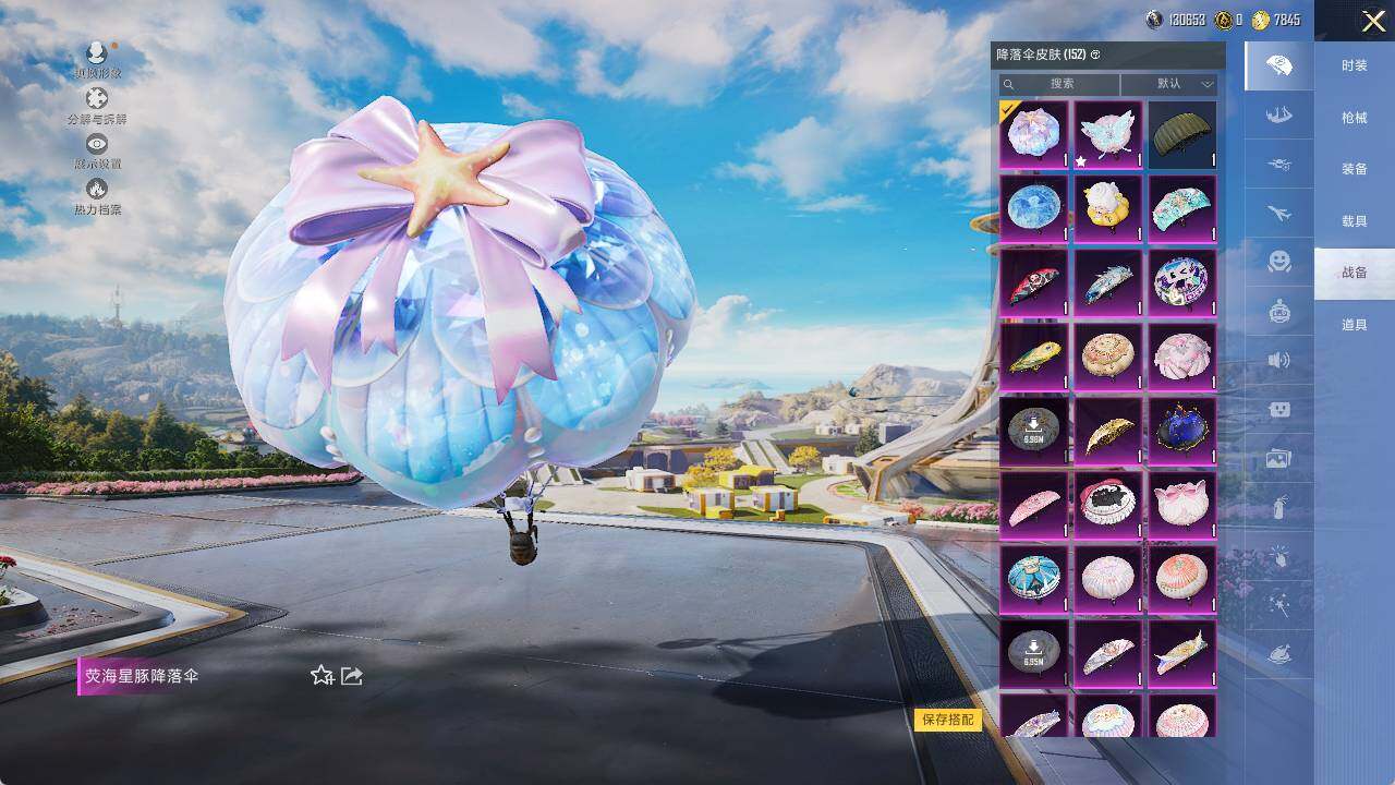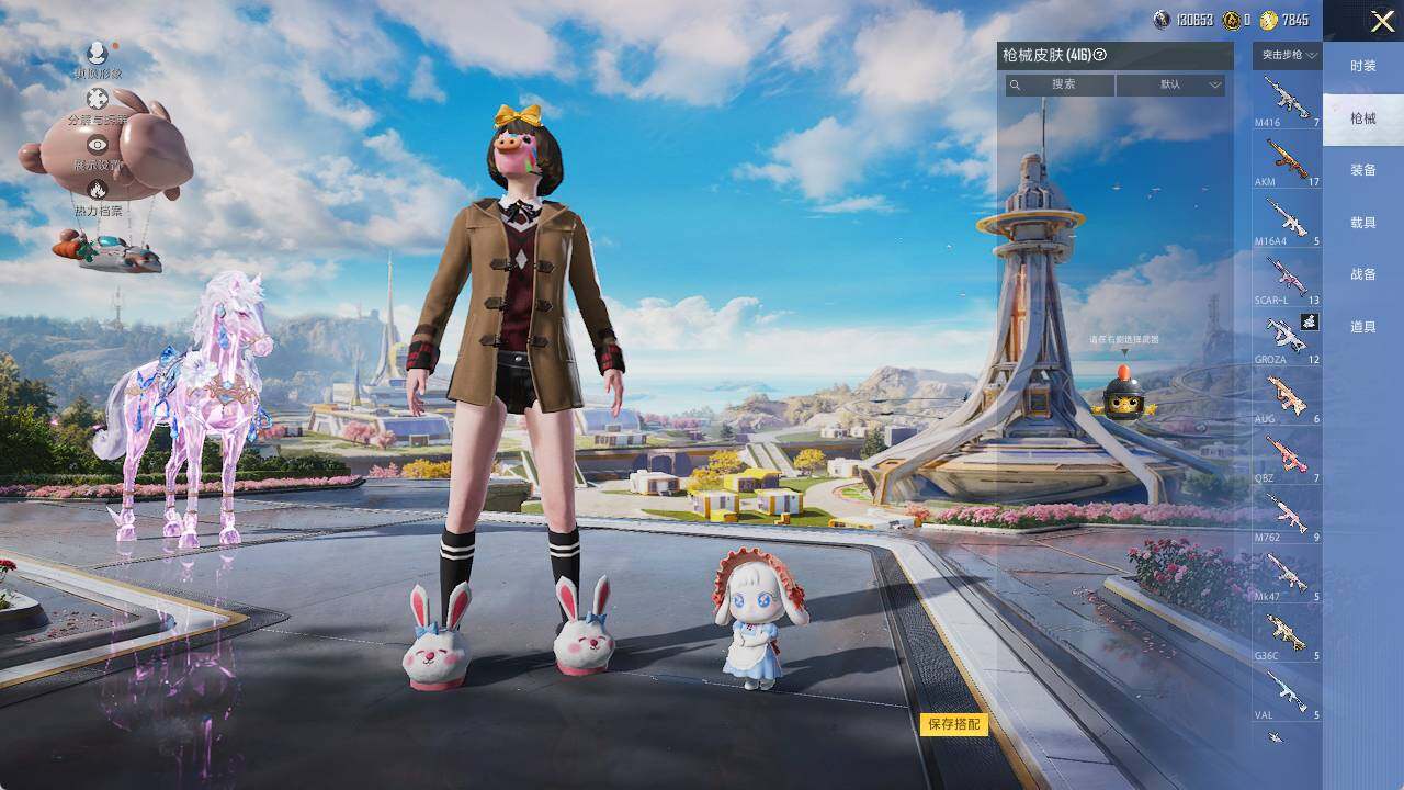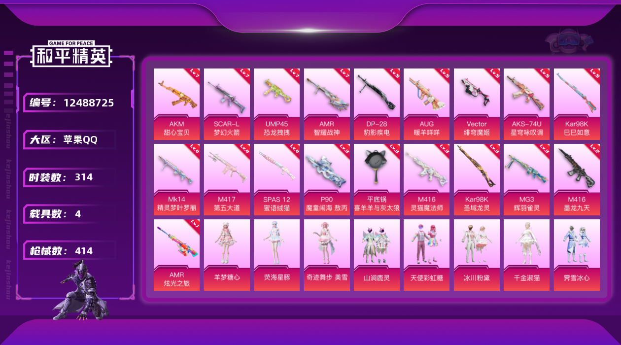 AKM-甜心宝贝,SCAR-L-梦幻火箭,M416-墨龙九天,AUG-暖羊咩咩,UMP45-恐龙拽拽,Kar98K-巳巳如意,Kar98K-圣域龙灵,Mk14-精灵梦叶罗丽,AMR-炫光之旅,M417-第五大道,SPAS-12-蜜语绒猫