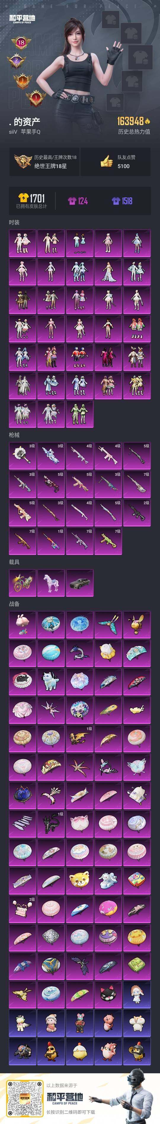 - PX_2095487- 苹果手Q-0王牌印记-1粉装-2特效枪-0载具-29664热力值-100套装-94枪皮-0卓越印记-0传奇印记 【1粉装】,梦幻火箭 【2特效枪】M416-风花雪月-5级 Kar98K-巳巳如意-2级 【6稀有紫装】,Mark.06,暗影哥特,浪漫天命,雪山精英,浪漫波比,龟仙人, 【101稀有时装】,灵公主,SS34特训,浪漫天命,龟仙人,Mark.06,雪山精英,游乐