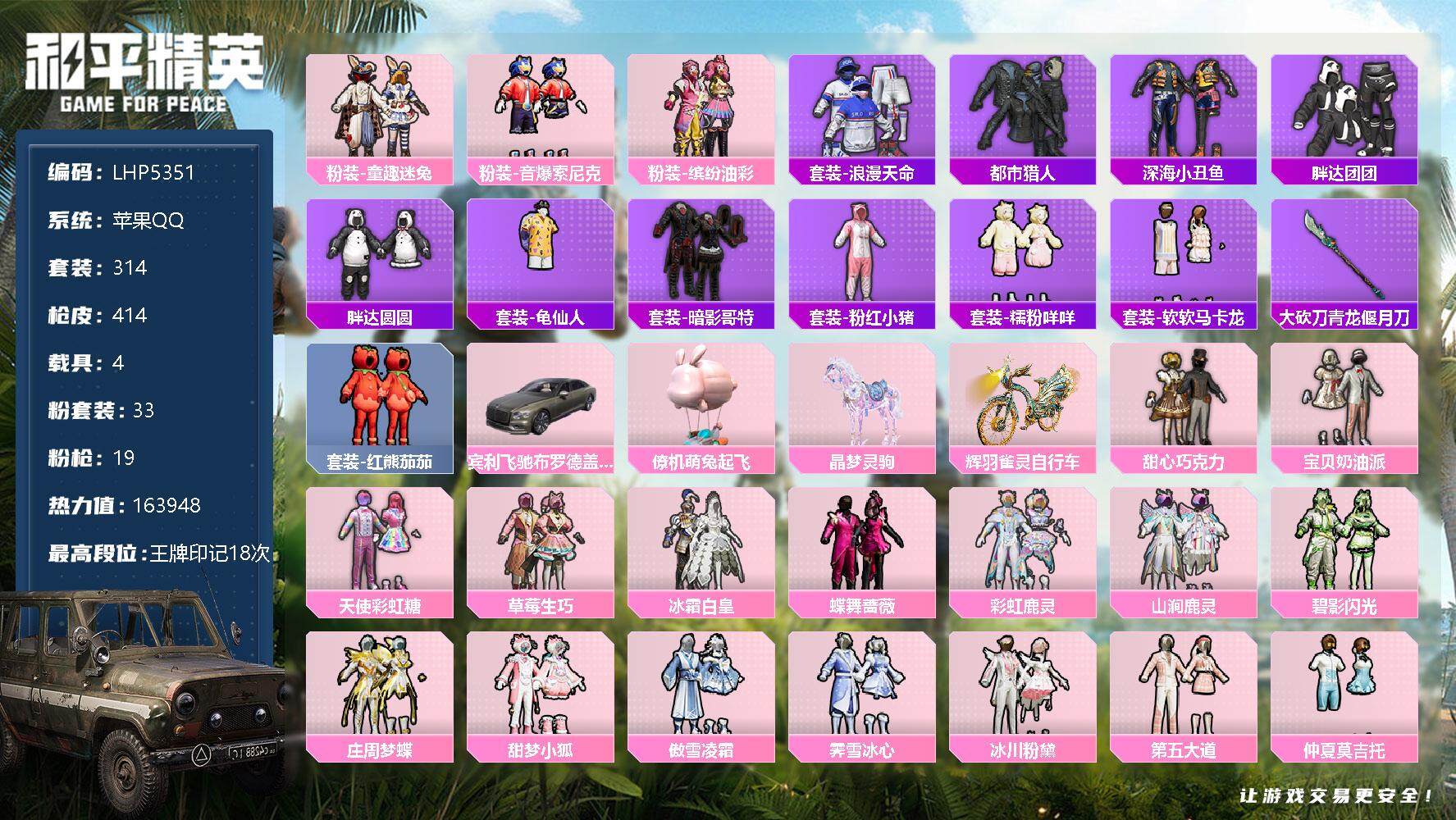 - [12113188]3粉装 3特效枪 5印记 可二次 可修改实名 身法装备:都市猎人,暗影哥特(红眼罩) 优质装备:都市猎人,幻影战神,智能音符,SCAR-L-锦绣绵绵,幻彩电音,Kar98K-巳巳如意 热门装扮:鹰眼刺客,都市猎人 稀有枪皮:DP-28-豹影疾电 五级特效枪:五级Kar98K-巳巳如意,五级DP-28-豹影疾电,五级SCAR-L-锦绣绵绵 紫色装扮:田园牧歌,轻风白浪,和煦暖阳,SS22特训,SS23特训,幻彩翩翩,妙红点点,娇憨猪猪,萌趣咩咩,SS21特训,绚烂繁星,SS31特训套装,人气偶像,冷焰舞者,旭日情侣,SS30特训套装,SS33特训套装,顶瓜瓜,飞驰魅影,音速流光,SS19特训,军刀雅典娜,酒红色名流,野性战心,长空猛禽,霓虹街区,青年教官,风暴特警,缤纷果语,蓝色运动,血色贵族,超能勇士,魅力单车,麻辣教官,黄色伏地魔,黄色运动,黑色伏地魔,龙的传人,龟仙人,极地朋克,极速红龙,柠萌假日,橘黑制服,海岛探路者,深蓝色名流,清新柠檬,夏日倾情,夜莺强袭者,疯狂小兔子,白色伏地魔,破晓战魂,破蛋小黄鸡,空岛之星,红色运动,甜蜜熊情侣,王牌教练,炫蓝之夏,猛禽,特殊使命,特训学院,创世·追猎,红潮炫舞,玉兔迎春,森林游猎者,竞技名士,暗影哥特(红眼罩),惊鸿侠骨,SS24特训(SS24特训套装),SS25特训,锦衣飞扬,SS27特训,无暇誓言,童真绒兔,Alan Walker,小丑鱼,SS26特训,春光漫游,快闪甜心,智谋强哥,大橘大利,蓝冰羽,紫幽梦,SS32特训服(SS32特训套装),绯格组合,白糯汤圆,漫步者,水银刺客,无烬之地,冰原奔狼,冰冻风暴,弄潮海豚,光之冒险 优质战备:星之彼岸降落伞,临安公主降落伞,环太平洋降落伞,幻影战神降落伞,甜心宝贝降落伞
