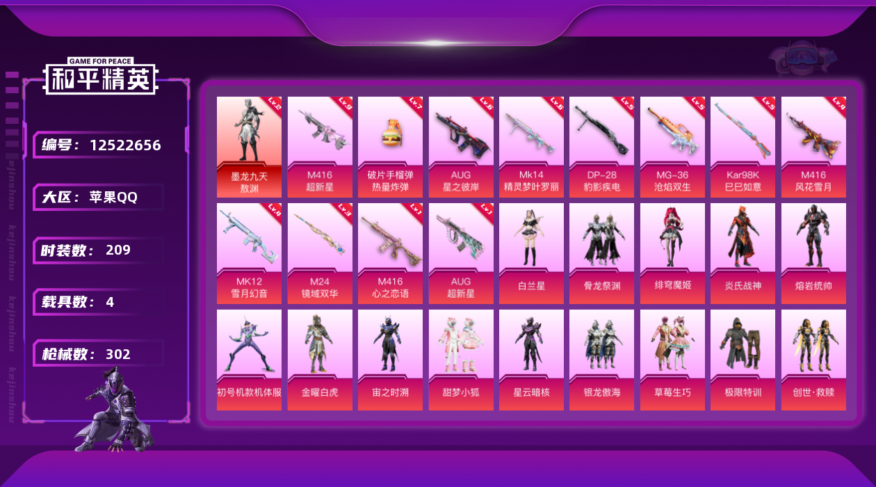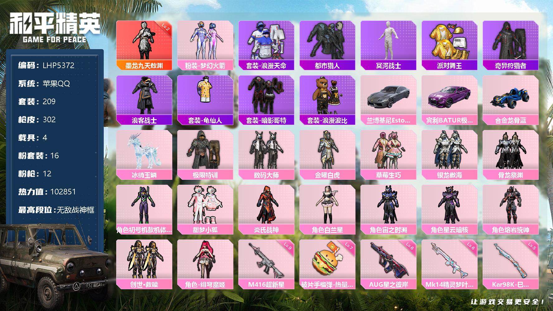 [12522656]素材身法号/老木乃伊/无敌战神框1/绝世印记10/满级m4超新星/扭蛋碎片528【特价急出/详情看图】:苹果 手Q-无敌战神框-1神装-16粉装-12特效枪-4载具-8粉色飞行器-10.2w热力值-19王牌印记-209套装-302枪皮【红色神装等级】:墨龙九天-敖渊(二级)【热门品类】:粉装-梦幻火箭,套装-浪漫天命,套装-都市猎人,套装-冥河战士,套装-派对舞王,套装-奇异狩猎者,套装-浪客战士,套装-龟仙人,套装-暗影哥特,套装-浪漫波比【粉色载具】:兰博基尼Estoque(银翼灰),宾利BATUR(极速紫),合金龙骨(蓝),冰绡玉鳞【粉色套装】:粉装-极限特训,粉装-数码大师,粉装-金曜白虎,粉装-梦幻火箭,粉装-草莓生巧,粉装-银龙傲海,粉装-骨龙祭渊,角色-初号机款机体服,粉装-甜梦小狐,粉装-炎氏战神,角色-白兰星,角色-宙之时溯,角色-星云暗核,角色-熔岩统帅,套装-创世·救赎,角色-绯穹魔姬【粉色枪皮等级】:M416-心之恋语(一级),M416-风花雪月(四级),M416-超新星(九级),AUG-星之彼岸(六级),AUG-超新星(一级),Kar98K-巳巳如意(五级),M24-镜域双华(三级),Mk14-精灵梦叶罗丽(六级),MK12-雪月幻音(四级),DP-28-豹影疾电(五级),MG-36-沧焰双生(五级),破片手榴弹-热量炸弹(七级)【粉色飞行器】:梦幻火箭飞行器,夏日绵绵冰飞行器,黄族统领飞行器,沙丘之主天马,鎏金朋克飞行器,灵猫魔法师飞行器,飞天猪飞行器