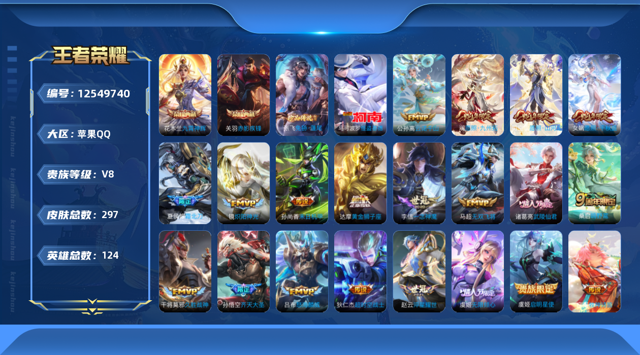 [12549740]【商品标题】:苹果Q-V8-至尊星耀II段位-124英雄-297皮肤-2典藏-0珍品无双-0无双-2珍品传说-22传说-78史诗