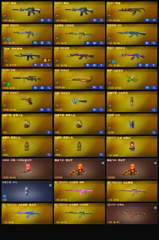 【英雄级武器】:金色蔷薇-古蛇迷踪,无影-神兵利器,M4A1-雷神*2,M200-幻神,AK47-黑鲨,黑武士-锦绣游龙,超新星-热带奇洋,死神-雪域霜狐,M4A1-赤狱骑士,修罗-古蛇迷踪,龙啸-热带奇洋