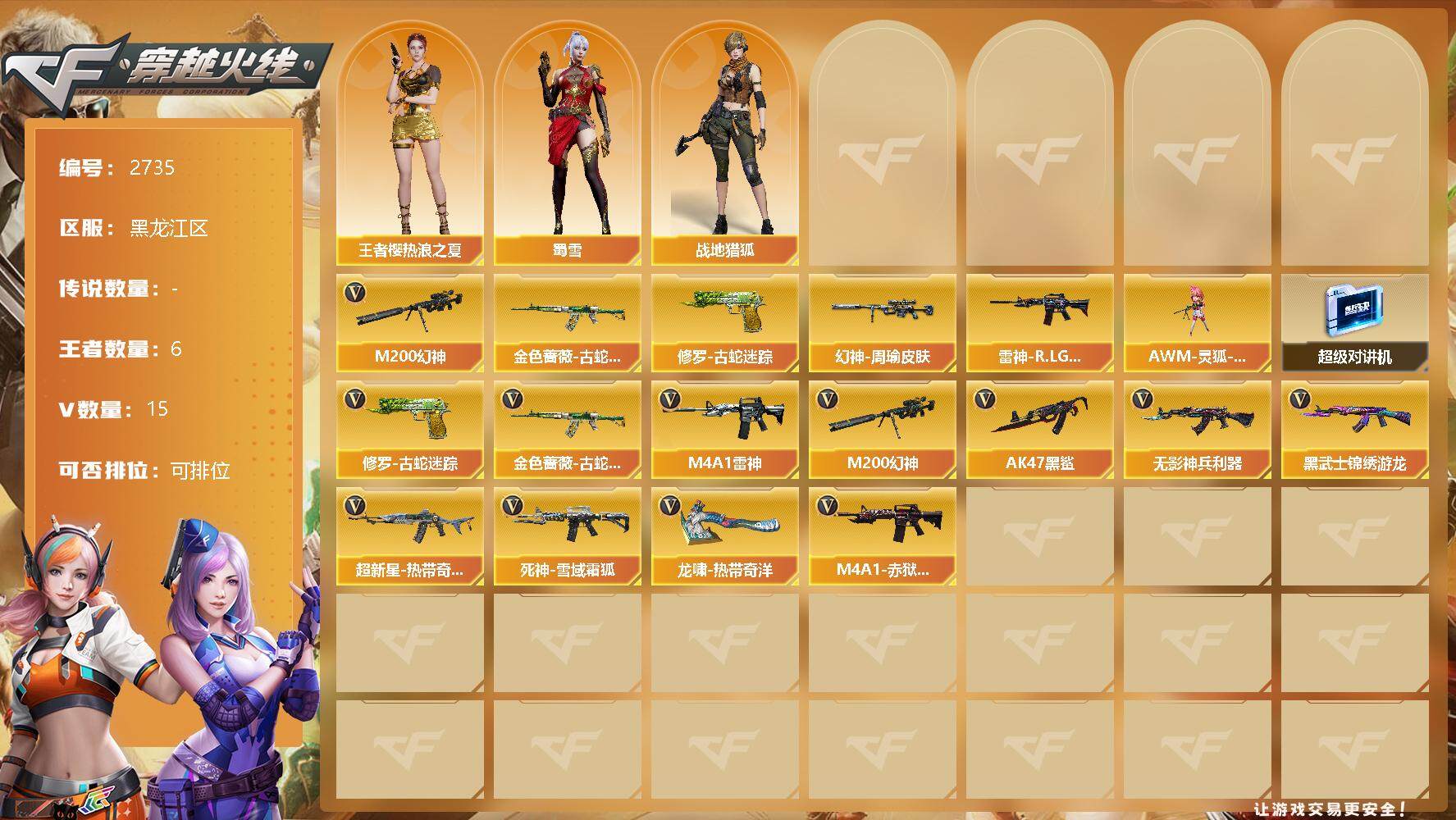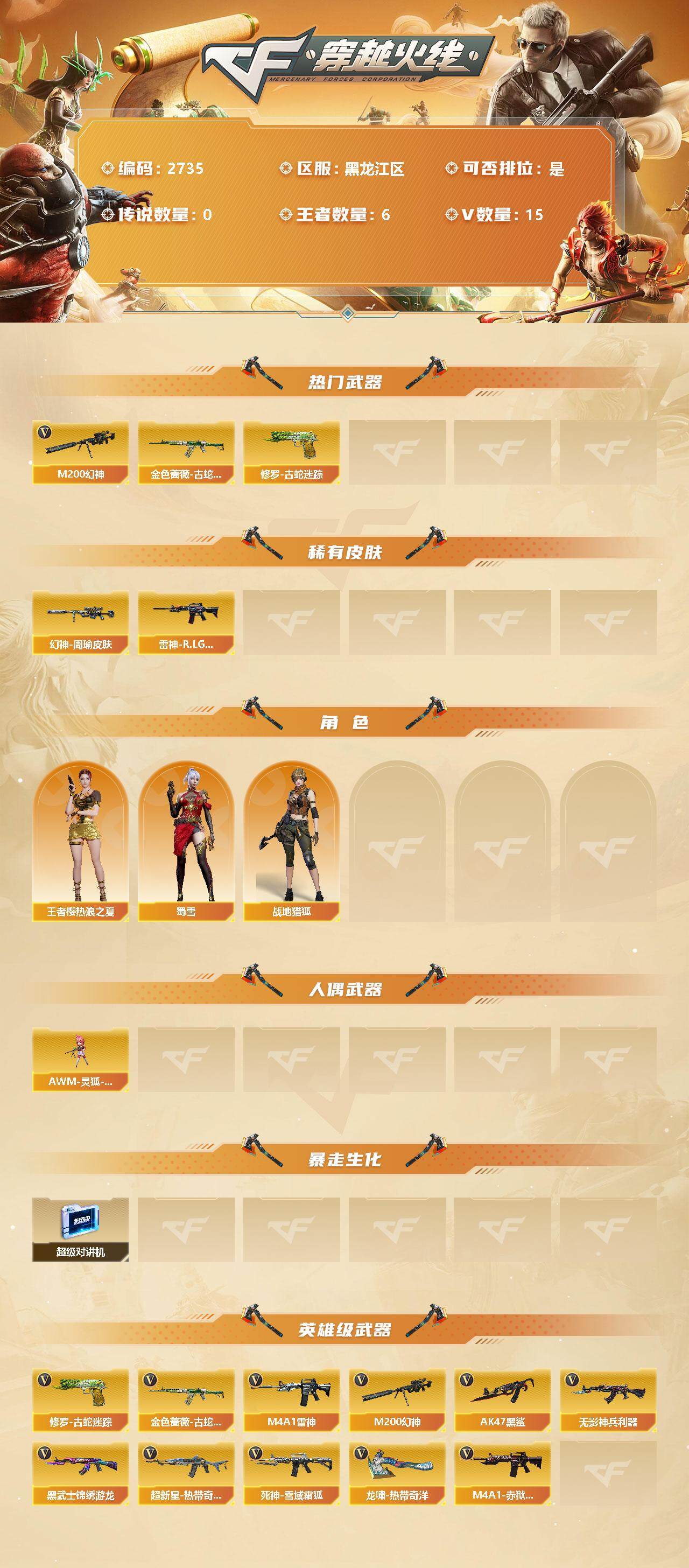 [12553667]【商品标题】:黑龙江区-15V-6王者-0炫金 【热门武器】:M200-幻神,金色蔷薇-古蛇迷踪,修罗-古蛇迷踪 【稀有皮肤】:幻神-周瑜皮肤,雷神-R.LGD-CFPLS18冠军 【角色】:王者樱-热浪之夏,战地猎狐,蜀雪 【人偶武器】:AWM-灵狐-15周年嘉年华 【暴走生化】:超级对讲机 【英雄级武器】:金色蔷薇-古蛇迷踪,无影-神兵利器,M4A1-雷神*2,M200-幻神,AK47-黑鲨,黑武士-锦绣游龙,超新星-热带奇洋,死神-雪域霜狐,M4A1-赤狱骑士,修罗-古蛇迷踪,龙啸-热带奇洋 【特殊枪械】: