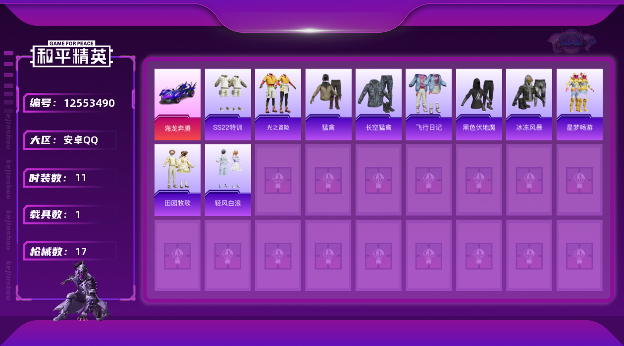 - PX_2095496- 安卓手Q-18王牌印记-7粉装-9特效枪-8载具-98253热力值-201套装-277枪皮-2卓越印记-0传奇印记 【7粉装】,怪诞乔克,智耀战神,月下星之子,橘柚倾心,海盐物语,银刃赛罗,创世·救赎 【9特效枪】AKM-幽焰骑士-3级 AKM-梦之光华-6级 SCAR-L-金蛇镇世-6级 M416-五爪金龙-7级 GROZA-圣辉之星-5级 Kar98K-巳巳如意-5级