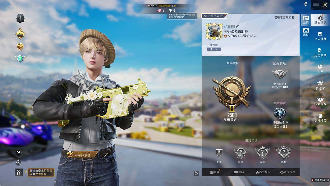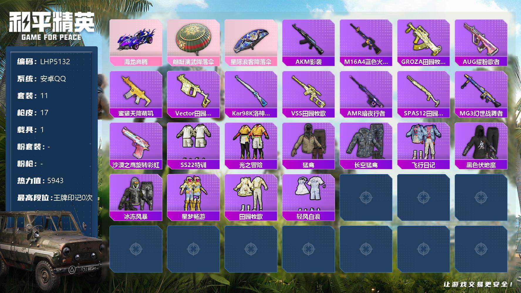 - [11385987]2粉装 4特效枪 8印记 可二次 可修改实名 优质装备:宝贝奶油派,AKM梦之光华,M416风花雪月,SCAR-L青春物语,七级SCAR-L-青春物语,冷漠罗丽 热门装扮:深海小丑鱼 稀有枪皮:DP-28-豹影疾电 六级特效枪:六级M416-风花雪月 五级特效枪:五级DP-28-豹影疾电 二级特效枪:二级AKM-梦之光华 紫色装扮:SS22特训,SS23特训,娇憨猪猪,萌趣咩咩,SS21特训,SS31特训套装,军械专家,冰川特警,冷焰舞者,千禧之恋,极速光影,SS30特训套装,云朵鹅,彩虹兔,雪绒豹,SS33特训套装,顶瓜瓜,SS20特训,SS15特训,SS16特训,SS13特训,SS14特训,萌趣颜团子,猎梦纪元,SS19特训,竞技角斗士,吉莉礼服,甜心亚梦,虚音幻奏,极乐追光,都市漫游者,酷潮明星,长空猛禽,霓虹街区,青年教官,缤纷果语,耀眼新星,蓝色运动,超能勇士,蜜露汐语,飞行日记,魅力单车,麻辣教官,黄色运动,黎明保卫者,黑色伏地魔,龟仙人,龙魂突击队,蝶变,香桃花海,柠萌假日,沙漠兵团,活力之心,海岛探路者,夏日音浪,幻世战舞者,白色伏地魔,福星高照,空岛之星,竞技达人朋克,红色运动,牛气冲天,牛气满满,猛禽,雏菊兔兔,萝兰蝴蝶,SS29特训,星途旅人,火种守护者(套装-火种守卫者),异域银装,玉兔迎春,竞技名士,街头风暴,SS24特训(SS24特训套装),SS25特训,焰鹰斗篷,幻羽潜行,SS27特训,SS26特训,春光漫游,快闪甜心,贝斯之夜,淡雅花蕊,大橘大利,SS12特训,粉恋花,蓝冰羽,紫幽梦,SS32特训服(SS32特训套装),绯格组合,萌黄之夏,漫步者,蓝调潮人,光之冒险,海上生明月 优质战备:星途旅人降落伞,BEARBRICK降落伞,星之彼岸降落伞,冷漠罗丽降落伞,智耀战神降落伞,幻影战神降落伞,青春物语降落伞