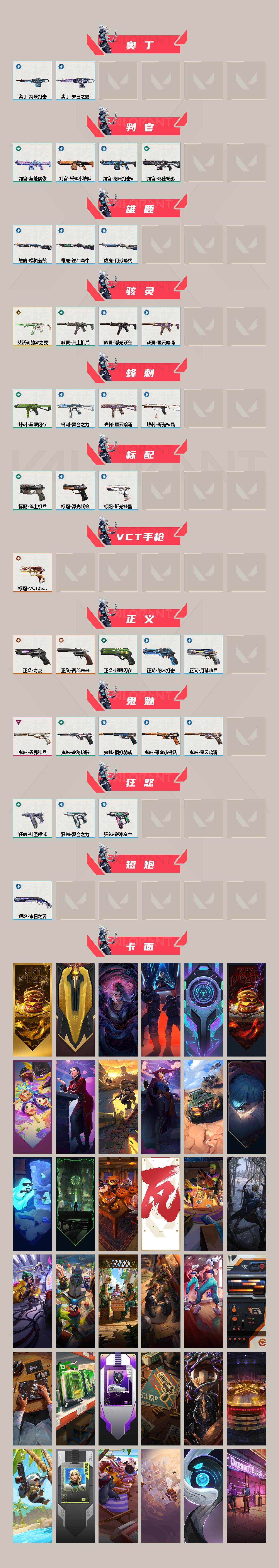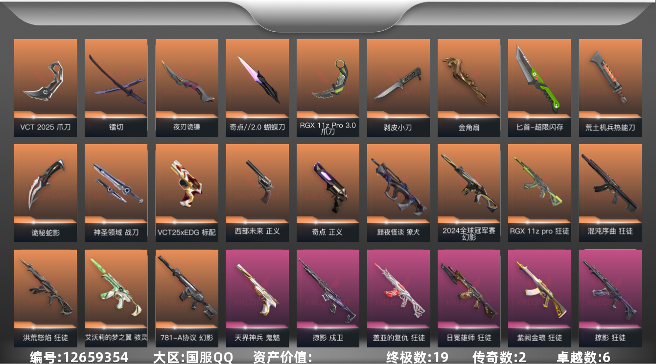 [12659354]【套装】:VCT 2025 赛季套装 【英雄】:幻棱,炼狱,维斯,暮蝶,钛狐,壹决,铁臂,捷风,幽影,不死鸟,贤者,猎枭,蝰蛇,零,芮娜,奇乐,尚勃勒,霓虹,斯凯,夜露,星礈,K/O,盖可,黑梦,钢锁 【近战 武器】:近战武器-剥皮小刀,近战武器-奇点//2.0 蝴蝶刀,近战武器-VCT 2025 爪刀,近战武器-RGX 11z Pro//3.0 爪刀,近战武器-镭切,近战武器-超限闪存 匕首,近战武器-荒土机兵 热能刀,近战武器-金角扇,近战武器-夜刃诡镰,近战武器-诡秘蛇影 军刀,近战武器-神圣领域 战刀 【狂徒】:狂徒-洪荒怒焰,狂徒-混沌序曲,狂徒-RGX 11z Pro,狂徒-掠影,狂徒-盖亚的复仇,狂徒-日冕雄师,狂徒-紫阙金琅,狂徒-荒土机兵,狂徒-诡秘蛇影 【幻影】:幻影-781-A协议,幻影-2024全球冠军赛,幻影-超限闪存,幻影-神圣领域,幻影-纳米打击,幻影-末日之翼 【戍卫】:戍卫-掠影,戍卫-浮光跃金,戍卫-逆冲蛮牛,戍卫-月球哨兵,戍卫-折光棱晶 【獠犬】:獠犬-黯夜怪谈,獠犬-神圣领域,獠犬-模拟赫兹,獠犬-逆冲蛮牛 【冥驹】:冥驹-荒土机兵,冥驹-模拟赫兹,冥驹-星云暗涌 【飞将】:飞将-末日之翼 【莽侠】:莽侠-超限闪存,莽侠-诡秘蛇影,莽侠-月球哨兵 【战神】:战神-神圣领域,战神-采蜜小蜂队,战神-浮光跃金 【奥丁】:奥丁-纳米打击,奥丁-末日之翼 【判官】:判官-超能偶像,判官-诡秘蛇影,判官-采蜜小蜂队,判官-纳米打击x 【雄鹿】:雄鹿-模拟赫兹,雄鹿-逆冲蛮牛,雄鹿-月球哨兵 【骇灵】:骇灵-艾沃莉的梦之翼,骇灵-荒土机兵,骇灵-浮光跃金,骇灵-星云暗涌 【蜂刺】:蜂刺-超限闪存,蜂刺-聚合之力,蜂刺-星云暗涌,蜂刺-折光棱晶 【标配】:标配-荒土机兵,标配-浮光跃金,标配-折光棱晶 【VCT手枪】:标配-VCT25 x EDG 【正义】:正义-奇点,正义-西部未来,正义-超限闪存,正义-纳米打击,正义-月球哨兵 【鬼魅】:鬼魅-天界神兵,鬼魅-诡秘蛇影,鬼魅-采蜜小蜂队,鬼魅-模拟赫兹,鬼魅-星云暗涌 【狂怒】:狂怒-神圣领域,狂怒-聚合之力,狂怒-逆冲蛮牛 【短炮】:短炮-末日之翼 【卡面】:终章:激斗汉堡 卡面,进入射程 卡面,分崩离析 卡面,纳米打击 卡面,抑制技术 卡面,激斗汉堡 卡面,瓦娃脸雪糕 P2 卡面