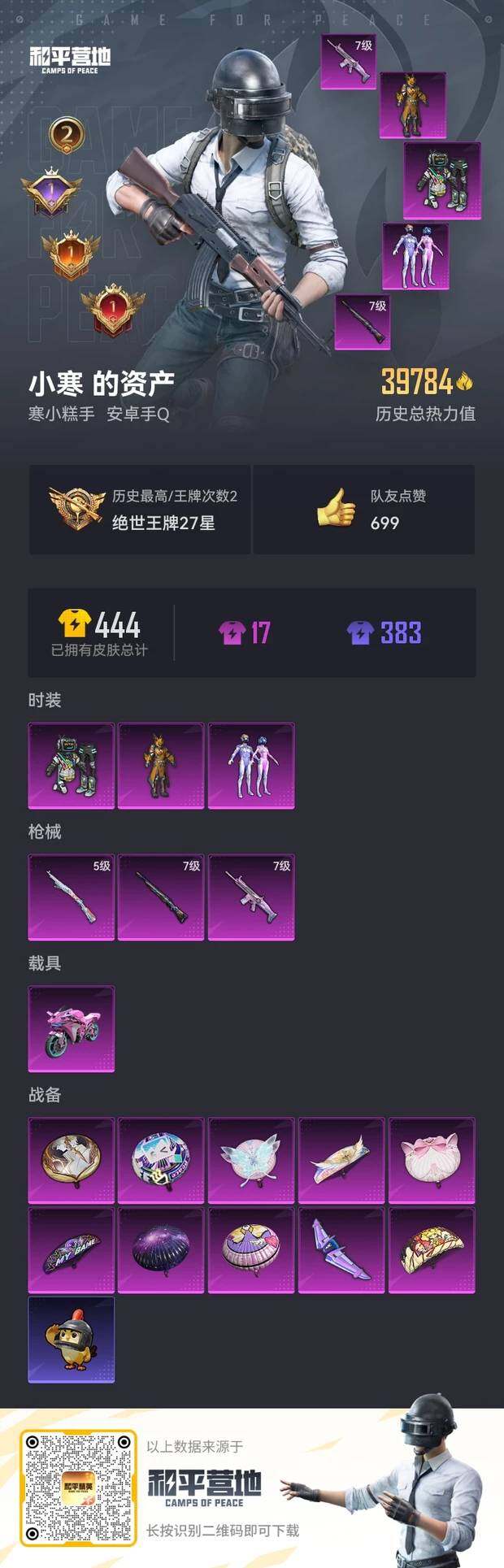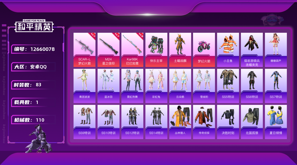 [12660078]安卓 手Q-3粉装-3特效枪-1载具-1粉色飞行器-39784热力值-2王牌印记-83套装-110枪皮