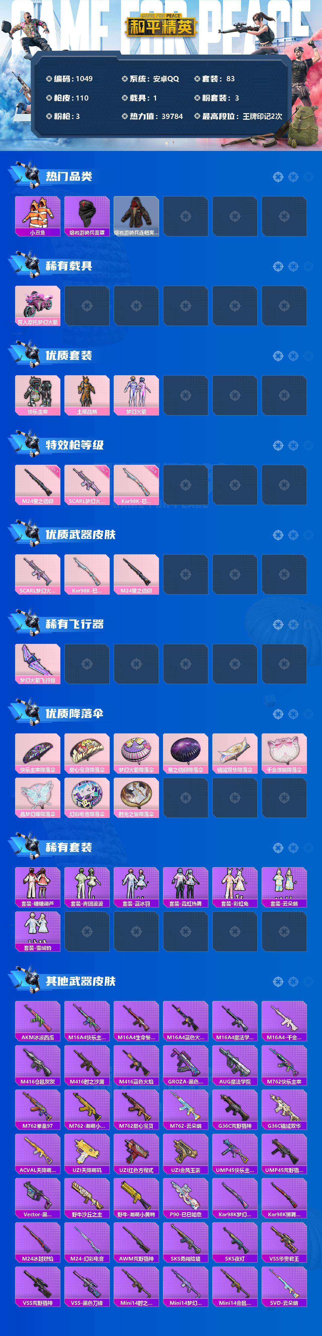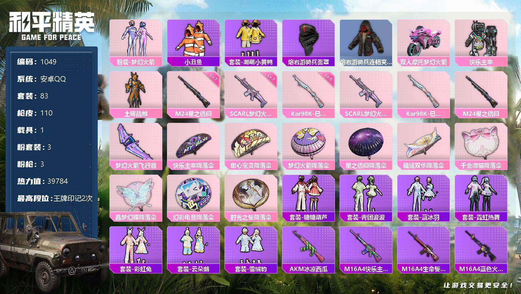 [12660078]安卓 手Q-3粉装-3特效枪-1载具-1粉色飞行器-39784热力值-2王牌印记-83套装-110枪皮 【热门品类】:粉装-梦幻火箭,套装-小丑鱼,套装-潮萌小黄鸭,熔岩游骑兵面罩,熔岩游骑兵连帽夹克 【粉色载具】:双人摩托-梦幻火箭 【粉色套装】:粉装-快乐主宰,粉装-土曜战麒,粉装-梦幻火箭 【粉色枪皮等级】:SCAR-L-梦幻火箭(七级),Kar98K-巳巳如意(五级),M24-星之信仰(七级) 【粉色枪皮】:SCAR-L-梦幻火箭,Kar98K-巳巳如意,M24-星之信仰 【粉色飞行器】:梦幻火箭飞行器 【粉色降落伞】:快乐主宰降落伞,甜心宝贝降落伞,梦幻火箭降落伞,星之信仰降落伞,镜域双华降落伞,千金淑猫降落伞,晶梦幻蝶降落伞,幻彩电音降落伞,时光之誓降落伞 【稀有套装】:套装-糖糖葫芦,套装-青团波波,套装-蓝冰羽,套装-霓虹热舞,套装-彩虹兔,套装-云朵鹅,套装-雪绒豹 【稀有枪皮】:AKM-冰凉西瓜,M16A4-快乐主宰,M16A4-生命誓言,M16A4-蓝色火焰,M16A4-魔法学院,M16A4-千金淑猫,M416-仓鼠灰灰,M416-时之沙漏,M416-蓝色火焰,GROZA-黑色刀锋,AUG-魔法学院,M762-快乐主宰,M762-拳皇97,M762-潮萌小黄鸭,M762-甜心宝贝,M762-云朵鹅,G36C-镜域双华,G36C-荒野猎神,AC-VAL-天降萌叽,UZI-天降萌叽,UZI-红色方程式,UZI-金风玉露,UMP45-快乐主宰,UMP45-荒野猎神,Vector-黑色刀锋,野牛-沙丘之主,野牛-潮萌小黄鸭,P90-巳巳如意,Kar98K-梦幻火箭,Kar98K-狮舞迎春,M24-冰封烈焰,M24-幻彩电音,AWM-荒野猎神,SKS-勇闯险境,SKS-夜灯,VSS-华贵君王,VSS-荒野猎神,VSS-黑色刀锋,Mini14-时之沙漏,Mini14-梦幻火箭,Mini14-金鼠迎春,SVD-云朵鹅,SVD-冷漠罗丽,S686-冰封烈焰,S686-红色方程式,S686-魔法学院,S686-千金淑猫,S1897-天启纪元,SPAS-12-云朵鹅,M249-拳皇97,DP-28-潮萌小黄鸭,DP-28-甜心宝贝,MG3-幻世战舞者,P92-拳皇97,P1911-冰封烈焰,R45-幻彩电音,蝎式手枪-潮萌小黄鸭,沙漠之鹰-云朵鹅,大砍刀-云朵鹅