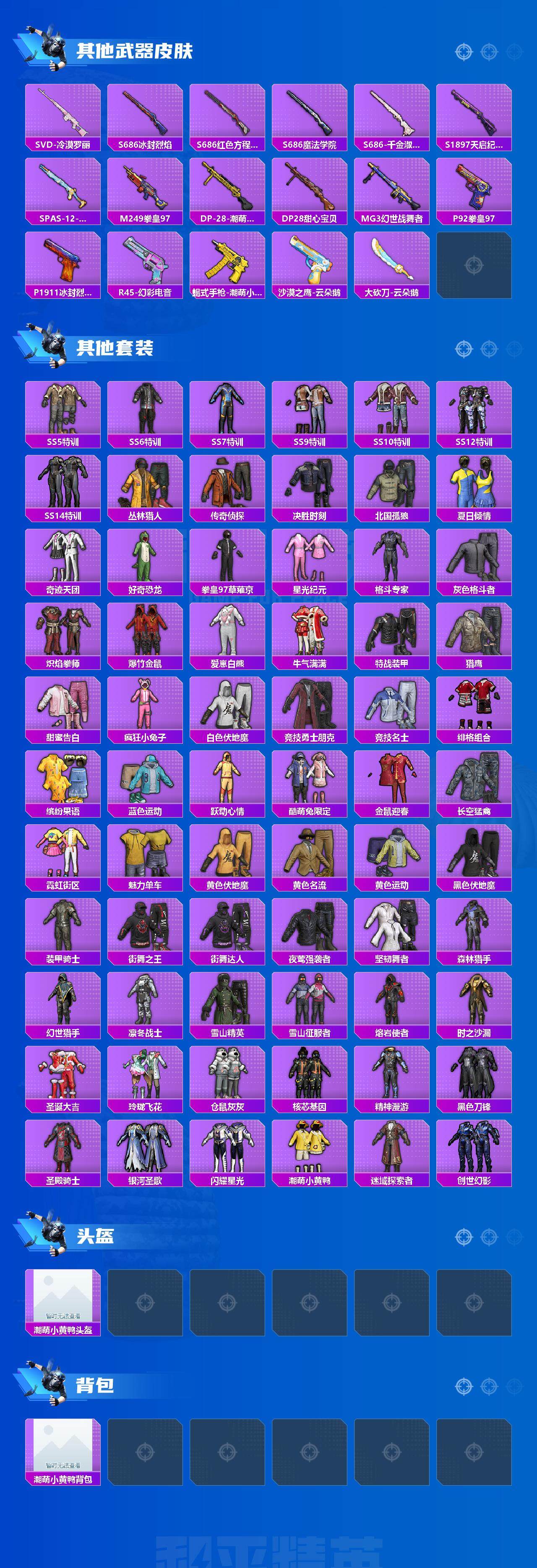 【稀有枪皮】:AKM-冰凉西瓜,M16A4-快乐主宰,M16A4-生命誓言,M16A4-蓝色火焰,M16A4-魔法学院,M16A4-千金淑猫,M416-仓鼠灰灰,M416-时之沙漏,M416-蓝色火焰,GROZA-黑色刀锋,AUG-魔法学院,M762-快乐主宰,M762-拳皇97,M762-潮萌小黄鸭,M762-甜心宝贝,M762-云朵鹅,G36C-镜域双华,G36C-荒野猎神,AC-VAL-天降萌叽,UZI-天降萌叽,UZI-红色方程式,UZI-金风玉露,UMP45-快乐主宰,UMP45-荒野猎神,Vector-黑色刀锋,野牛-沙丘之主,野牛-潮萌小黄鸭,P90-巳巳如意,Kar98K-梦幻火箭,Kar98K-狮舞迎春,M24-冰封烈焰,M24-幻彩电音,AWM-荒野猎神,SKS-勇闯险境,SKS-夜灯,VSS-华贵君王,VSS-荒野猎神,VSS-黑色刀锋,Mini14-时之沙漏,Mini14-梦幻火箭,Mini14-金鼠迎春,SVD-云朵鹅,SVD-冷漠罗丽,S686-冰封烈焰,S686-红色方程式,S686-魔法学院,S686-千金淑猫,S1897-天启纪元,SPAS-12-云朵鹅,M249-拳皇97,DP-28-潮萌小黄鸭,DP-28-甜心宝贝,MG3-幻世战舞者,P92-拳皇97,P1911-冰封烈焰,R45-幻彩电音,蝎式手枪-潮萌小黄鸭,沙漠之鹰-云朵鹅,大砍刀-云朵鹅