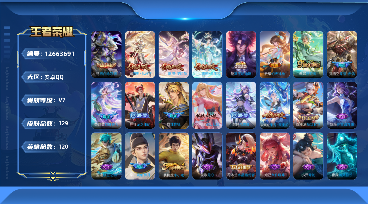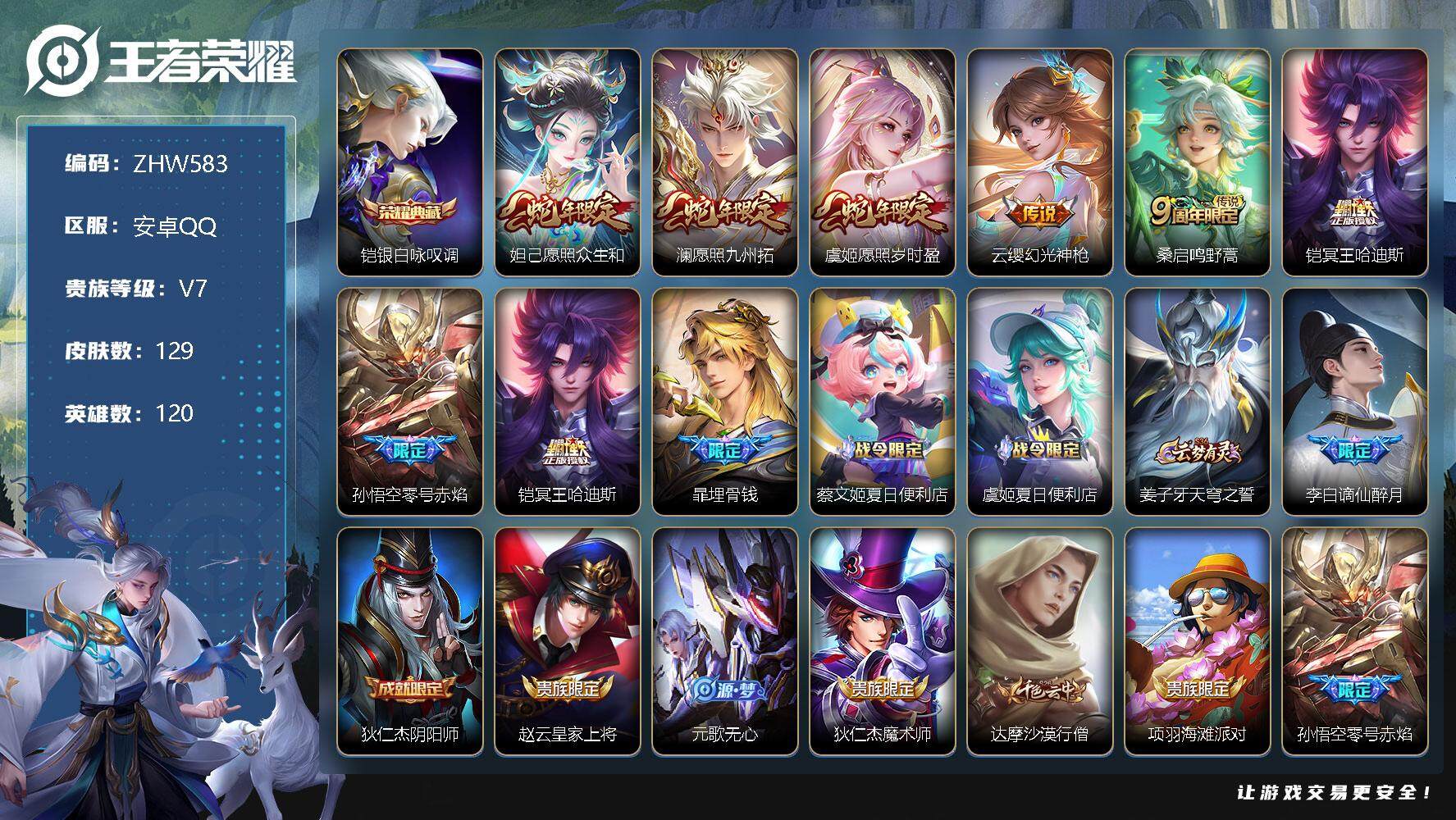 [12663691]安卓Q-V7-至尊星耀V段位-120英雄-129皮肤-1典藏-7传说-41史诗 【英雄全皮】:影全皮,少司缘全皮 【荣耀典藏】:铠银白咏叹调 【传说皮肤】:妲己愿照众生和,澜愿照九州拓,虞姬愿照岁时盈,云缨幻光神枪,桑启鸣野蒿,铠冥王哈迪斯,孙悟空零号赤焰 【限定皮肤】:铠冥王哈迪斯,暃埋骨钱,蔡文姬夏日便利店,虞姬夏日便利店,姜子牙天穹之誓,李白谪仙醉月,狄仁杰阴阳师,赵云皇家上将,元歌无心,狄仁杰魔术师,达摩沙漠行僧,项羽海滩派对,孙悟空零号赤焰,李元芳云中旅人,沈梦溪大漠名商,裴擒虎李小龙,裴擒虎擒涛扼浪,鲁班大师探海日志,桑启海盐诗旅,张良古海寻踪,高渐离燃音魔法,妲己灵卜魔法,鬼谷子天穹祈灯,姬小满妄想食味,安琪拉乘龙聚宝船,沈梦溪龙舞盛年,程咬金群星魔术团,刘备异域游侠,周瑜熔金海岸 【年限皮肤】:安琪拉乘龙聚宝船 【赛季限定】:达摩沙漠行僧,张良古海寻踪,李元芳云中旅人,沈梦溪大漠名商,裴擒虎擒涛扼浪,鲁班大师探海日志,桑启海盐诗旅,鬼谷子天穹祈灯,姜子牙天穹之誓 【战令限定】:蔡文姬夏日便利店,虞姬夏日便利店,高渐离燃音魔法,妲己灵卜魔法 【史诗皮肤】:赵云皇家上将,赵云未来纪元,甄姬冰雪圆舞曲,王昭君偶像歌手,狄仁杰魔术师,孙尚香水果甜心,嬴政摇滚巨星,妲己魅力维加斯,妲己女仆咖啡,墨子金属风暴,曹操幽灵船长,李白千年之狐,吕布末日机甲,花木兰水晶猎龙者,夏侯惇乘风破浪,兰陵王暗隐猎兽者,亚瑟心灵战警,蔡文姬舞动绿茵,刘禅天才门将,李元芳逐浪之夏,程咬金功夫厨神,阿轲节奏热浪,孙策猫狗日记,狄仁杰鹰眼统帅,小乔青蛇,裴擒虎李小龙,元歌无心,百里守约真我赫兹,妲己灵卜魔法,高渐离燃音魔法,姬小满妄想食味,安琪拉乘龙聚宝船,蔡文姬夏日便利店,暃埋骨钱,少司缘涂山红红,廉颇撼地雄心,亚连破空之剑,马可波罗星界特工,李白谪仙醉月,阿轲化蝶舞,狂铁龙之律动,朵莉亚幻珠鲛人 【其他皮肤】:项羽海滩派对,韩信教廷特使,韩信街头霸王,阿轲致命风华,达摩大发明家,赵云白执事,芈月红桃皇后,武则天东方不败,安琪拉玩偶对对碰,亚瑟死亡骑士,甄姬花好人间,狄仁杰阴阳师,刘备汉昭烈帝,李元芳黑猫爱糖果,关羽龙腾万里,钟无艳海滩丽影,孙尚香沉稳之力,小乔丁香结,露娜瓷语鉴心,鲁班大师乓乓大师,妲己紫罗兰之誓,达摩沙漠行僧,沈梦溪大漠名商,李元芳云中旅人,桑启海盐诗旅,猪八戒