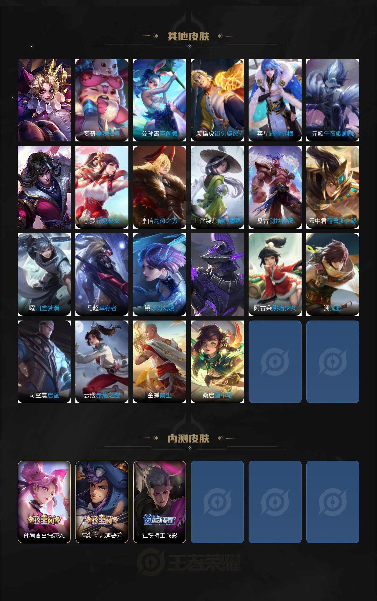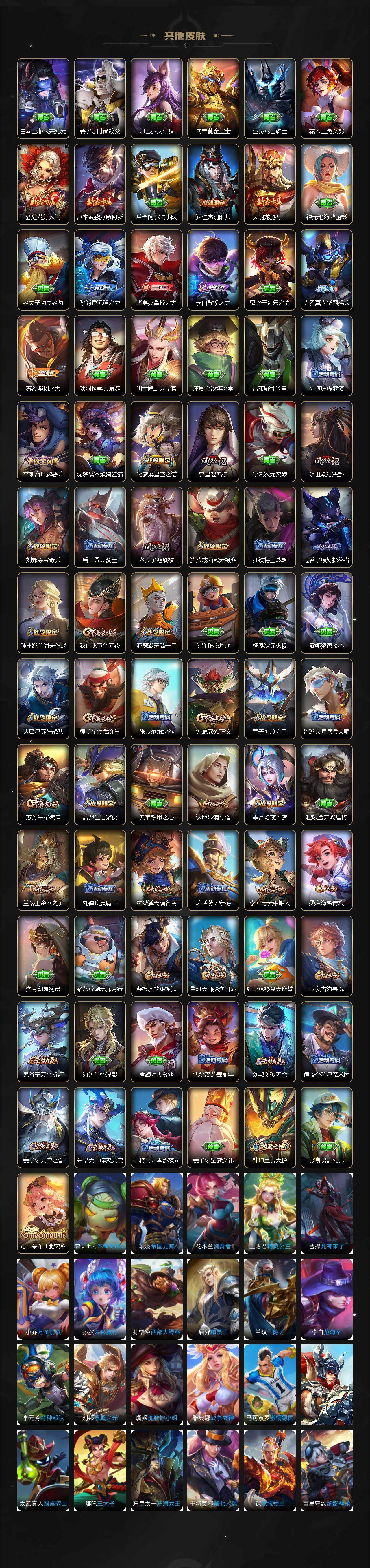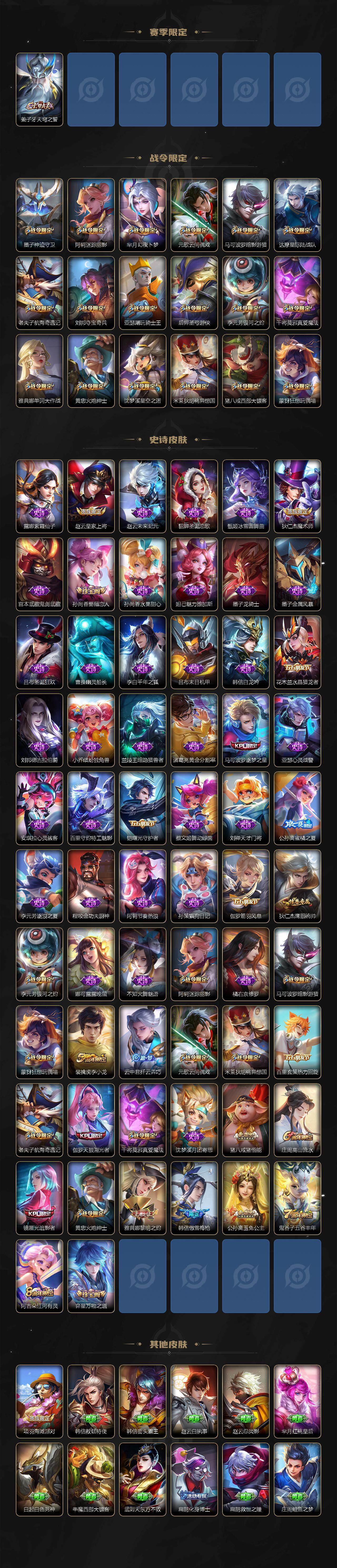 【限定皮肤】:姜子牙天穹之誓,狄仁杰阴阳师,赵云皇家上将,墨子神迹守卫,孙尚香蔷薇恋人,庄周高山流水,高渐离玩趣恶龙,阿轲迷踪丽影,芈月幻夜卜梦,元歌云间偶戏,马可波罗逐梦之星,马可波罗暗影游猎,狄仁杰魔术师,狄仁杰万华元夜,达摩星际陆战队,达摩沙漠行僧,项羽海滩派对,老夫子醍醐杖,老夫子航海奇遇记,程咬金演武夺筹,刘邦夺宝奇兵,韩信傲雪梅枪,兰陵王金庭之子,亚瑟潮玩骑士王,后羿圣弓游侠,李元芳银河之约,李元芳云中旅人,钟馗驱傩正仪,干将莫邪真爱魔法,雅典娜单词大作战,雅典娜黎明之约,太乙真人华丽摇滚,鬼谷子原初探秘者,鬼谷子五谷丰年,黄忠火炮绅士,苏烈千军破阵,弈星混沌棋,公孙离蜜橘之夏,公孙离玉兔公主,沈梦溪星空之诺,沈梦溪大漠名商,明世隐疑决卦,裴擒虎李小龙,裴擒虎擒涛扼浪,米莱狄胡桃异想国,云中君纤云弄巧,李信山海炽霜斩,伽罗天狼溯光者,猪八戒西部大镖客,猪八戒猪悟能,蒙犽狂想玩偶喵,鲁班大师探海日志,镜匿光追影者,桑启海盐诗旅,阿古朵江河有灵,张良古海寻踪,鬼谷子天穹祈灯,沈梦溪龙舞盛年,刘邦剑破天穹,程咬金群星魔术团