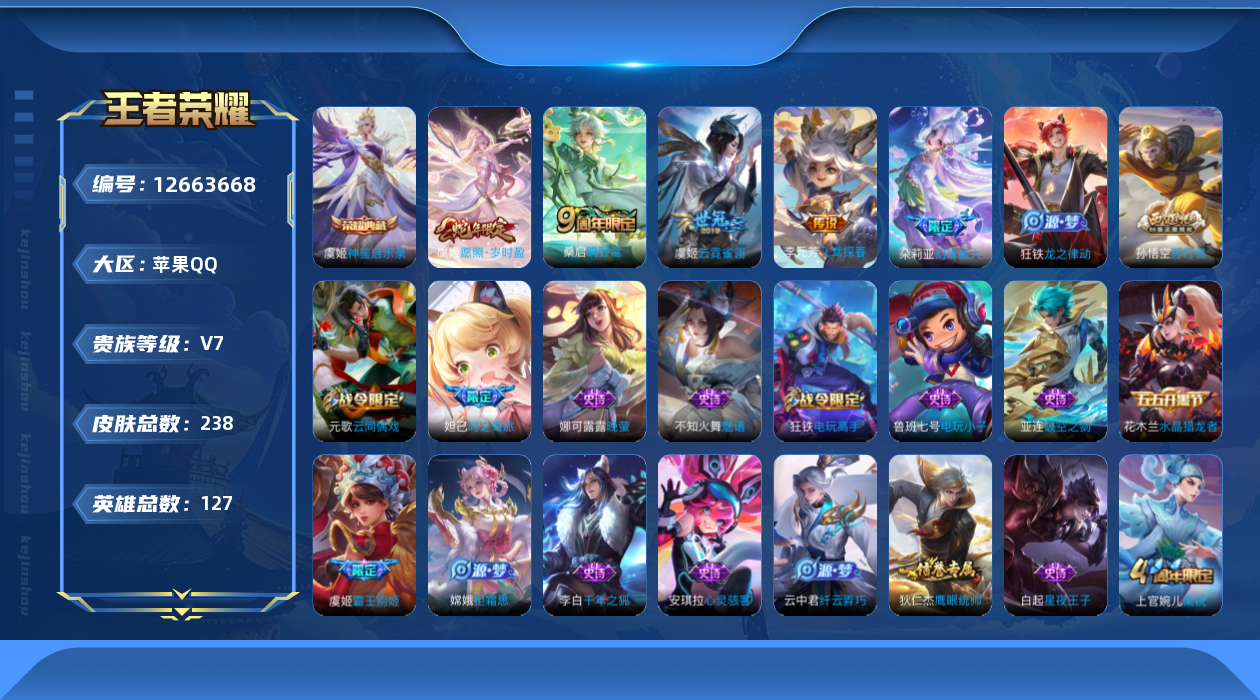 [12663668]苹果Q-V7-永恒钻石IV段位-127英雄-238皮肤-1典藏-4传说-50史诗 【英雄全皮】:孙权全皮,狂铁全皮,空空儿全皮 【荣耀典藏】:虞姬神鉴启示录 【传说皮肤】:虞姬愿照岁时盈,桑启鸣野蒿,李元芳飞鸢探春,虞姬云霓雀翎 【限定皮肤】:白起狰,蔡文姬夏日便利店,虞姬夏日便利店,姜子牙天穹之誓,狄仁杰阴阳师,虞姬凯尔特女王,赵云皇家上将,墨子神迹守卫,妲己时之奇旅,嬴政优雅恋人,庄周蜃楼王,孙膑妖精王,扁鹊炼金王,白起夜都怪侠,芈月幻夜卜梦,元歌云间偶戏,夏侯惇朔风刀,甄姬游园惊梦,甄姬落雪兰心,曹操烛龙,典韦穷奇,狄仁杰魔术师,狄仁杰万华元夜,达摩沙漠行僧,项羽海滩派对,老夫子醍醐杖,程咬金演武夺筹,王昭君午后时光,兰陵王金庭之子,亚瑟潮玩骑士王,孙悟空孙行者,后羿圣弓游侠,李元芳云中旅人,虞姬霸王别姬,钟馗驱傩正仪,干将莫邪真爱魔法,雅典娜黎明之约,太乙真人饕餮,鬼谷子原初探秘者,黄忠火炮绅士,苏烈千军破阵,百里玄策原初追逐者,弈星混沌棋,梦奇顽趣,沈梦溪大漠名商,明世隐疑决卦,明世隐吟游魔法,裴擒虎擒涛扼浪,狂铁御狮,狂铁电玩高手,云中君纤云弄巧,盾山御銮,上官婉儿梁祝,嫦娥拒霜思,桑启海盐诗旅,阿古朵江河有灵,张良古海寻踪,蒙恬荣光圣徽,鬼谷子天穹祈灯,刘邦剑破天穹,镜青焰无极,项羽苍威无极,刘备异域游侠,周瑜熔金海岸 【赛季限定】:庄周蜃楼王,孙膑妖精王,扁鹊炼金王,白起狰,夏侯惇朔风刀,曹操烛龙,典韦穷奇,狄仁杰万华元夜,达摩沙漠行僧,老夫子醍醐杖,程咬金演武夺筹,兰陵王金庭之子,张良古海寻踪,李元芳云中旅人,虞姬凯尔特女王,钟馗驱傩正仪,雅典娜黎明之约,太乙真人饕餮,鬼谷子原初探秘者,苏烈千军破阵,百里玄策原初追逐者,弈星混沌棋,梦奇顽趣,沈梦溪大漠名商,明世隐疑决卦,裴擒虎擒涛扼浪,狂铁御狮,盾山御銮,桑启海盐诗旅,鬼谷子天穹祈灯,蒙恬荣光圣徽,刘邦剑破天穹,姜子牙天穹之誓 【战令限定】:墨子神迹守卫,蔡文姬夏日便利店,虞姬夏日便利店,白起夜都怪侠,芈月幻夜卜梦,元歌云间偶戏,甄姬落雪兰心,王昭君午后时光,亚瑟潮玩骑士王,后羿圣弓游侠,干将莫邪真爱魔法,黄忠火炮绅士,明世隐吟游魔法,狂铁电玩高手,镜青焰无极,项羽苍威无极 【史诗皮肤】:鲁班七号电玩小子,赵云皇家上将,赵云未来纪元,王昭君偶像歌手,狄仁杰魔术师,宫本武藏鬼剑武藏,孙尚香水果甜心