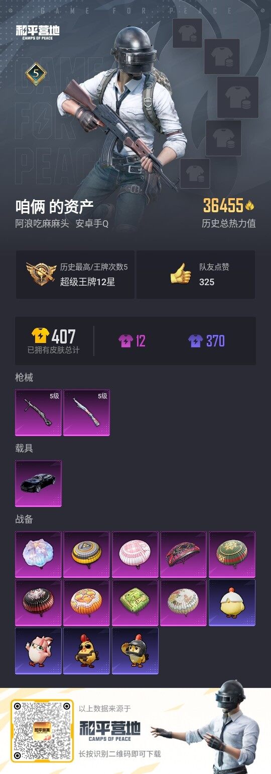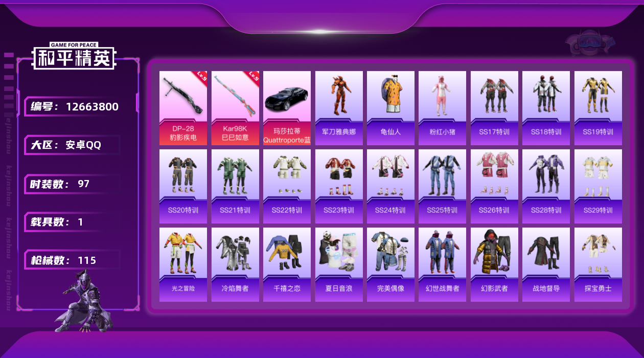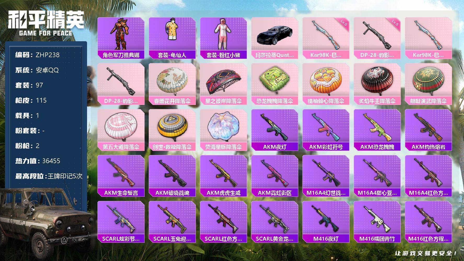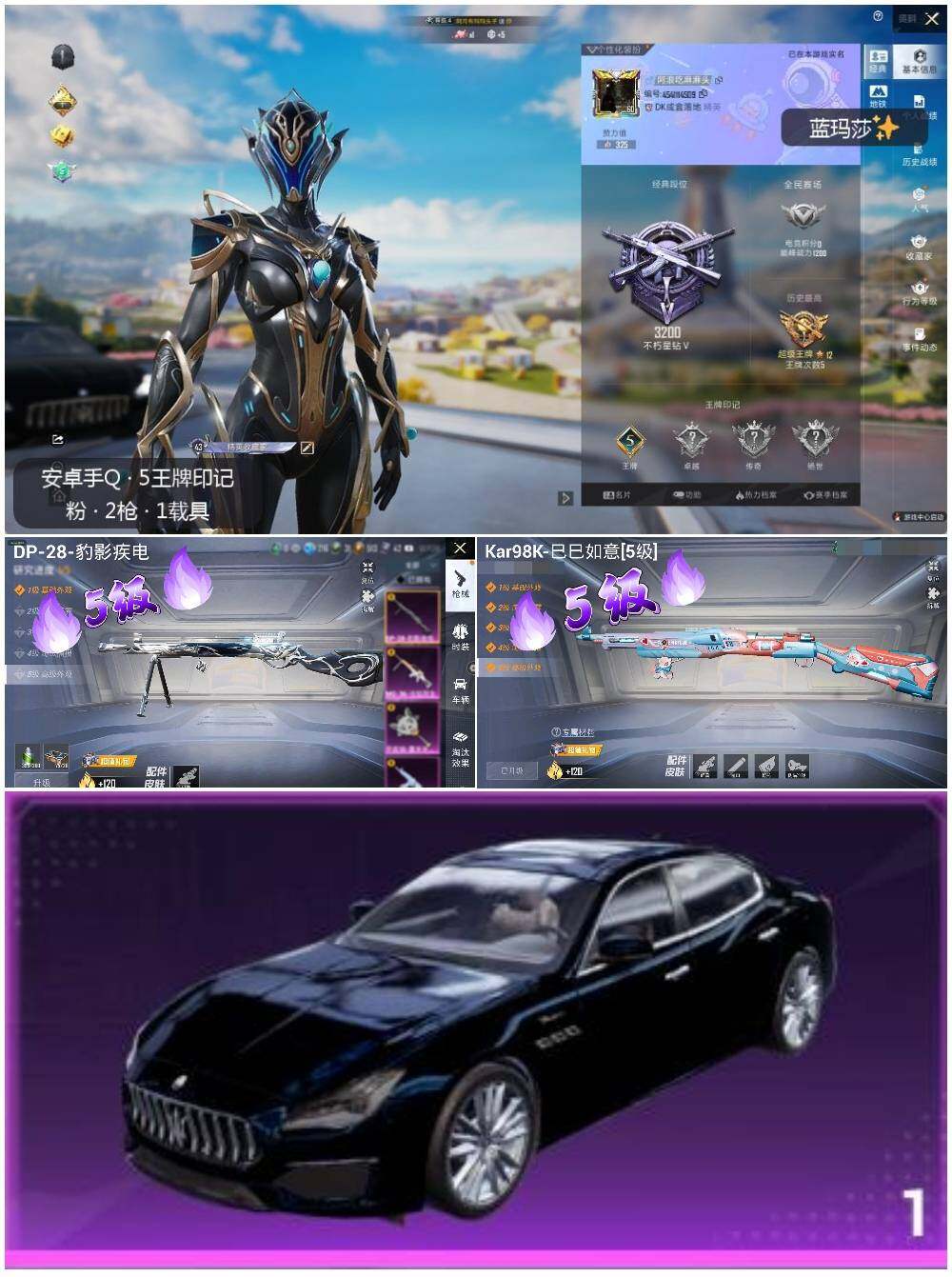 [12663800]安卓 手Q-2特效枪-1载具-3.6w热力值-5王牌印记-97套装-115枪皮【热门品类】:角色-军刀雅典娜,套装-龟仙人,套装-粉红小猪【粉色载具】:玛莎拉蒂Quattroporte(夜幕蓝)【粉色枪皮等级】:Kar98K-巳巳如意(五级),DP-28-豹影疾电(五级)