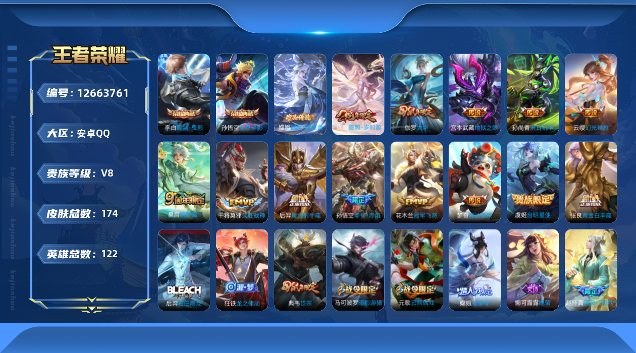 [12663761]安卓Q-V8-至尊星耀V段位-122英雄-174皮肤-2典藏-0珍品无双-0无双-1珍品传说-13传说-47史诗