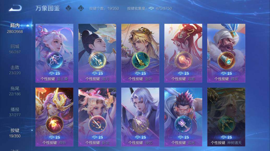 伽罗箭羽风息,李元芳逐浪之夏,不知火舞魅语,孙策猫狗日记,阿轲节奏热浪,王昭君偶像歌手,孙尚香时之恋人,阿轲暗夜猫娘,吕布末日机甲,嬴政摇滚巨星,刘禅绅士熊喵,刘禅天才门将,白起星夜王子,宫本武藏鬼剑武藏,蔡文姬舞动绿茵,廉颇地狱岩魂,小乔缤纷独角兽,夏侯惇乘风破浪,墨子金属风暴,貂蝉圣诞恋歌,百里守约特工魅影,嫦娥拒霜思,艾琳奇遇舞章,蒙犽百解令,桑启奇遇星旅,李白谪仙醉月,赵怀真器灵·浮梦炉