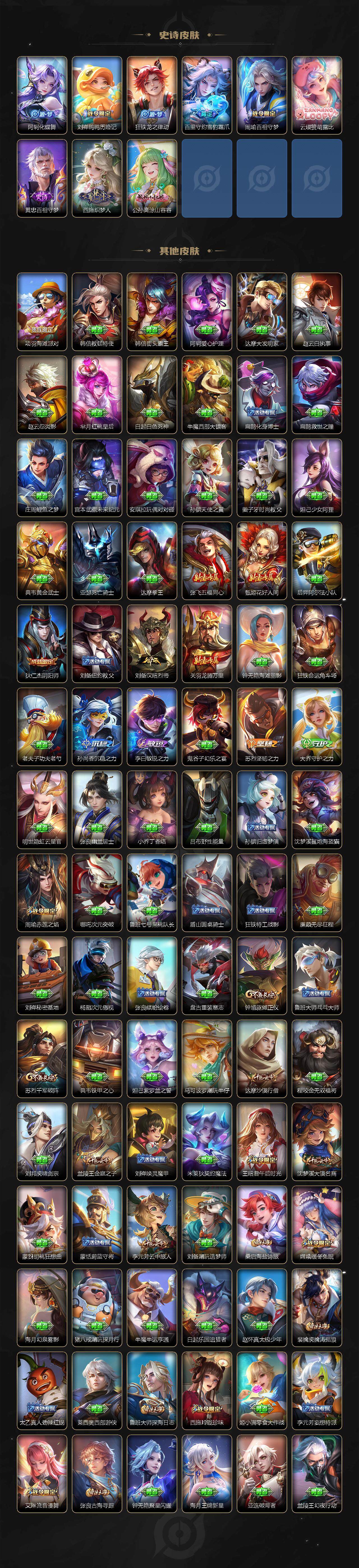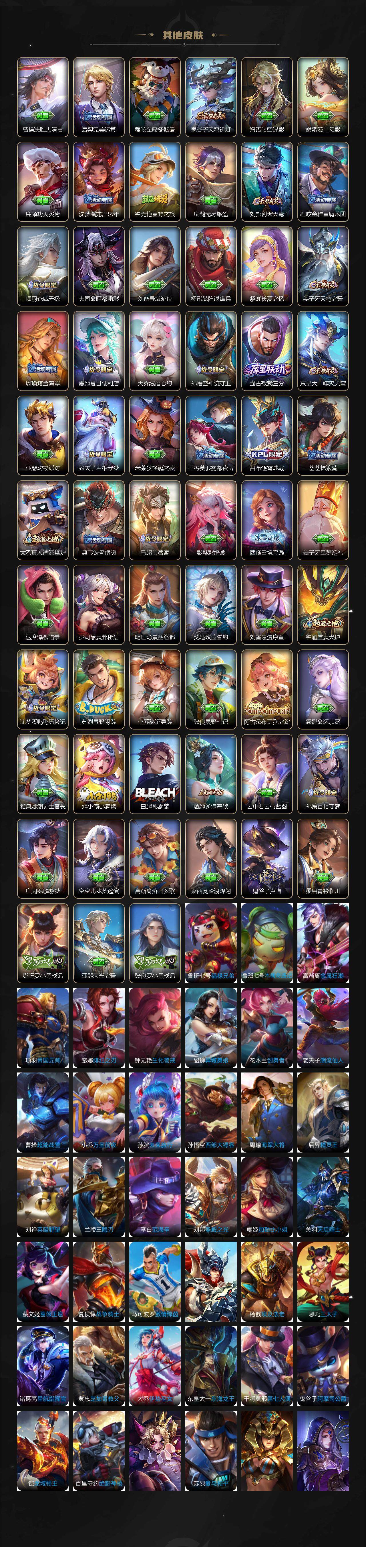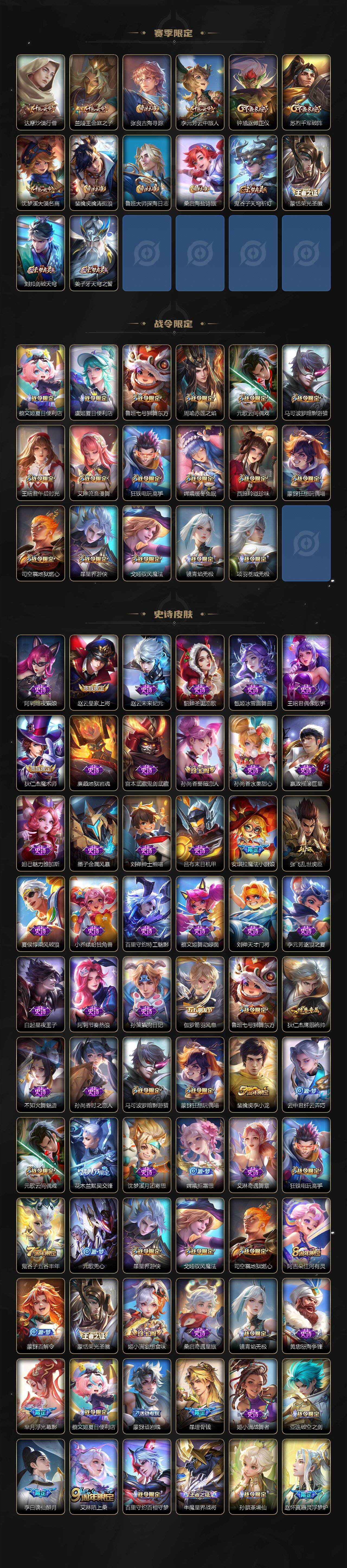 【限定皮肤】:暃埋骨钱,蒙犽顽岩魄,蔡文姬夏日便利店,大乔绒语心约,虞姬夏日便利店,姜子牙天穹之誓,杨戬破阵退雄兵,李白谪仙醉月,狄仁杰阴阳师,赵云皇家上将,孙尚香蔷薇恋人,鲁班七号狮舞东方,鲁班七号寅虎瑞焰,周瑜赤莲之焰,元歌云间偶戏,元歌无心,马可波罗暗影游猎,狄仁杰魔术师,达摩沙漠行僧,项羽海滩派对,安琪拉魔法小厨娘,王昭君午后时光,兰陵王金庭之子,花木兰默契交锋,孙悟空零号赤焰,李元芳云中旅人,虞姬启明星使,钟馗驱傩正仪,鬼谷子五谷丰年,苏烈千军破阵,沈梦溪大漠名商,裴擒虎李小龙,裴擒虎擒涛扼浪,狂铁电玩高手,云中君纤云弄巧,嫦娥拒霜思,嫦娥暖冬兔眠,西施玲珑珍味,蒙犽狂想玩偶喵,鲁班大师探海日志,桑启海盐诗旅,夏洛特浮生妄,暃星界游侠,戈娅驭风魔法,艾琳流音漫舞,司空震地狱燃心,阿古朵江河有灵,张良古海寻踪,蒙犽百解令,蒙恬荣光圣徽,鬼谷子天穹祈灯,姬小满妄想食味,沈梦溪龙舞盛年,刘邦剑破天穹,程咬金群星魔术团,镜青焰无极,项羽苍威无极,刘备异域游侠,芈月浮光幕影,周瑜熔金海岸