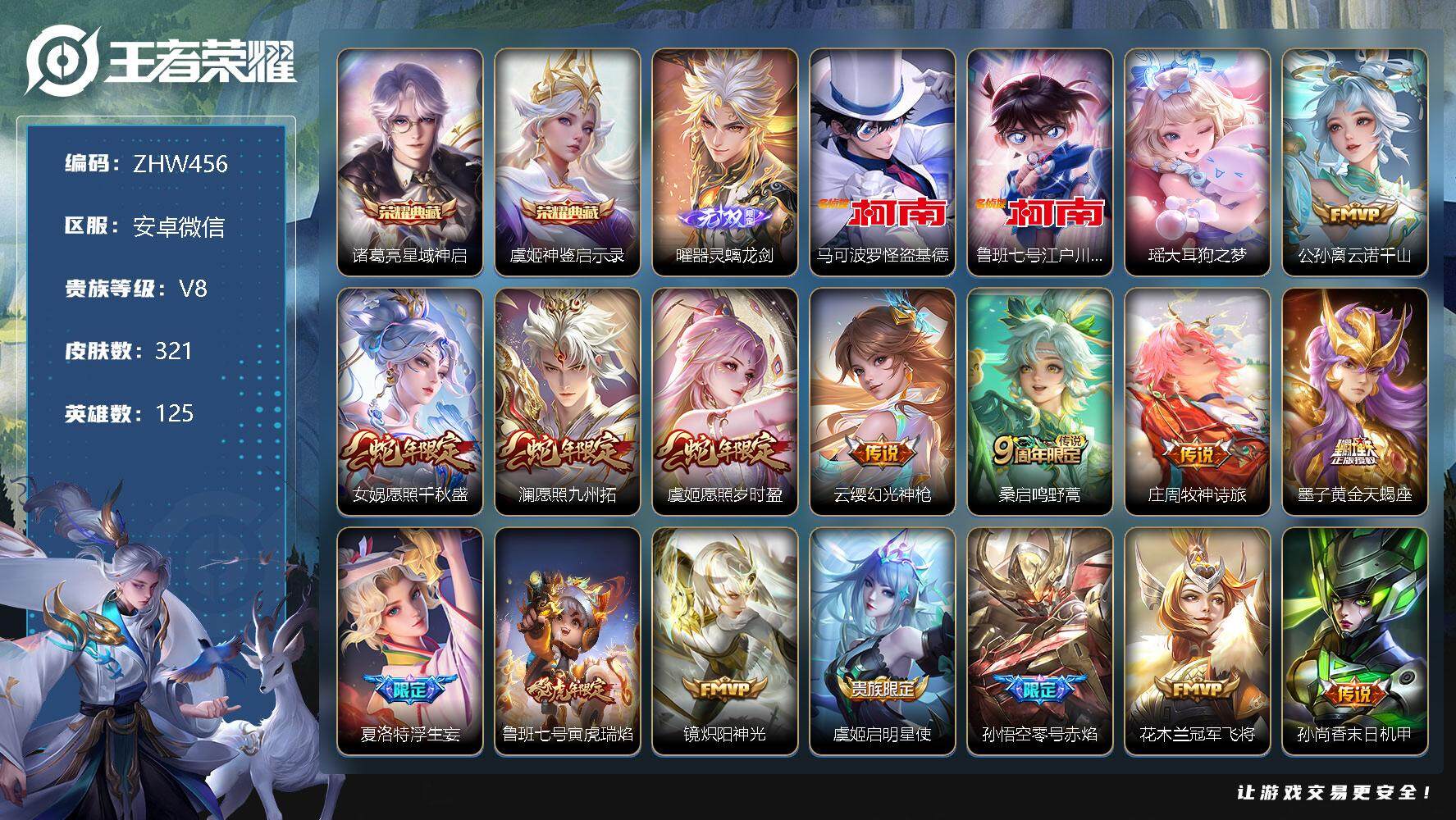 [12665885]安卓WX-V8-最强王者段位-125英雄-321皮肤-2典藏-0珍品无双-1无双-3珍品传说-16传说-75史诗 【英雄全皮】:蒙恬全皮,桑启全皮,空空儿全皮,影全皮 【荣耀典藏】:诸葛亮星域神启,虞姬神鉴启示录 【无双皮肤】:曜器灵螭龙剑 【珍品传说】:马可波罗怪盗基德,鲁班七号江户川柯南,瑶大耳狗之梦 【传说皮肤】:公孙离云诺千山,女娲愿照千秋盛,澜愿照九州拓,虞姬愿照岁时盈,云缨幻光神枪,桑启鸣野蒿,庄周牧神诗旅,墨子黄金天蝎座,夏洛特浮生妄,鲁班七号寅虎瑞焰,镜炽阳神光,虞姬启明星使,孙悟空零号赤焰,花木兰冠军飞将,孙尚香末日机甲,宫本武藏地狱之眼 【限定皮肤】:暃埋骨钱,蒙犽顽岩魄,蔡文姬夏日便利店,大乔绒语心约,虞姬夏日便利店,姜子牙天穹之誓,杨戬破阵退雄兵,李白谪仙醉月,狄仁杰阴阳师,赵云皇家上将,孙尚香蔷薇恋人,鲁班七号狮舞东方,鲁班七号寅虎瑞焰,周瑜赤莲之焰,元歌云间偶戏,元歌无心,马可波罗暗影游猎,狄仁杰魔术师,达摩沙漠行僧,项羽海滩派对,安琪拉魔法小厨娘,王昭君午后时光,兰陵王金庭之子,花木兰默契交锋,孙悟空零号赤焰,李元芳云中旅人,虞姬启明星使,钟馗驱傩正仪,鬼谷子五谷丰年,苏烈千军破阵,沈梦溪大漠名商,裴擒虎李小龙,裴擒虎擒涛扼浪,狂铁电玩高手,云中君纤云弄巧,嫦娥拒霜思,嫦娥暖冬兔眠,西施玲珑珍味,蒙犽狂想玩偶喵,鲁班大师探海日志,桑启海盐诗旅,夏洛特浮生妄,暃星界游侠,戈娅驭风魔法,艾琳流音漫舞,司空震地狱燃心,阿古朵江河有灵,张良古海寻踪,蒙犽百解令,蒙恬荣光圣徽,鬼谷子天穹祈灯,姬小满妄想食味,沈梦溪龙舞盛年,刘邦剑破天穹,程咬金群星魔术团,镜青焰无极,项羽苍威无极,刘备异域游侠,芈月浮光幕影,周瑜熔金海岸 【年限皮肤】:鲁班七号寅虎瑞焰 【赛季限定】:达摩沙漠行僧,兰陵王金庭之子,张良古海寻踪,李元芳云中旅人,钟馗驱傩正仪,苏烈千军破阵,沈梦溪大漠名商,裴擒虎擒涛扼浪,鲁班大师探海日志,桑启海盐诗旅,鬼谷子天穹祈灯,蒙恬荣光圣徽,刘邦剑破天穹,姜子牙天穹之誓 【战令限定】:蔡文姬夏日便利店,虞姬夏日便利店,鲁班七号狮舞东方,周瑜赤莲之焰,元歌云间偶戏,马可波罗暗影游猎,王昭君午后时光,艾琳流音漫舞,狂铁电玩高手,嫦娥暖冬兔眠,西施玲珑珍味,蒙犽狂想玩偶喵,司空震地狱燃心,暃星界游侠,戈娅驭风魔法,镜青焰无极,项羽苍威无极 【史诗
