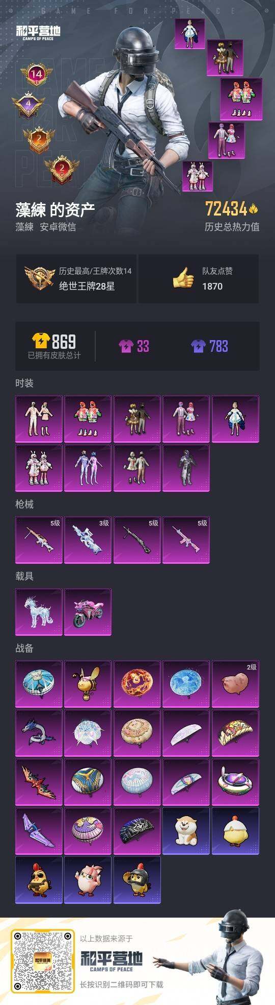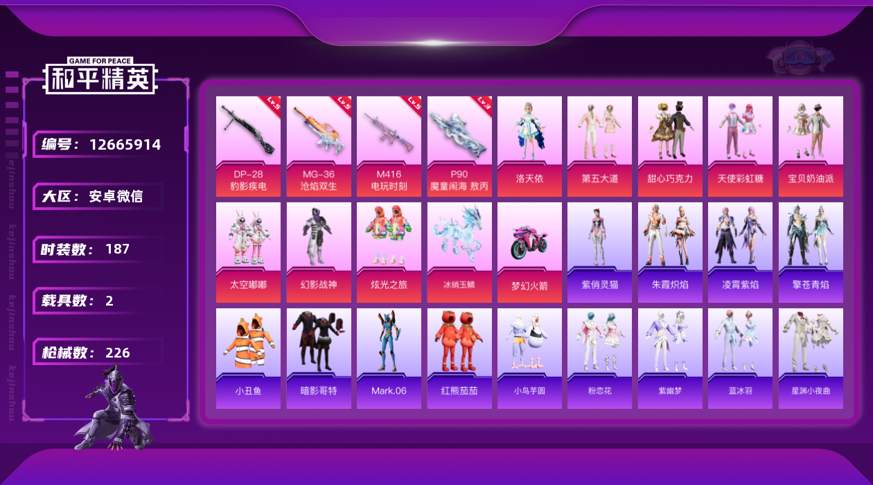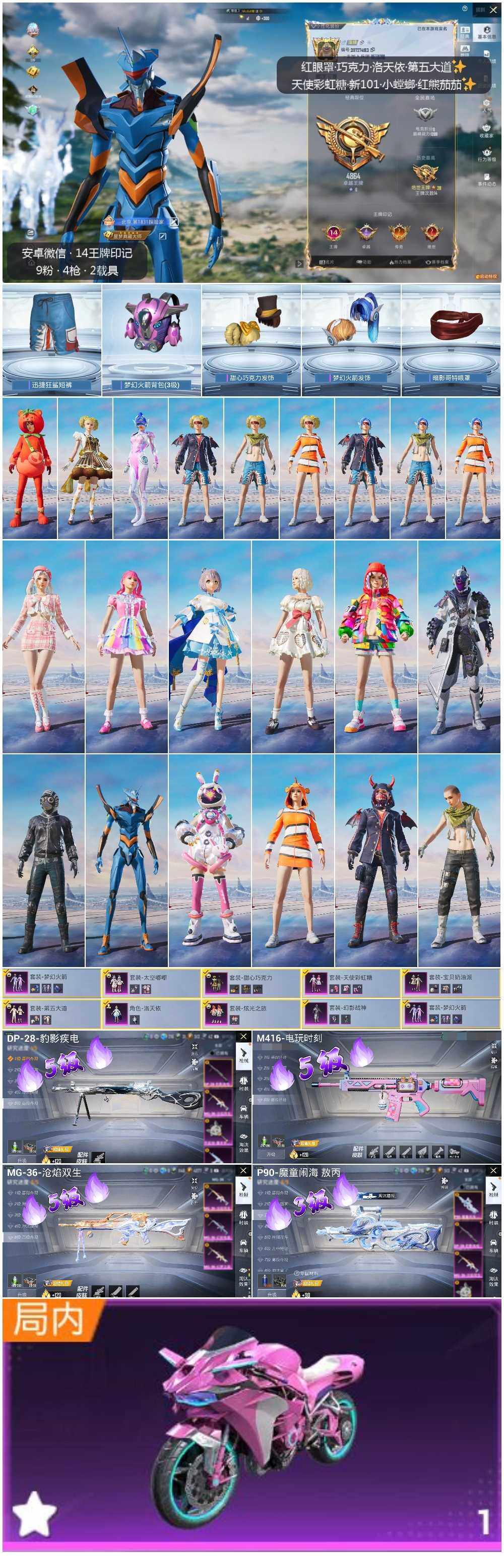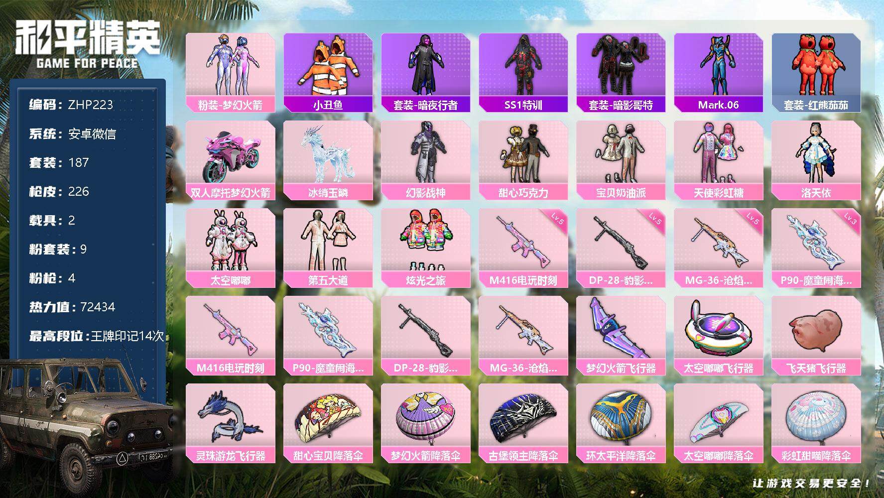 [12665914]素材身法号 安卓 微信-9粉装-4特效枪-2载具-6粉色飞行器-7.2w热力值-14王牌印记-187套装-226枪皮【热门品类】:粉装-梦幻火箭,套装-小丑鱼,套装-暗夜行者,套装-SS1特训,套装-暗影哥特,角色-Mark.06,套装-红熊茄茄【粉色载具】:双人摩托-梦幻火箭,冰绡玉鳞【粉色套装】:粉装-幻影战神,粉装-甜心巧克力,粉装-宝贝奶油派,粉装-天使彩虹糖,粉装-梦幻火箭,角色-洛天依,粉装-太空嘟嘟,粉装-第五大道,粉装-炫光之旅【粉色枪皮等级】:M416-电玩时刻(五级),P90-魔童闹海 敖丙(三级),DP-28-豹影疾电(五级),MG-36-沧焰双生(五级)【粉色飞行器】:梦幻火箭飞行器,太空嘟嘟飞行器,飞天猪飞行器,灵珠游龙飞行器