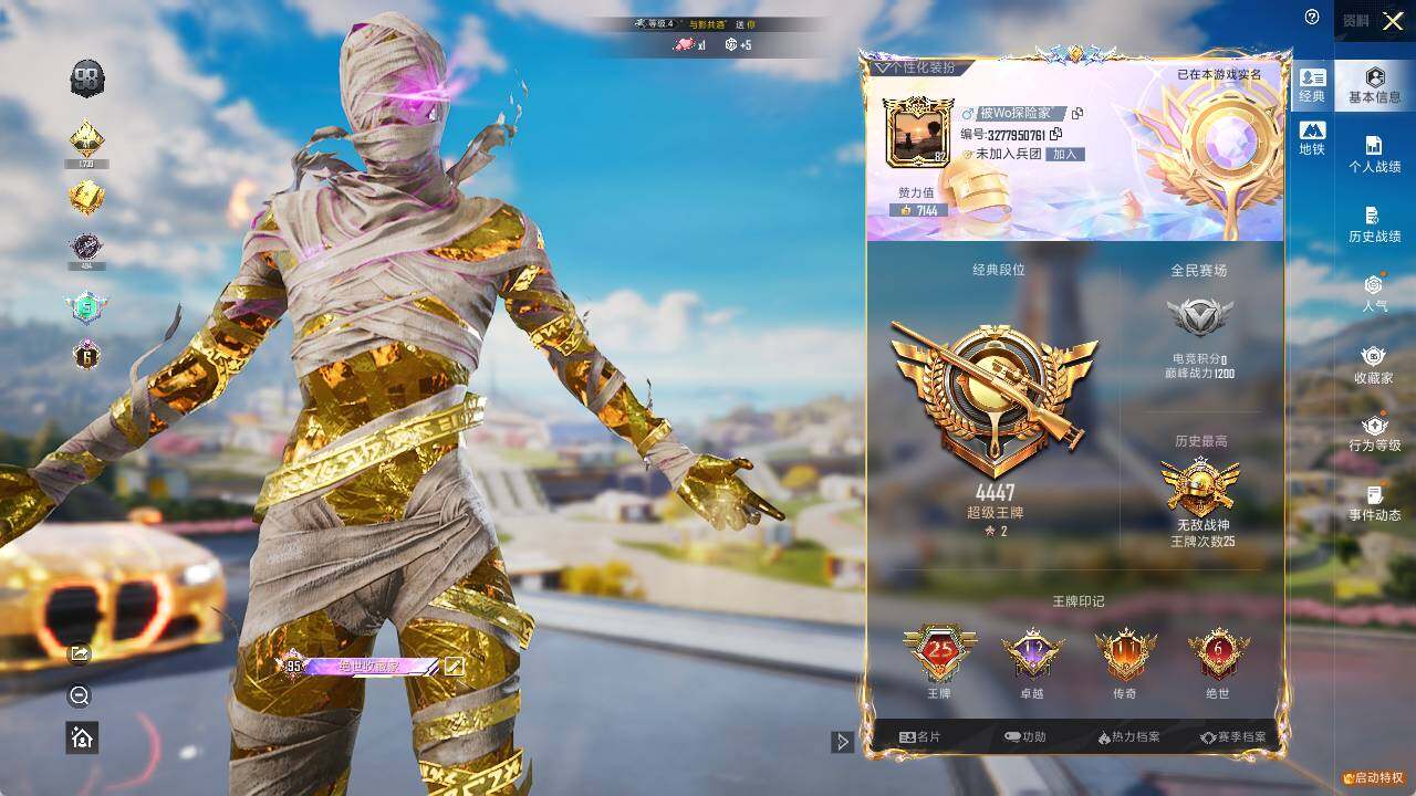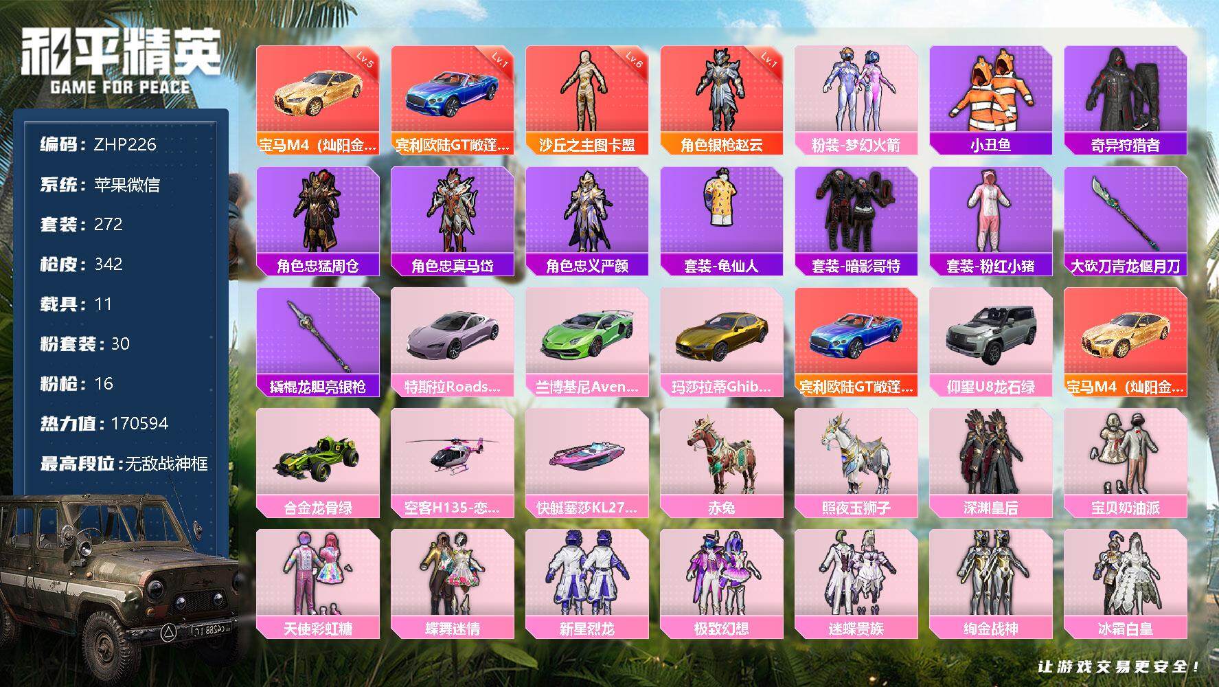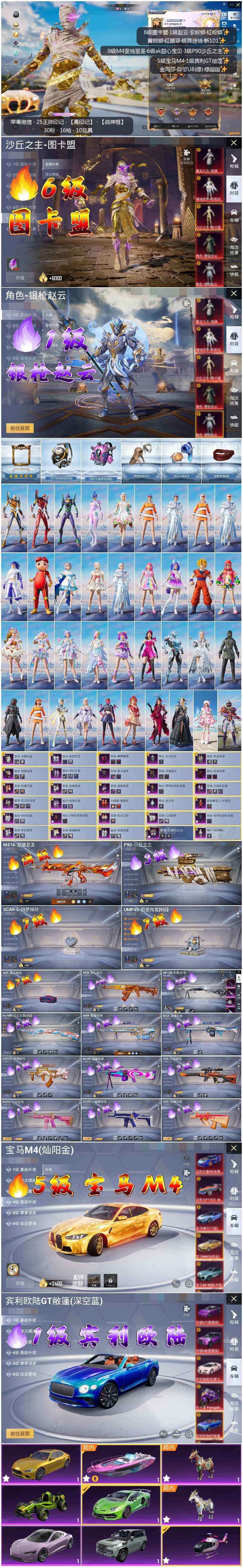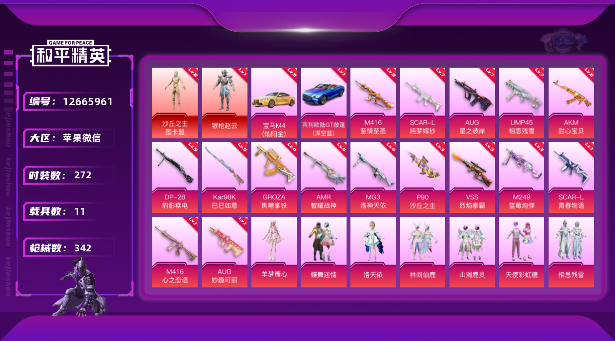 [12665961]素材身法号/沙丘之主-图卡盟(六级)/宝马M4(灿阳金)(五级)/无敌战神框1/绝世印记6 /地铁满天赋/M416-至情至圣(九级) 苹果 微信-无敌战神框-2神装-30粉装-16特效枪-11载具-10粉色飞行器-17w热力值-25王牌印记-272套装-342枪皮【红色载具】:宾利欧陆GT敞篷(深空蓝)(一级),宝马M4(灿阳金)(五级)【红色神装等级】:沙丘之主-图卡盟(六级),角色-银枪赵云(一级)【热门品类】:粉装-梦幻火箭,套装-小丑鱼,套装-奇异狩猎者,角色-忠猛周仓,角色-忠真马岱,角色-忠义严颜,套装-龟仙人,套装-暗影哥特,套装-粉红小猪,大砍刀-青龙偃月刀,撬棍-龙胆亮银枪【粉色载具】:特斯拉Roadster(沁心粉),兰博基尼Aventador SVJ(翡翠绿),玛莎拉蒂Ghibli(金),宾利欧陆GT敞篷(深空蓝),仰望U8(龙石绿),宝马M4(灿阳金),合金龙骨(绿),空客H135-恋语之翼,快艇-塞莎KL27(霓虹粉),赤兔,照夜玉狮子【粉色套装】:粉装-深渊皇后,粉装-宝贝奶油派,粉装-天使彩虹糖,粉装-蝶舞迷情,粉装-梦幻火箭,粉装-新星烈龙,粉装-极致幻想,粉装-迷蝶贵族,粉装-绚金战神,粉装-冰霜白皇,粉装-王牌四分卫,粉装-星之彼岸,粉装-相思残雪,粉装-枪炮玫瑰,粉装-蝶舞蔷薇,粉装-林间仙鹿,粉装-彩虹鹿灵,粉装-山涧鹿灵,角色-洛天依,角色-零号机款机体服,角色-初号机款机体服,角色-2号机款机体服,粉装-蓝莓炮弹,粉装-焦糖拿铁,粉装-妙趣可丽,超级赛亚人-孙悟空,粉装-炫光之旅,角色-冰炎战车,玩偶服-猪猪侠,角色-羊梦糖心【粉色枪皮等级】:AKM-甜心宝贝(六级),SCAR-L-青春物语(一级),SCAR-L-纯梦嫁纱(七级),M416-心之恋语(一级),M416-至情至圣(九级),GROZA-焦糖拿铁(四级),AUG-星之彼岸(七级),AUG-妙趣可丽(一级),UMP45-相思残雪(七级),P90-沙丘之主(三级),Kar98K-巳巳如意(五级),VSS-烈焰拳霸(三级),AMR-智耀战神(四级),M249-蓝莓炮弹(三级),DP-28-豹影疾电(五级),MG3-洛神天依(四级)【粉色飞行器】:春暖花开飞行器,古堡领主飞行器,童趣迷兔飞行器,星之彼岸飞行器,相思残雪飞行器,焦糖拿铁飞行器,歌者泠鸢飞行器,全功率超战