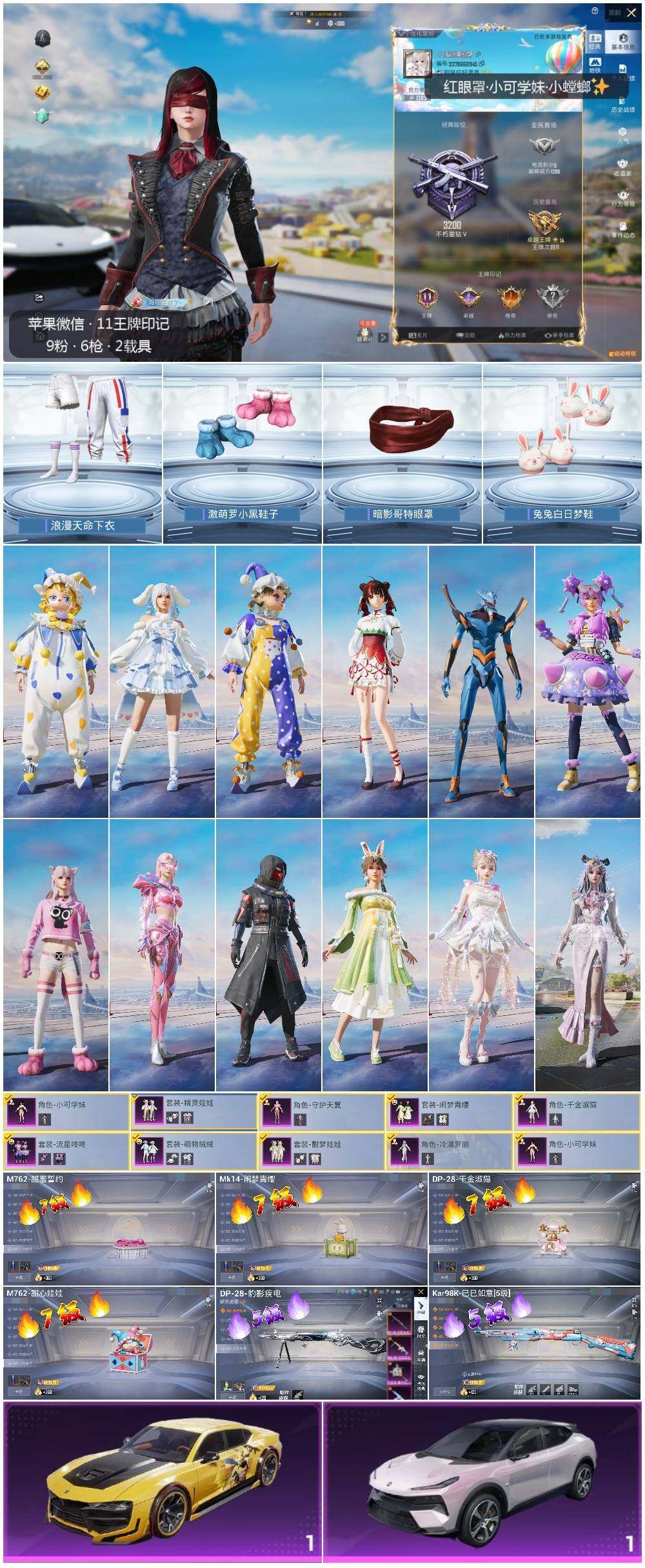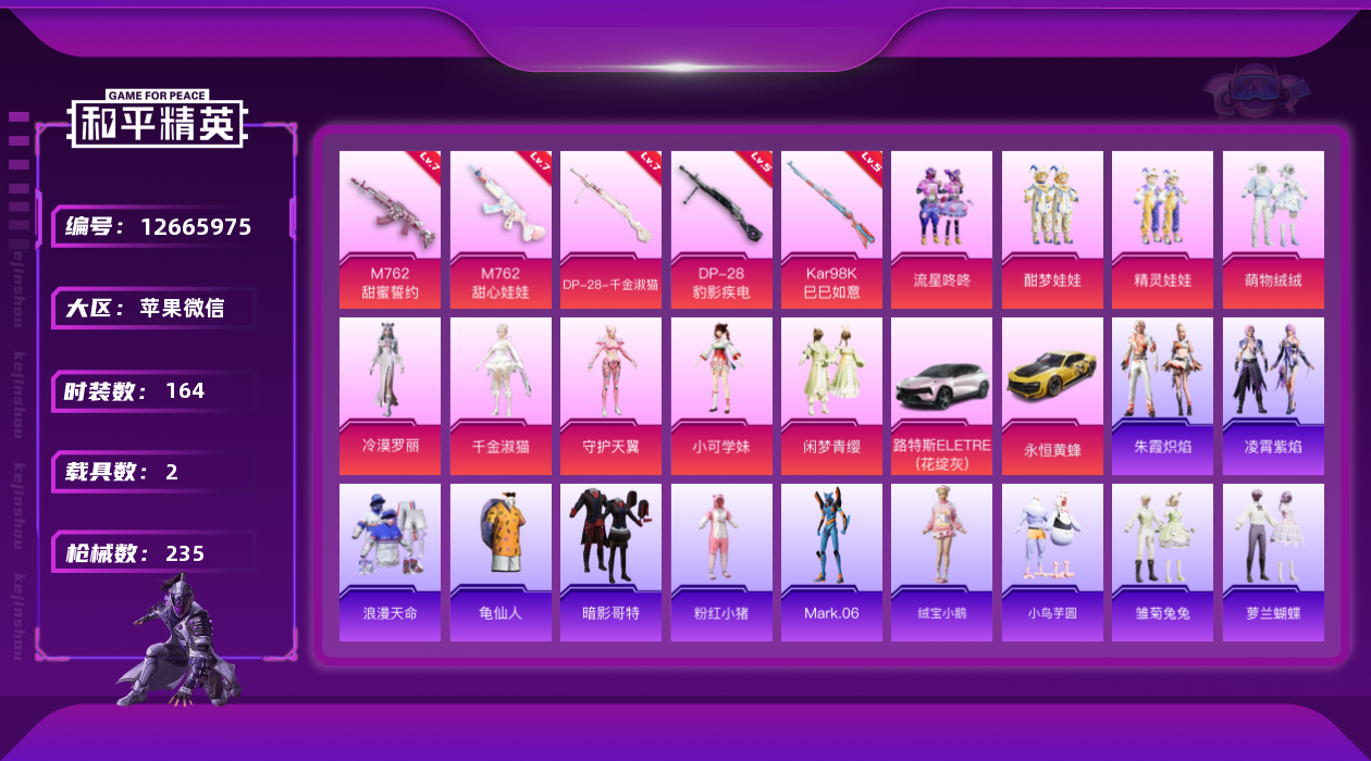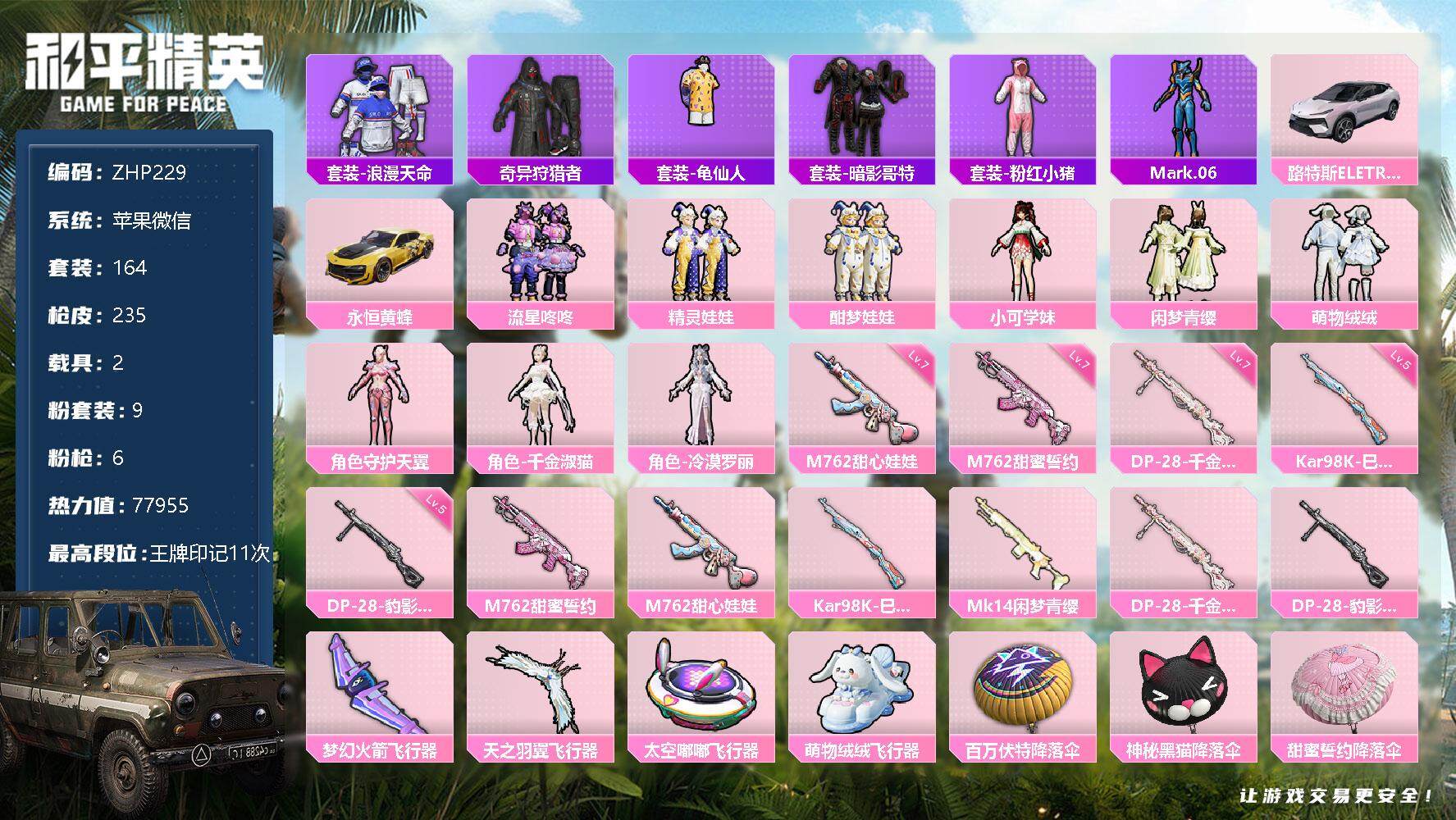 [12665975]素材身法号/地铁满天赋 苹果 微信-9粉装-6特效枪-2载具-4粉色飞行器-7.7w热力值-11王牌印记-164套装-235枪皮【热门品类】:套装-浪漫天命,套装-奇异狩猎者,套装-龟仙人,套装-暗影哥特,套装-粉红小猪,角色-Mark.06【粉色载具】:路特斯ELETRE(花绽灰),永恒黄蜂【粉色套装】:粉装-流星咚咚,粉装-精灵娃娃,粉装-酣梦娃娃,角色-小可学妹,粉装-闲梦青缨,粉装-萌物绒绒,角色-守护天翼,角色-千金淑猫,角色-冷漠罗丽【粉色枪皮等级】:M762-甜蜜誓约(七级),M762-甜心娃娃(七级),Kar98K-巳巳如意(五级),DP-28-千金淑猫(七级),DP-28-豹影疾电(五级)【粉色飞行器】:梦幻火箭飞行器,天之羽翼飞行器,太空嘟嘟飞行器,萌物绒绒飞行器