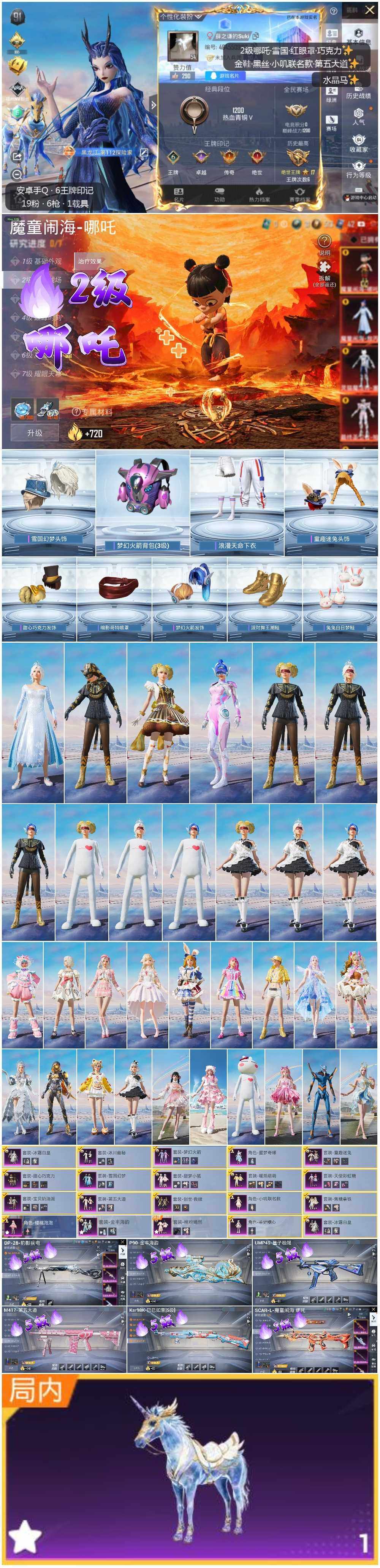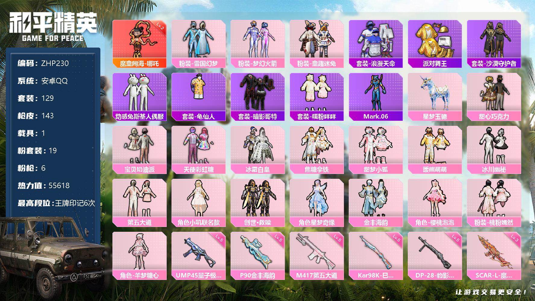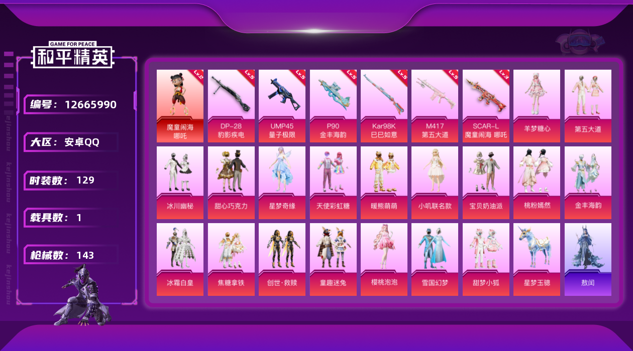 [12665990]哪吒!雪国!安卓 手Q-1神装-19粉装-6特效枪-1载具-6粉色飞行器-55618热力值-6王牌印记-129套装-143枪皮