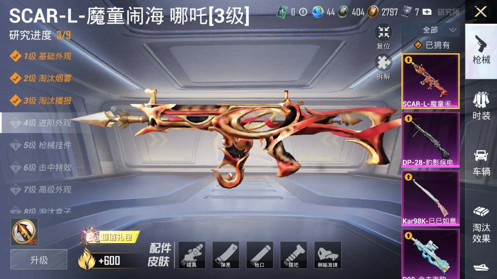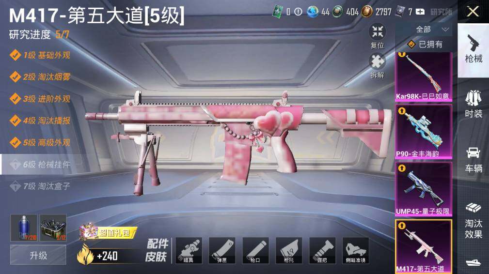 【粉色枪皮等级】:SCAR-L-魔童闹海 哪吒(三级),UMP45-量子极限(五级),P90-金丰海韵(五级),Kar98K-巳巳如意(五级),M417-第五大道(五级),DP-28-豹影疾电(五级)